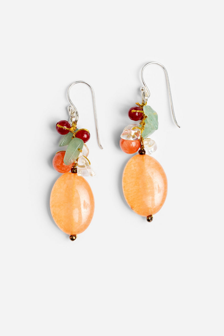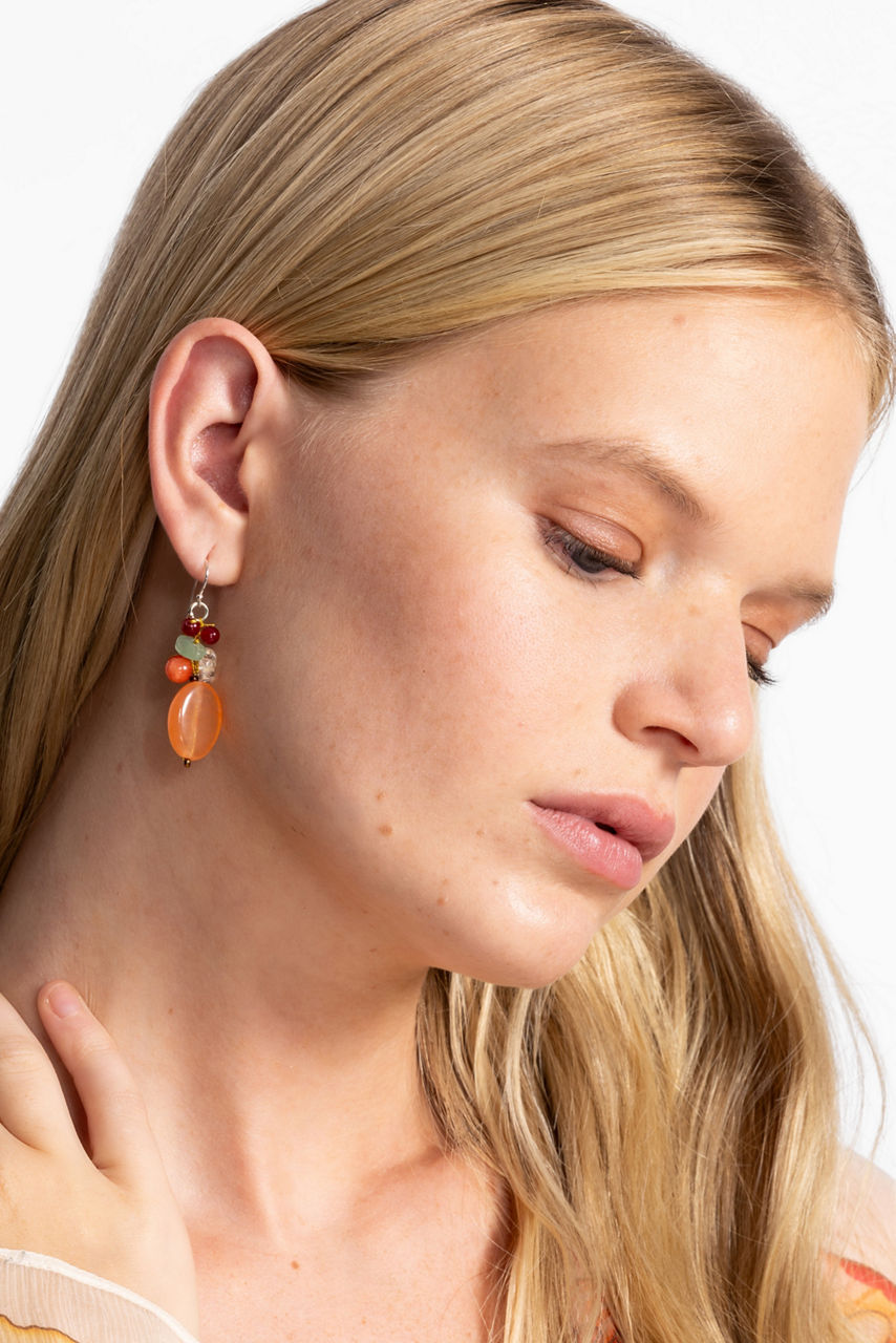 The Exotic Orange Cluster Earrings feature a blend of natural stones and elegant metals, making them a versatile accessory for any wardrobe. Style these earrings with loose waves and a flowing dress for a relaxed boho look, or pair them with sleek hair and a black blouse for an evening-ready vibe.