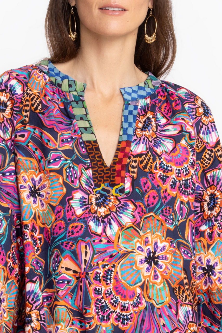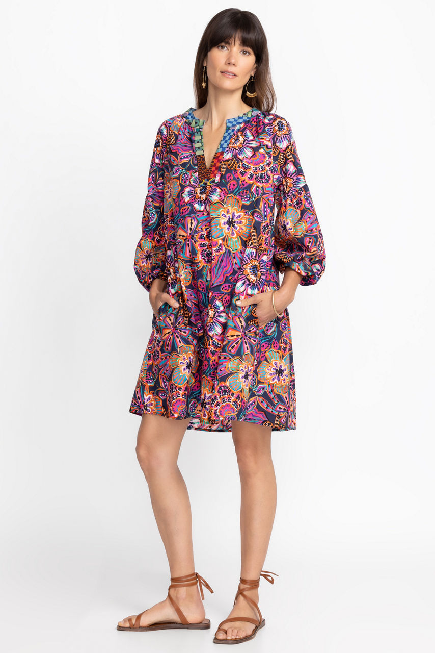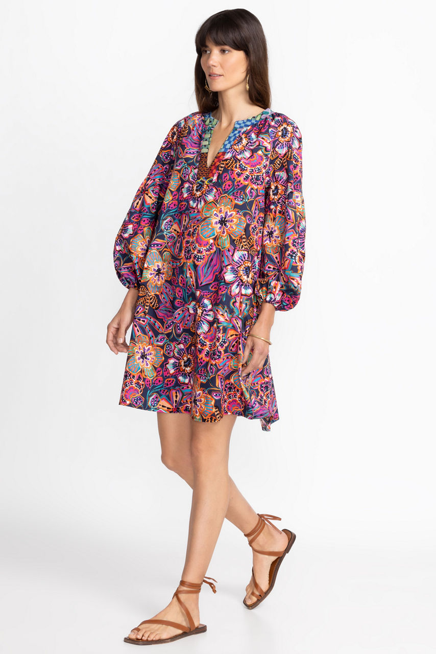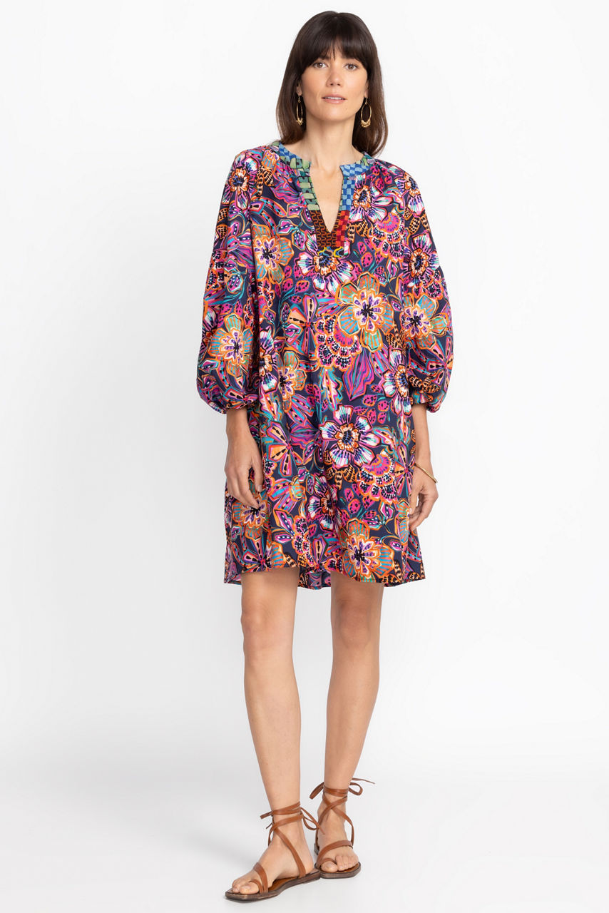 Displaying vibrant color in a modern feminine silhouette, the Eyes on You Poplin Dress is a study in artistic expression. Featuring an open neckline and breezy tiered A-line frame, this 100% cotton dress is the perfect choice for the warmest days of the season. Pair with leather sandals and a playful sunhat for a fabulous weekend combination.