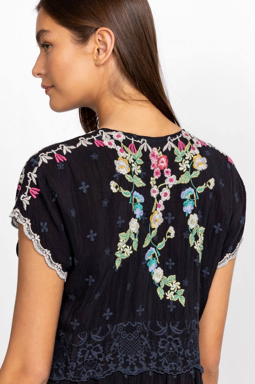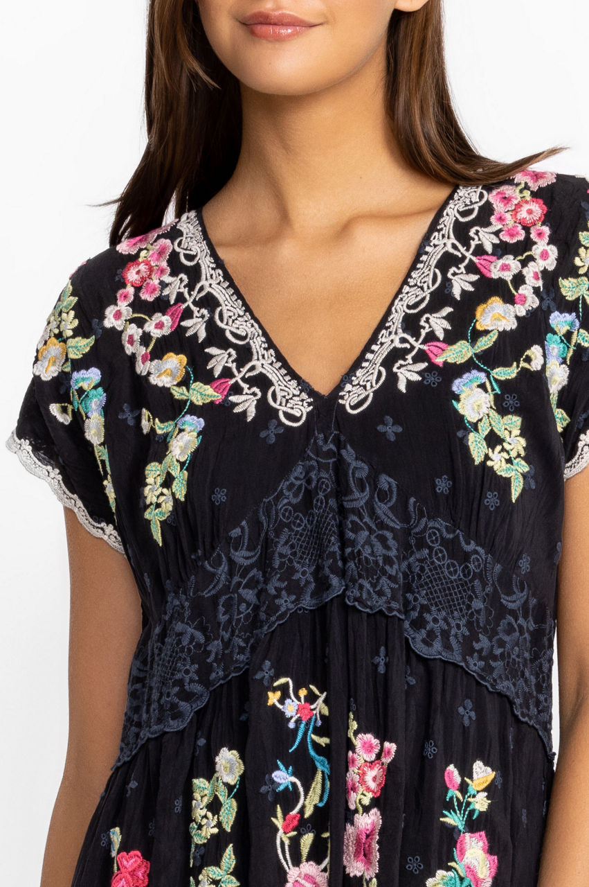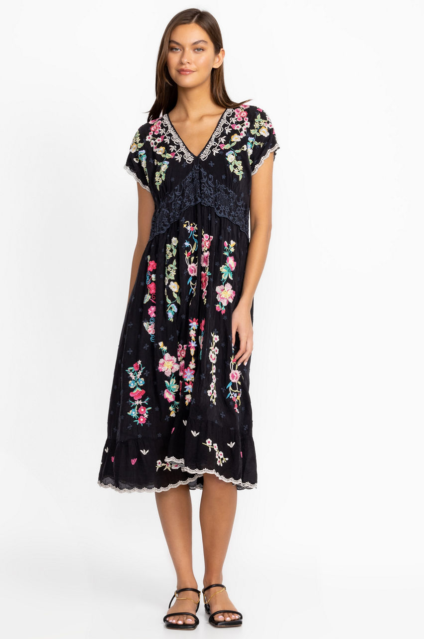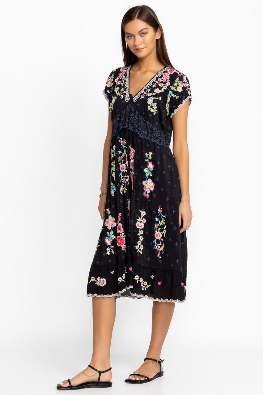 Emanating a feminine vibe, the Ezra Dress is a timeless must-have for brighter days. Enhanced by a floral placement embroidery, this dress features a V-neck, short sleeves, a removable slip, and a scallop embroidered hem and sleeves for an artistic touch. Finish off the look with simple leather sandals for a versatile daytime outfit.
