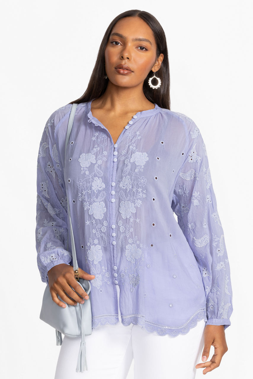 Crafted from a lightweight flowing fabric, the Falco Tunic is intricately embellished with embroidery. Featuring a button-front with gathers at the neckline, this blouse is cut with eyelet Bishop sleeves and finished with a decorative scalloped hemline. Pair with palazzo pants and kitten heels for an unforgettable daytime ensemble.