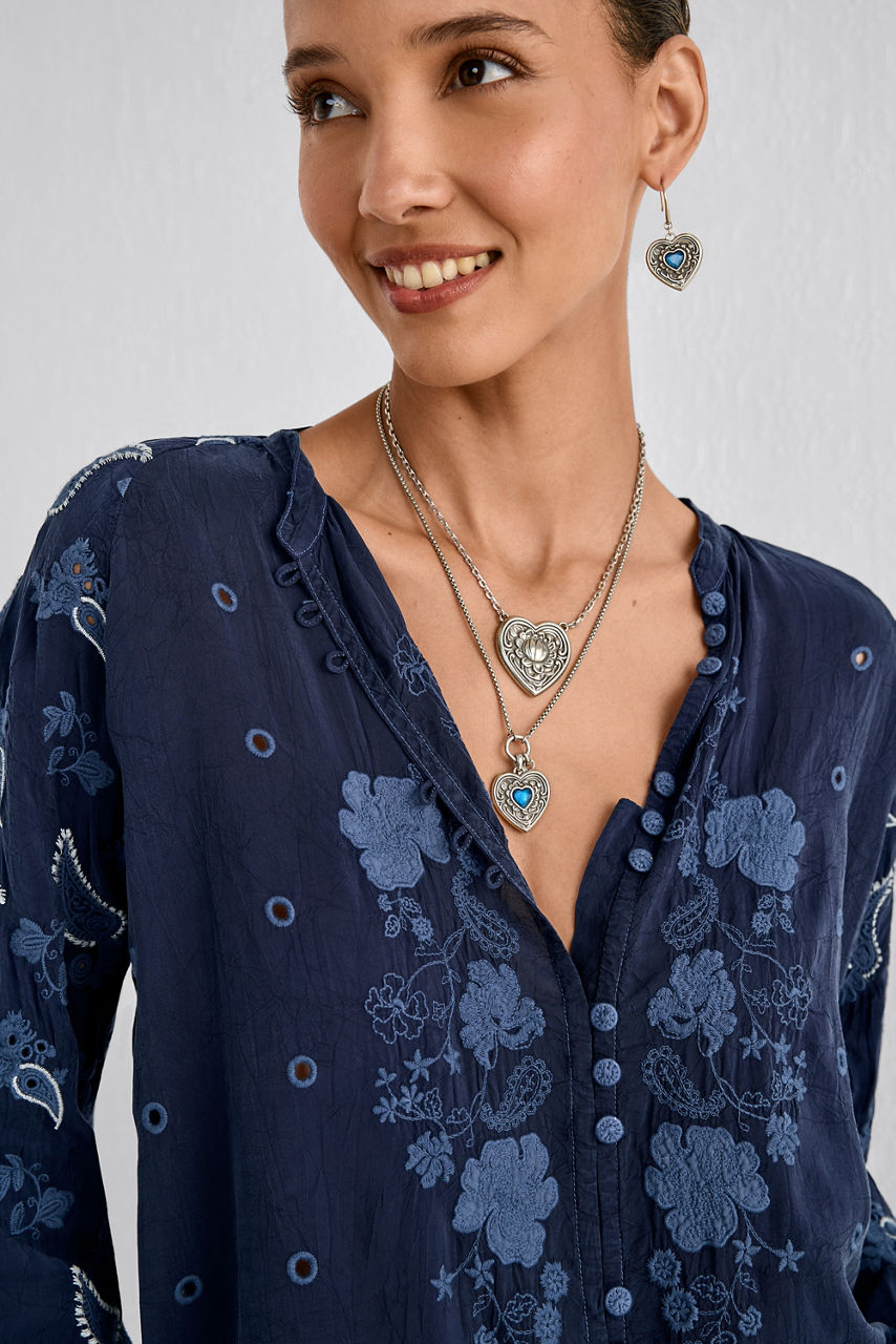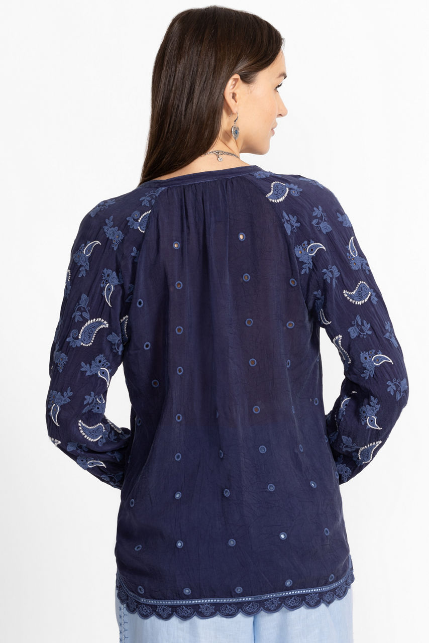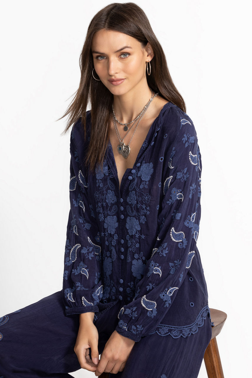 Crafted from a lightweight flowing fabric, the Falco Tunic is intricately embellished with embroidery. Featuring a button-front with gathers at the neckline, this blouse is cut with eyelet Bishop sleeves and finished with a decorative scalloped hemline. Pair with palazzo pants and kitten heels for an unforgettable daytime ensemble.