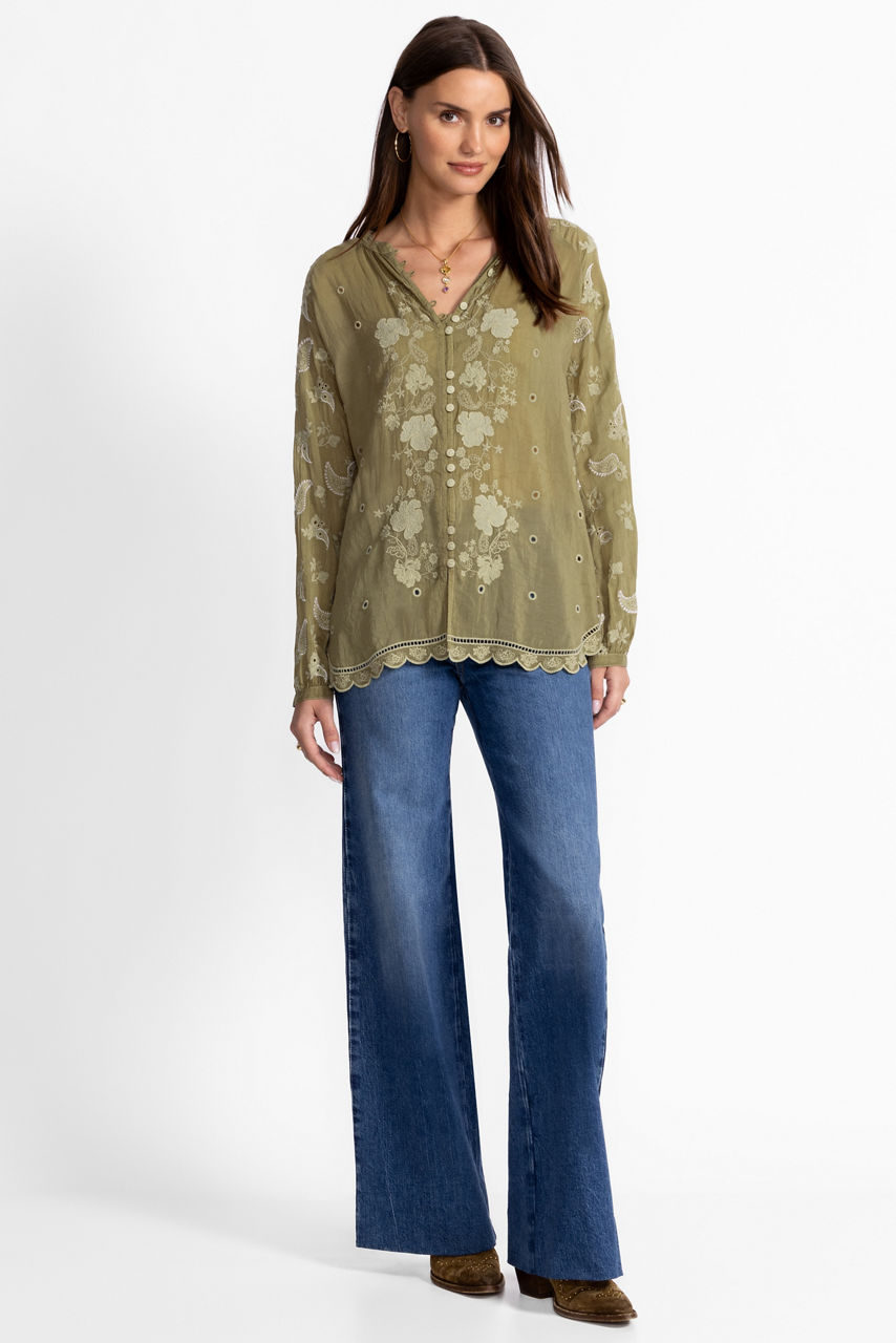 Adorned with intricate eyelet embroidery, the Falco Tunic is crafted from a lightweight, flowing fabric. Cut with a mandarin collar and billowing bishop sleeves, this button-front tunic is finished with a unique scalloped hemline. Pair with coordinating leggings and polished flats for an elevated casual ensemble for an evening out.