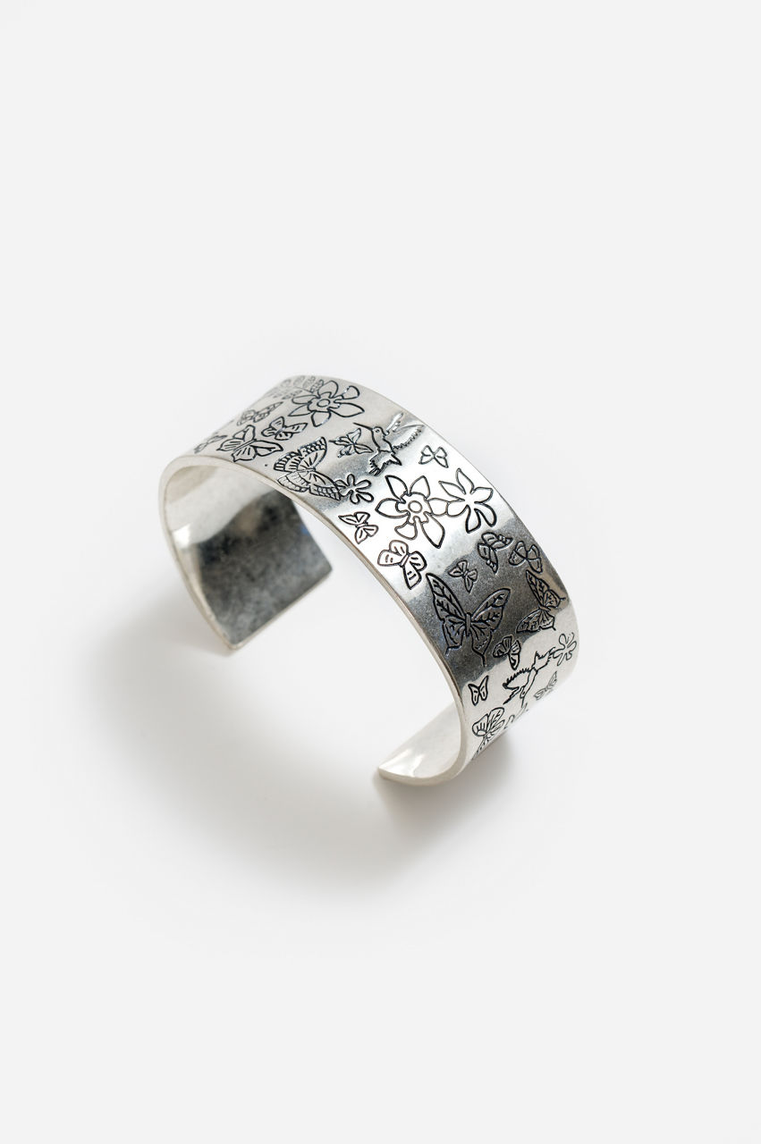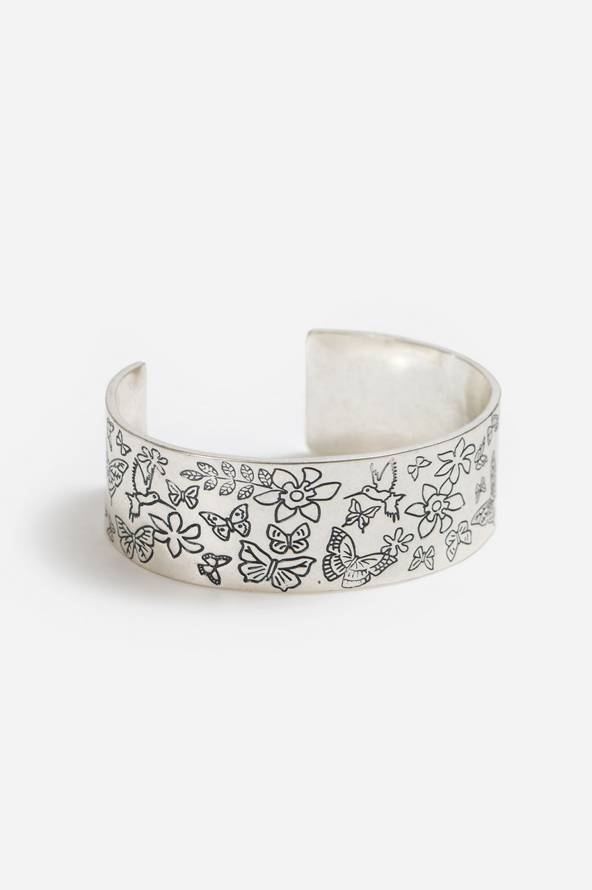 Exhibiting a dazzling display of wonderous butterflies, the Fall Garden Cuff Bracelet captures natures' beauty in a magnificent jewelry piece. Crafted from 100% brass, this silver-plated cuff bracelet is embossed with lifelike detailing. Add to a bold colorful blouse and relaxed fit jeans for a polished casual ensemble.