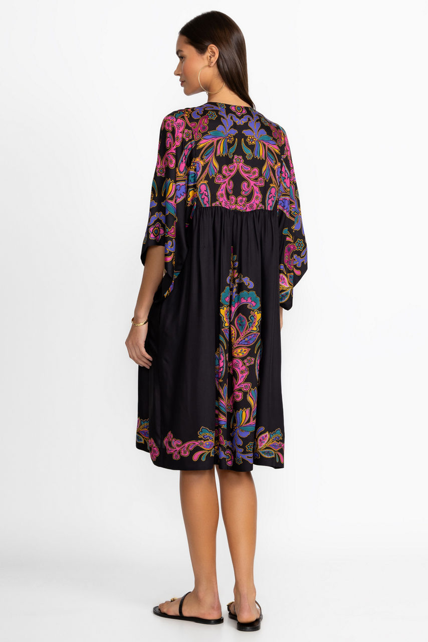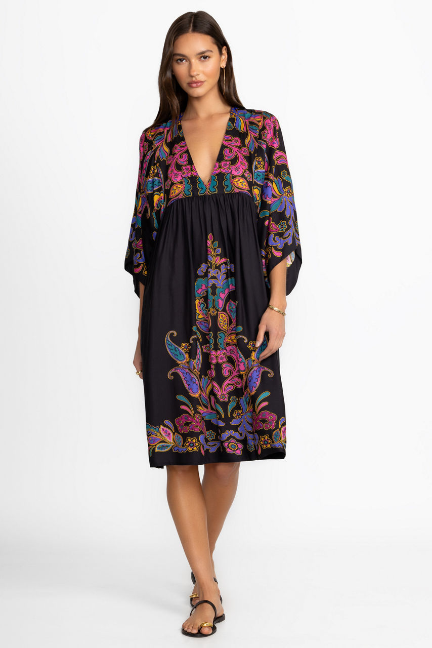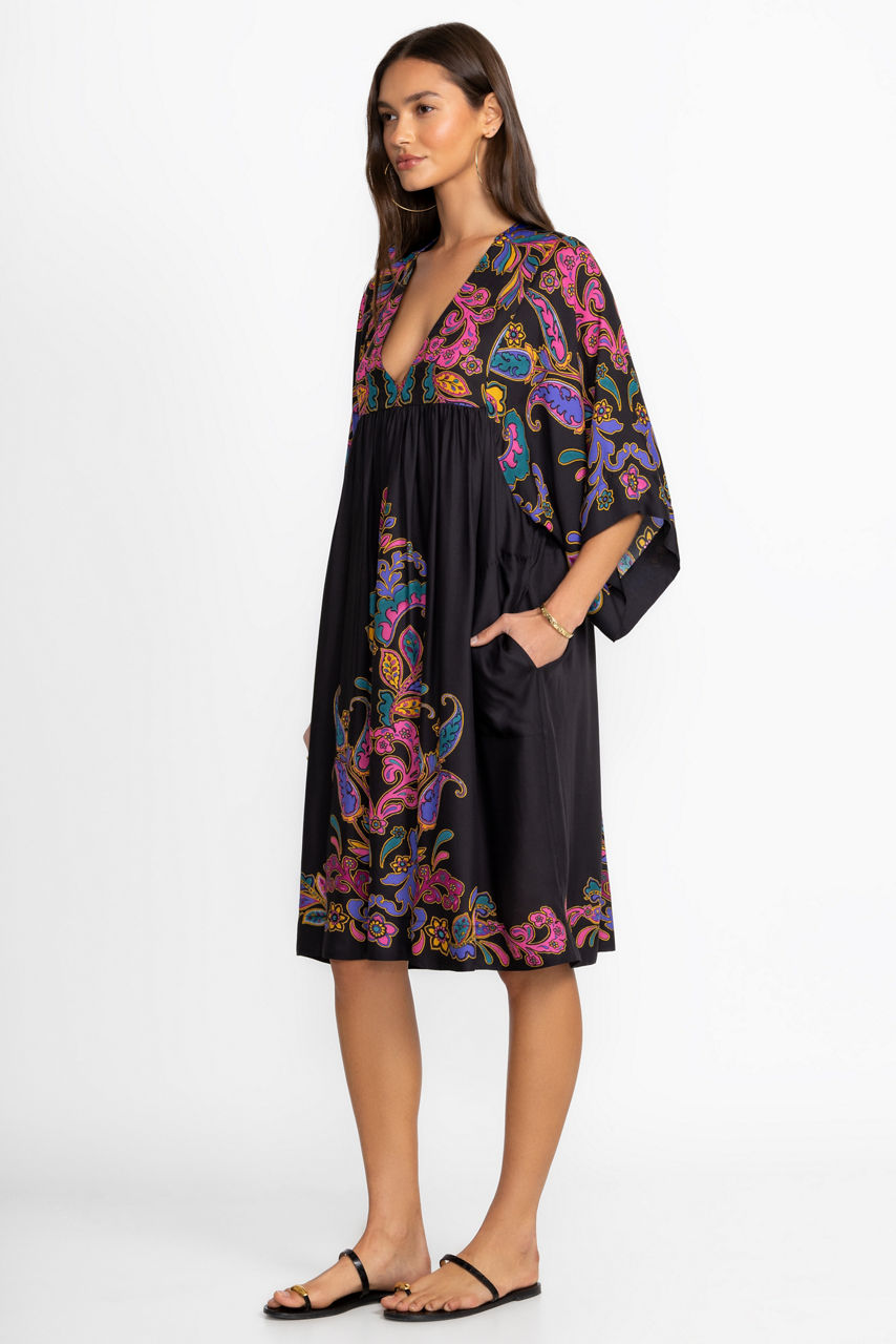 Brilliantly adorned with rich color and mesmerizing pattern, the East Coverup Dress adds a dramatic flair to your poolside look. Featuring a V-neckline and empire waist, this flowing silk-blend cover-up is finished with Dolman sleeves and pockets for convenience. Layer over the Reversible Square Neck One Piece for a perfectly coordinated resort-ready look.