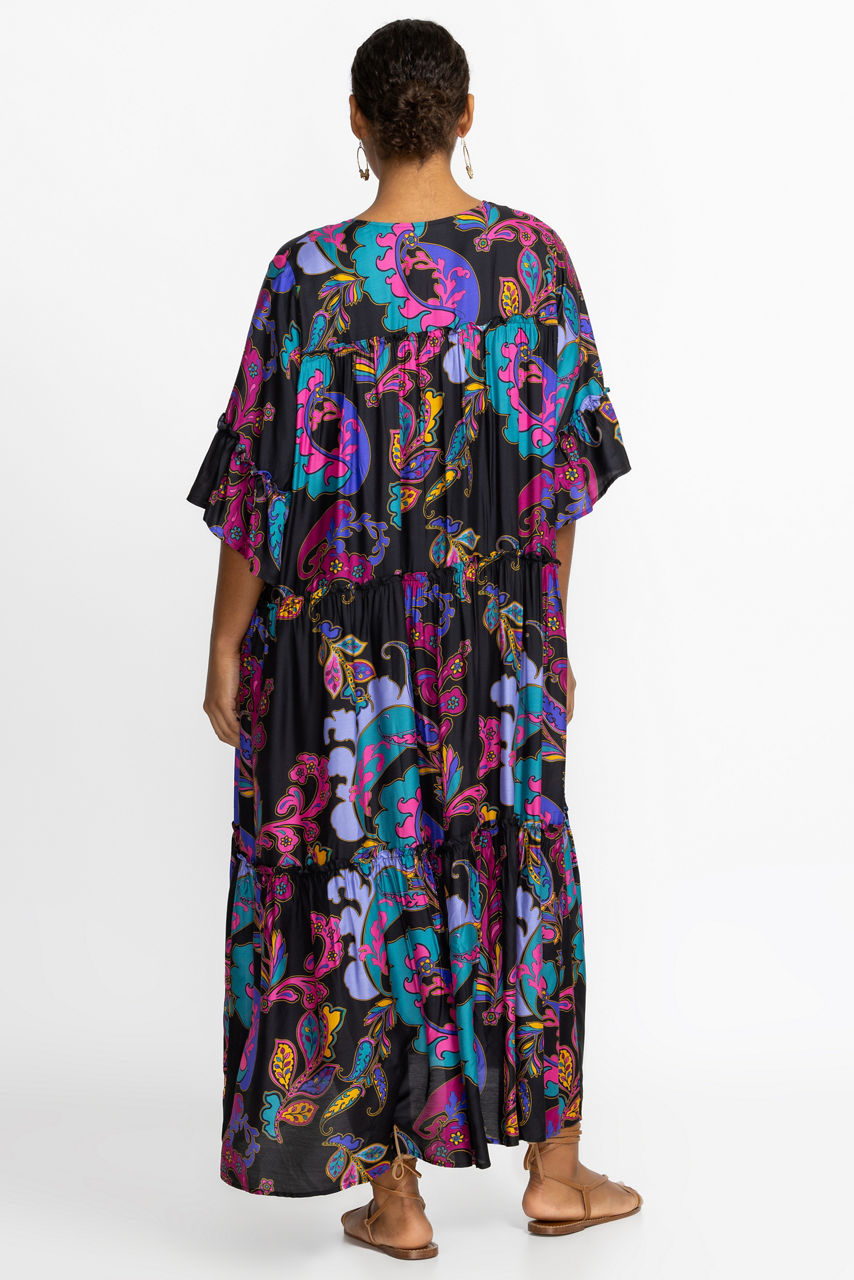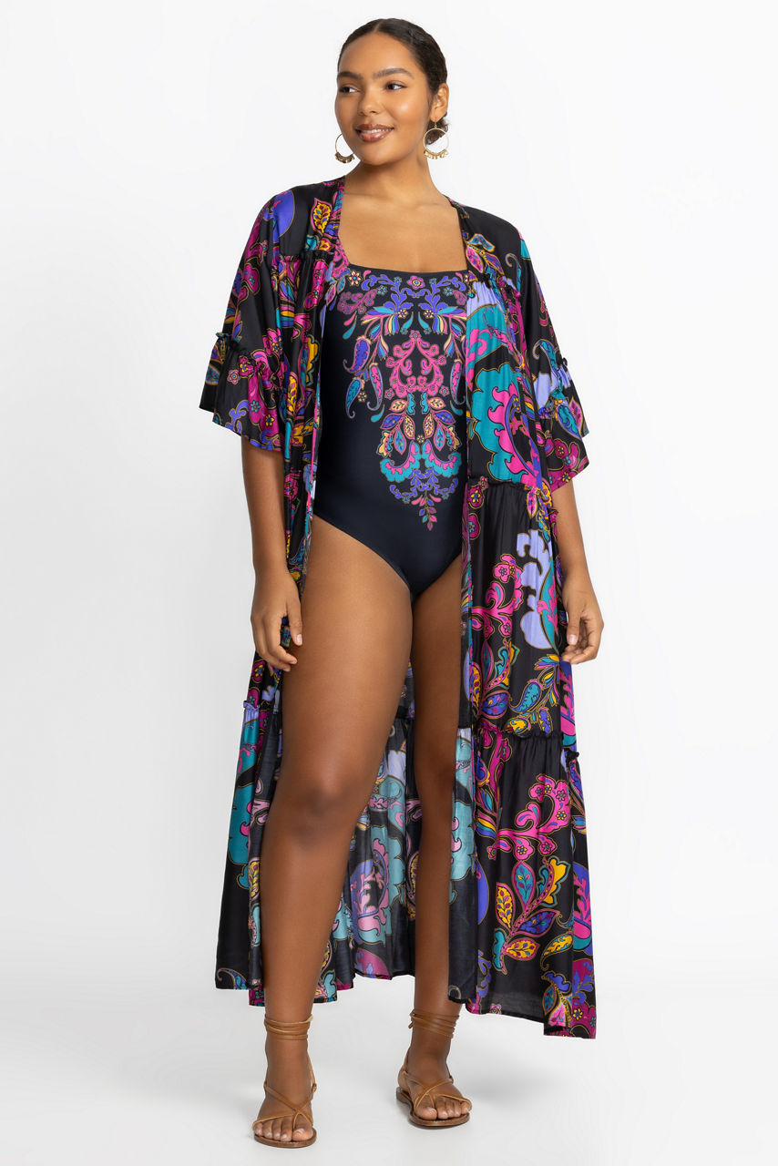 Embellished with a bold design created in a rich color palette, the Tiered Kimono adds a hint of sophistication to any swim ensemble. Crafted from a luxurious silk blend, this flowing kimono features an open front and ruffled sleeves and is finished with a tiered skirt for dramatic flair. Layer over the Wrap Skirted One Piece for an elevated poolside pairing.