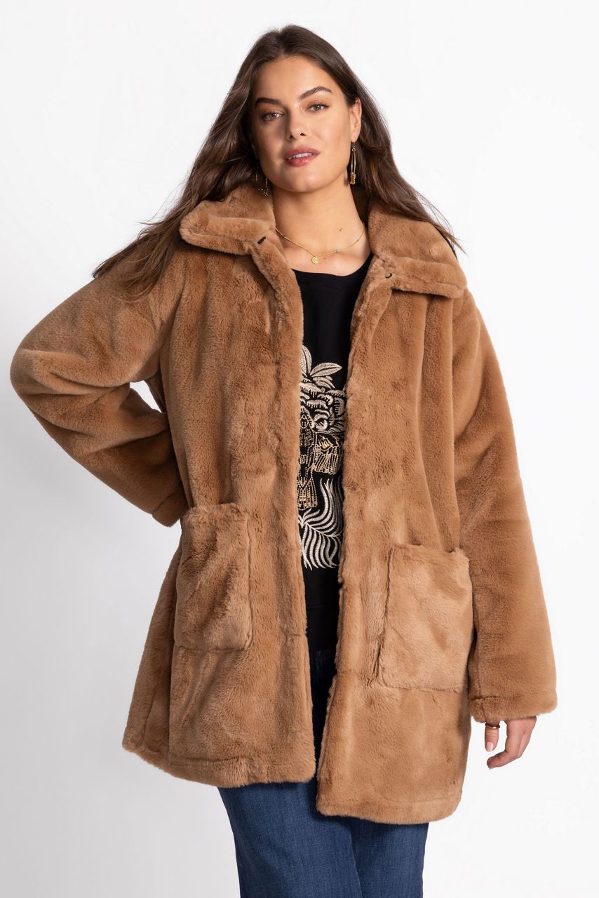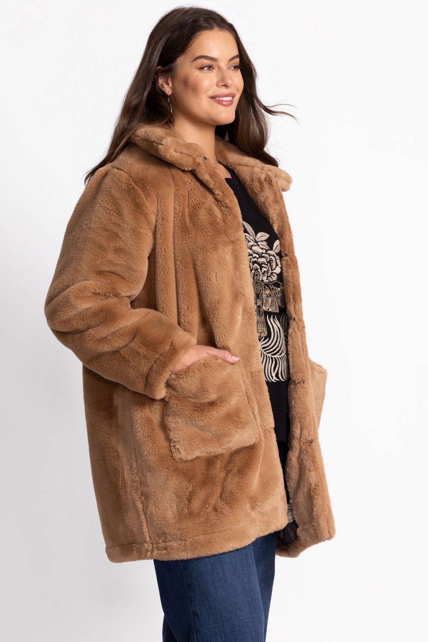 Thoughtfully crafted, the Choco Faux Fur Coat is equal parts trendy and cozy. Designed with a standing collar and a hook-and-eye front closure, this car-length coat is finished with pockets at the hips and a bold floral lining. Layer over a vibrant dress and pair with riding boots for a polished cold-weather ensemble.