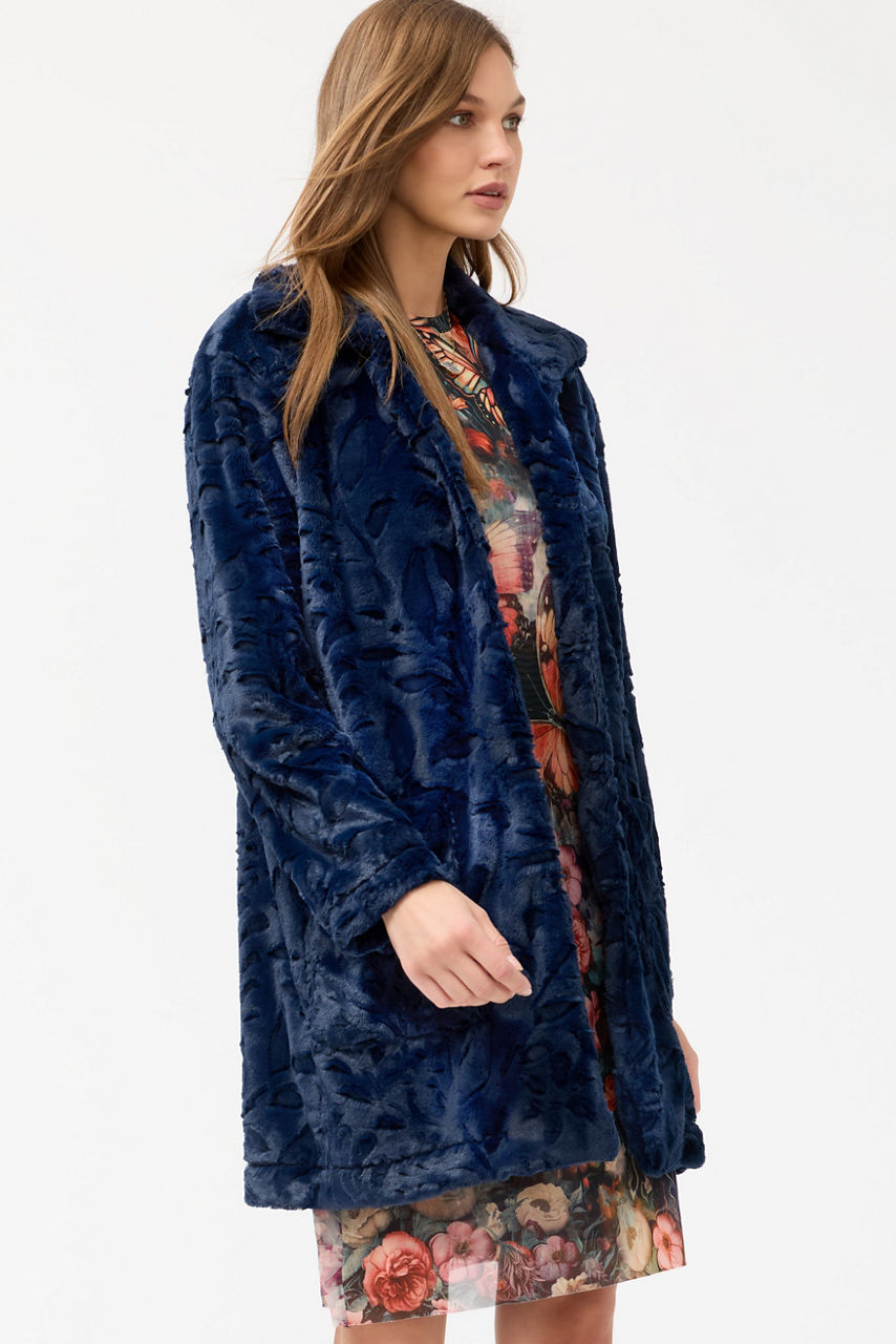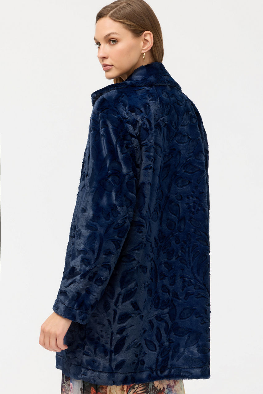 The Navy Rose Faux Fur Coat is crafted from a rich faux fur fabric and accented with an intricate rose pattern. Designed with a standing collar and a colorful floral lining, this unique coat is finished with large patch pockets. Layer over a sleek black turtleneck and fitted pants for a polished evening out.