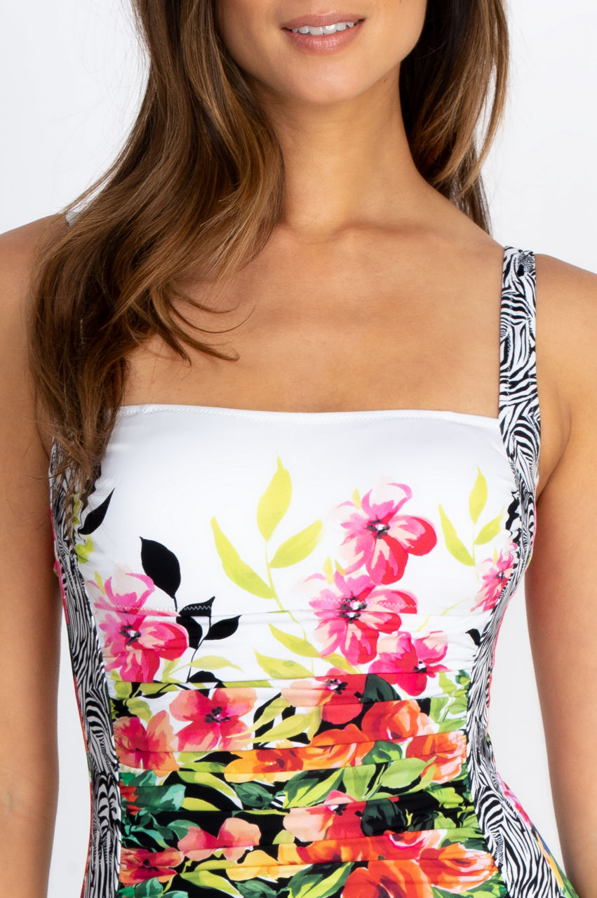 Make waves this swim season with the Fay Floral Ruched One Piece. A new take on a classic cut, this gorgeous botanical-inspired piece features bright floral details and an ultra-flattering ruched fit perfect for when you re lounging poolside or spending the day at the beach. Pair with a sheer kimono or a sarong for a chic boho look.