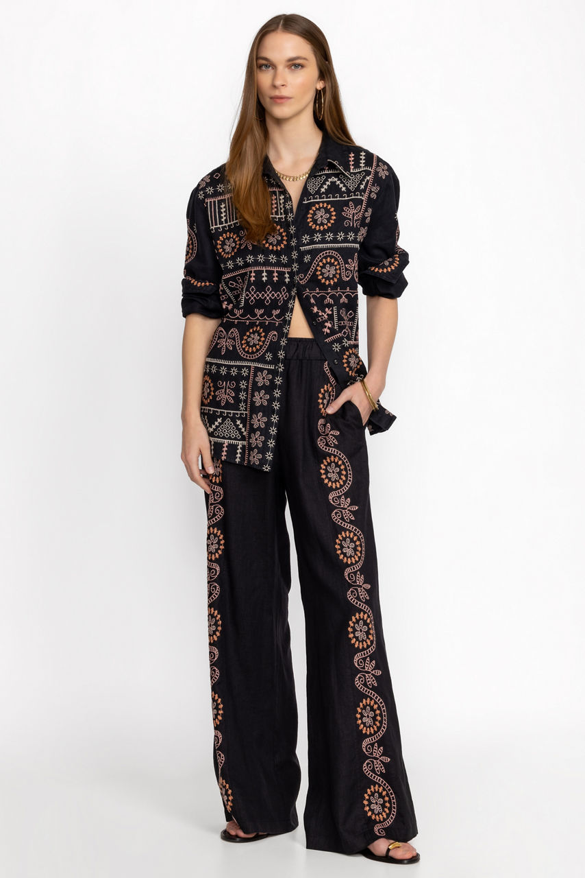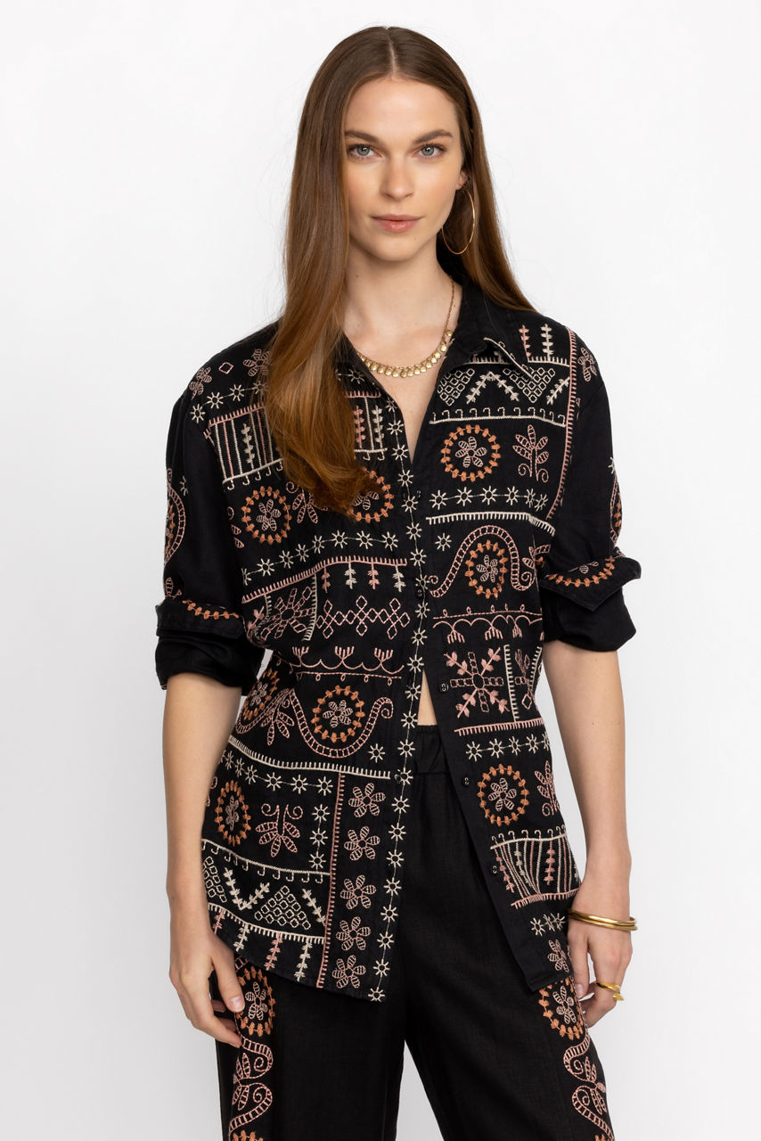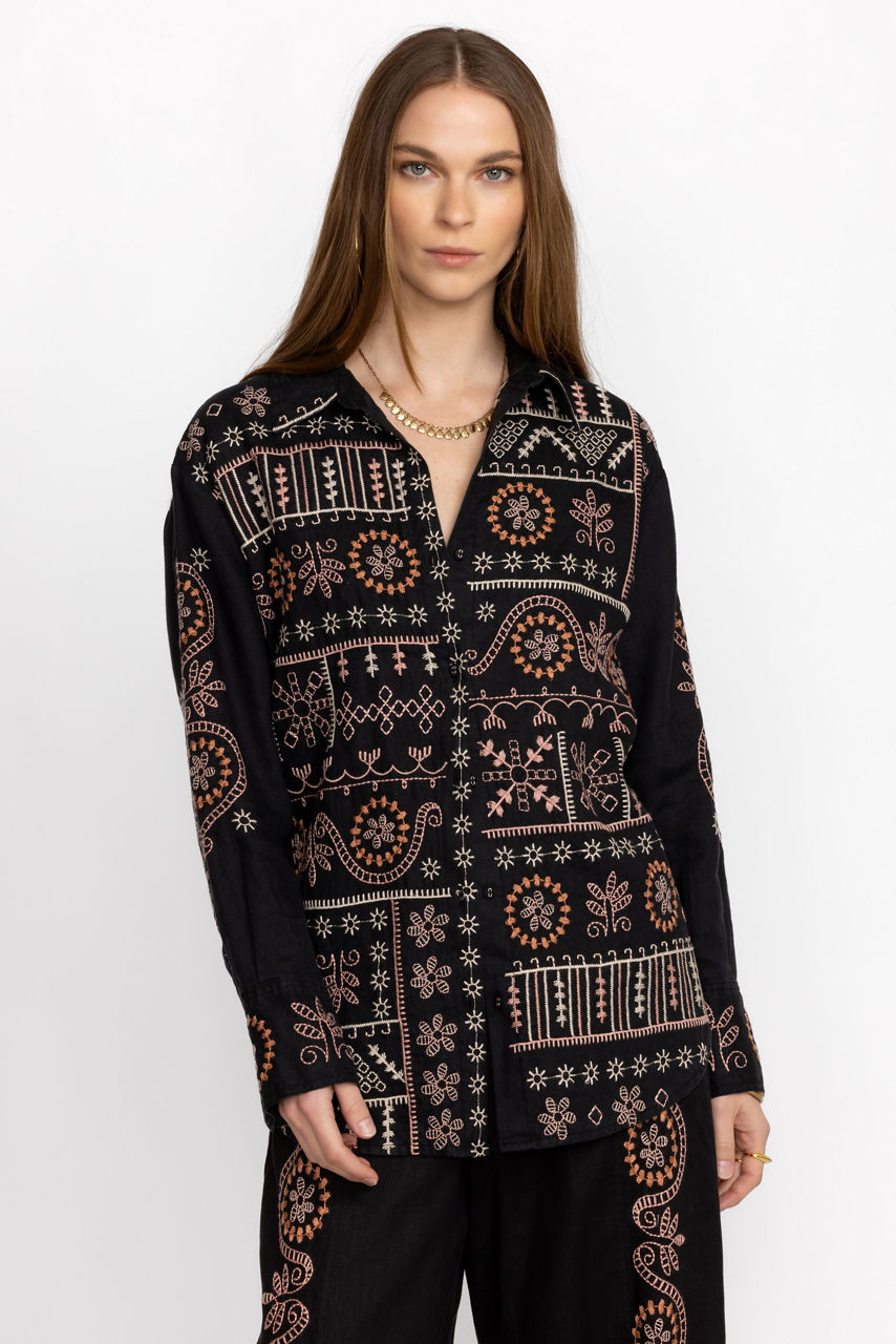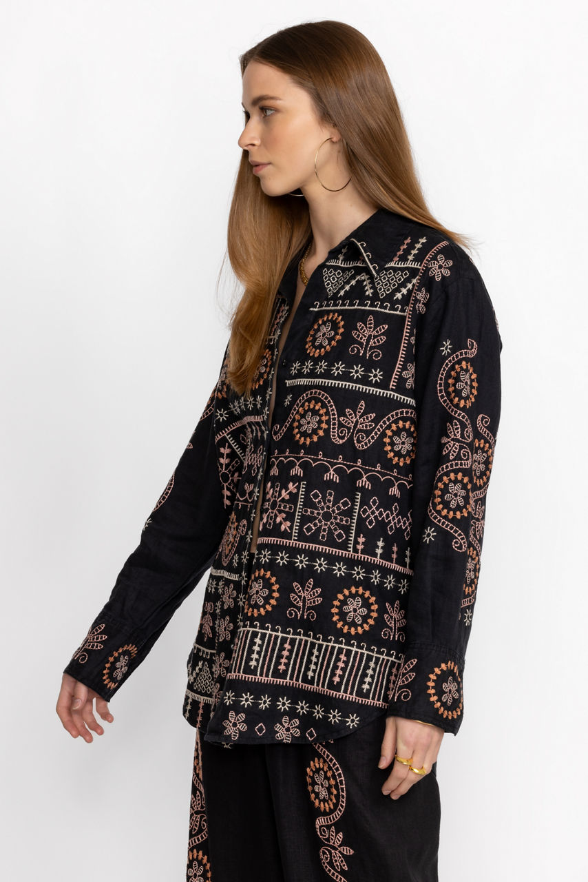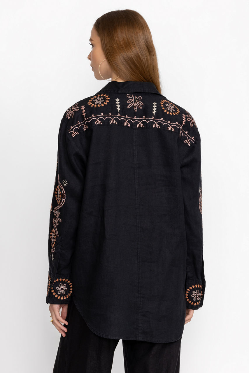 Offering a feminine take on a classic silhouette, the Faye Relaxed Linen Shirt is the perfect combination of style and grace. Crafted from 100% linen, this button front shirt features delicate placement embroidery and fabric covered buttons for a polished finish. Pair with linen trousers and leather flats for a timeless look.
