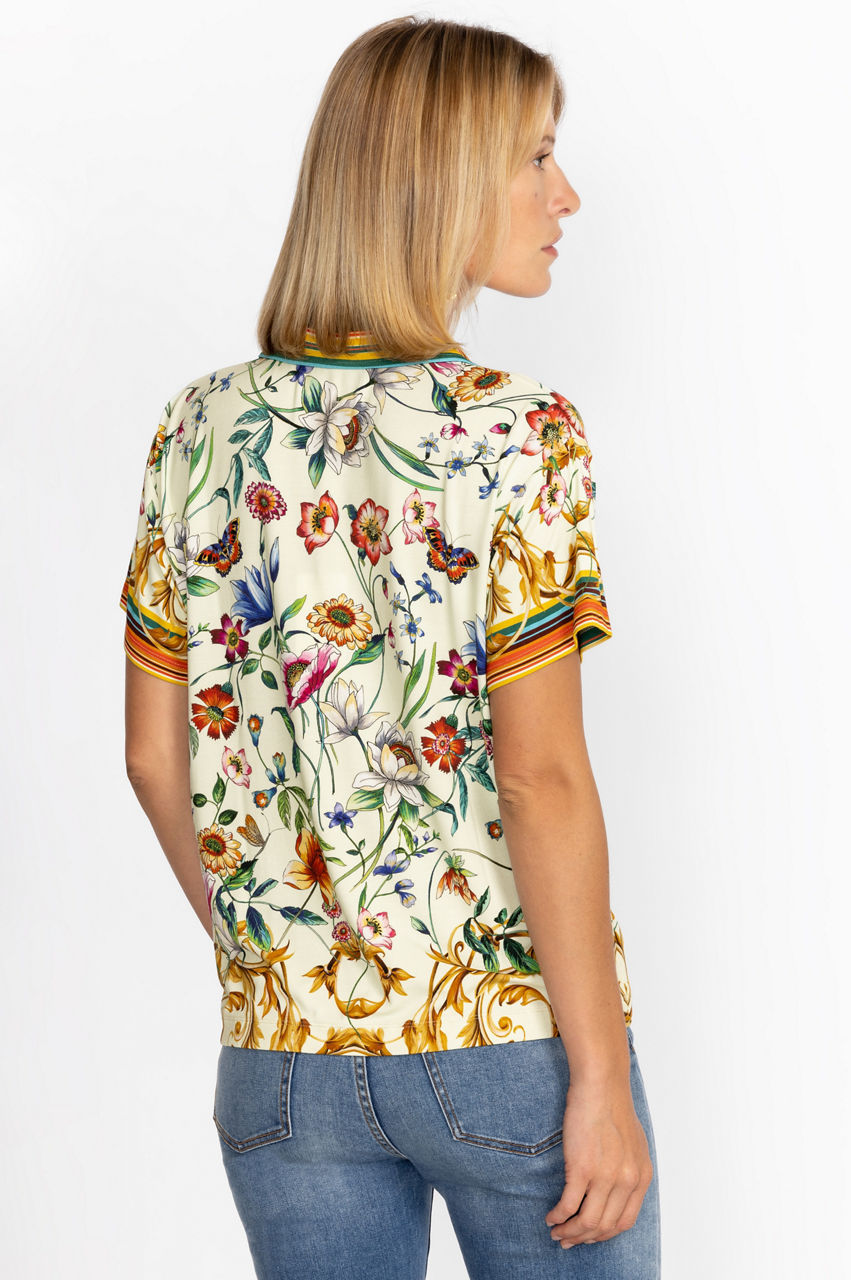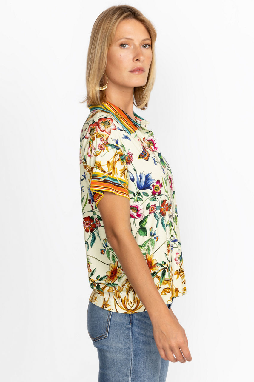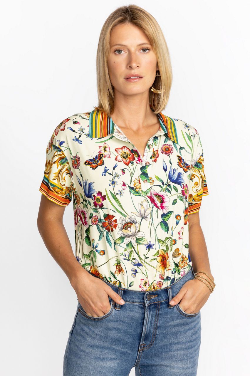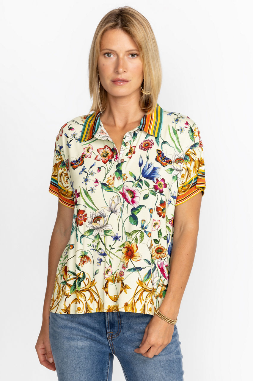 Displaying a bold expression of nature's most beautiful elements, the Felix Short Sleeve Polo Tee is an artful display of color and whimsy. A classic polo silhouette infused with floral and baroque details, this tee finished with delicate shell buttons for an inspired take on a traditional favorite. Pair with classic chinos and sneakers for an upscale casual look.
