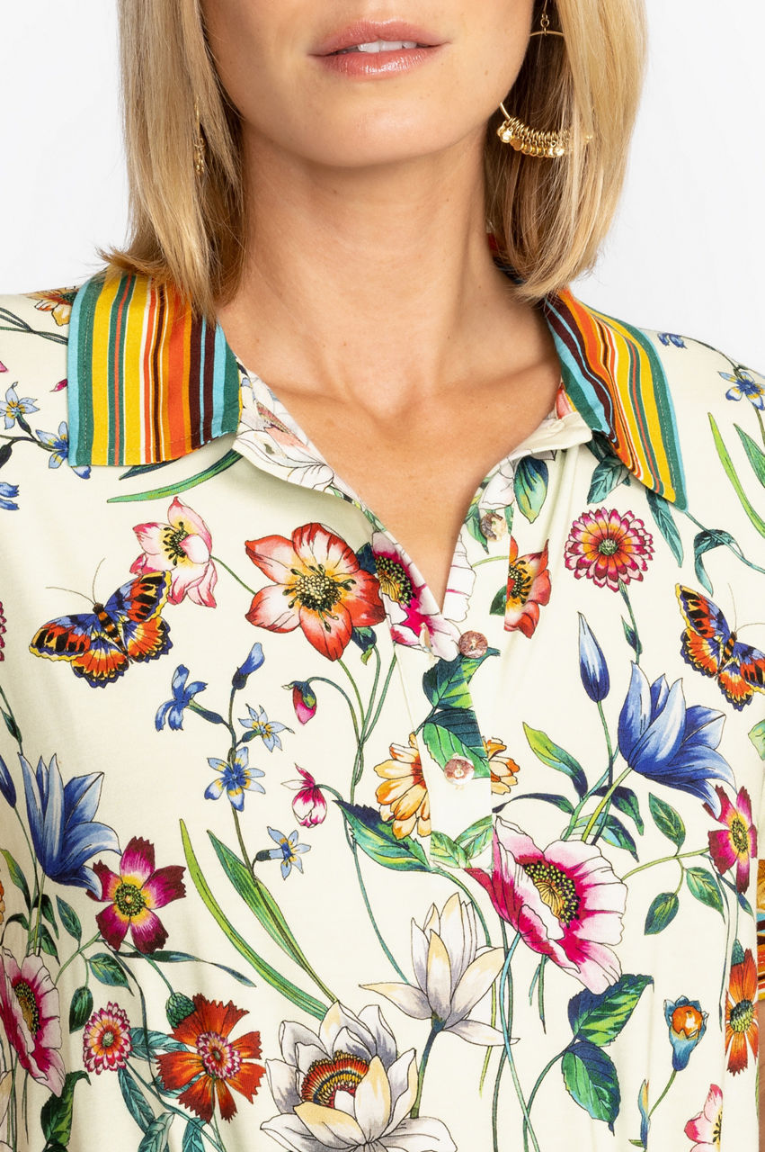 Displaying a bold expression of nature's most beautiful elements, the Felix Short Sleeve Polo Tee is an artful display of color and whimsy. A classic polo silhouette infused with floral and baroque details, this tee finished with delicate shell buttons for an inspired take on a traditional favorite. Pair with classic chinos and sneakers for an upscale casual look.