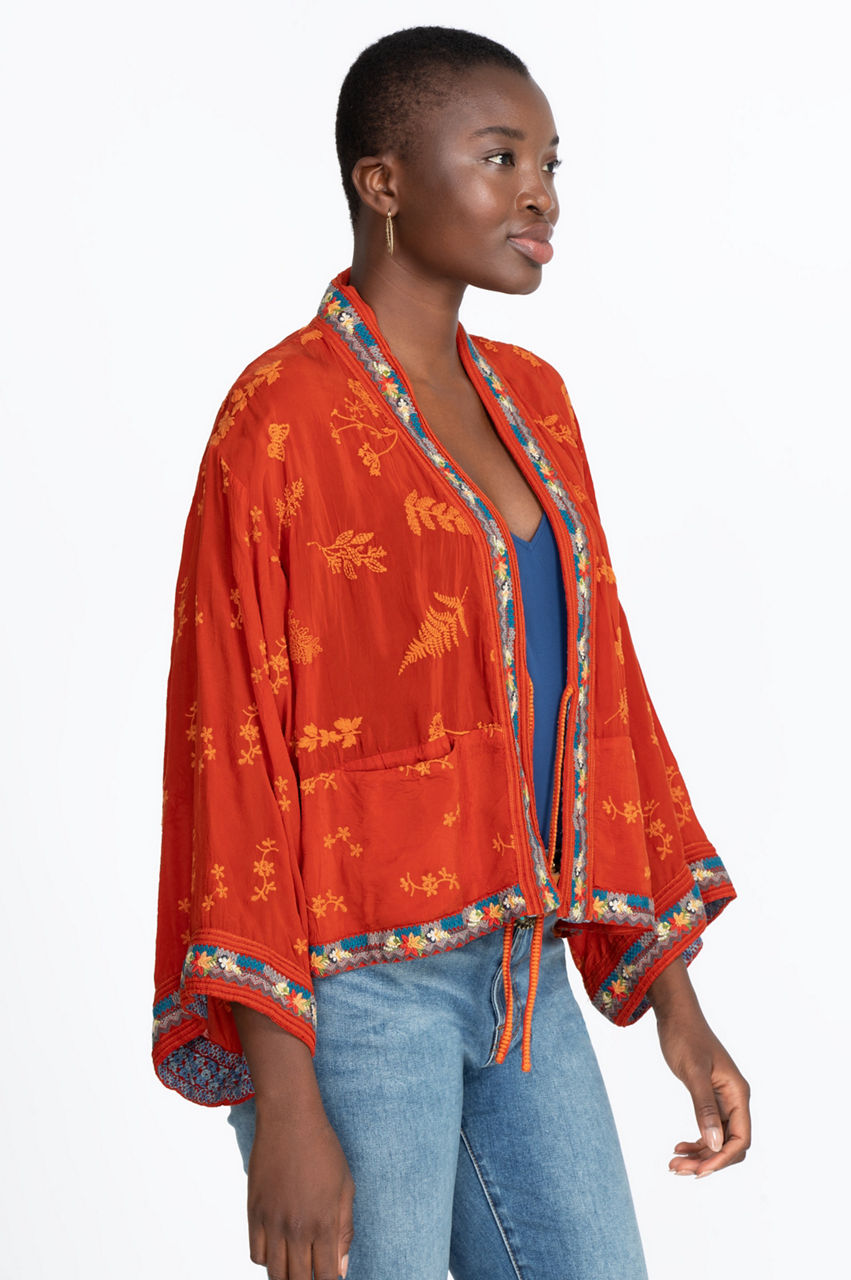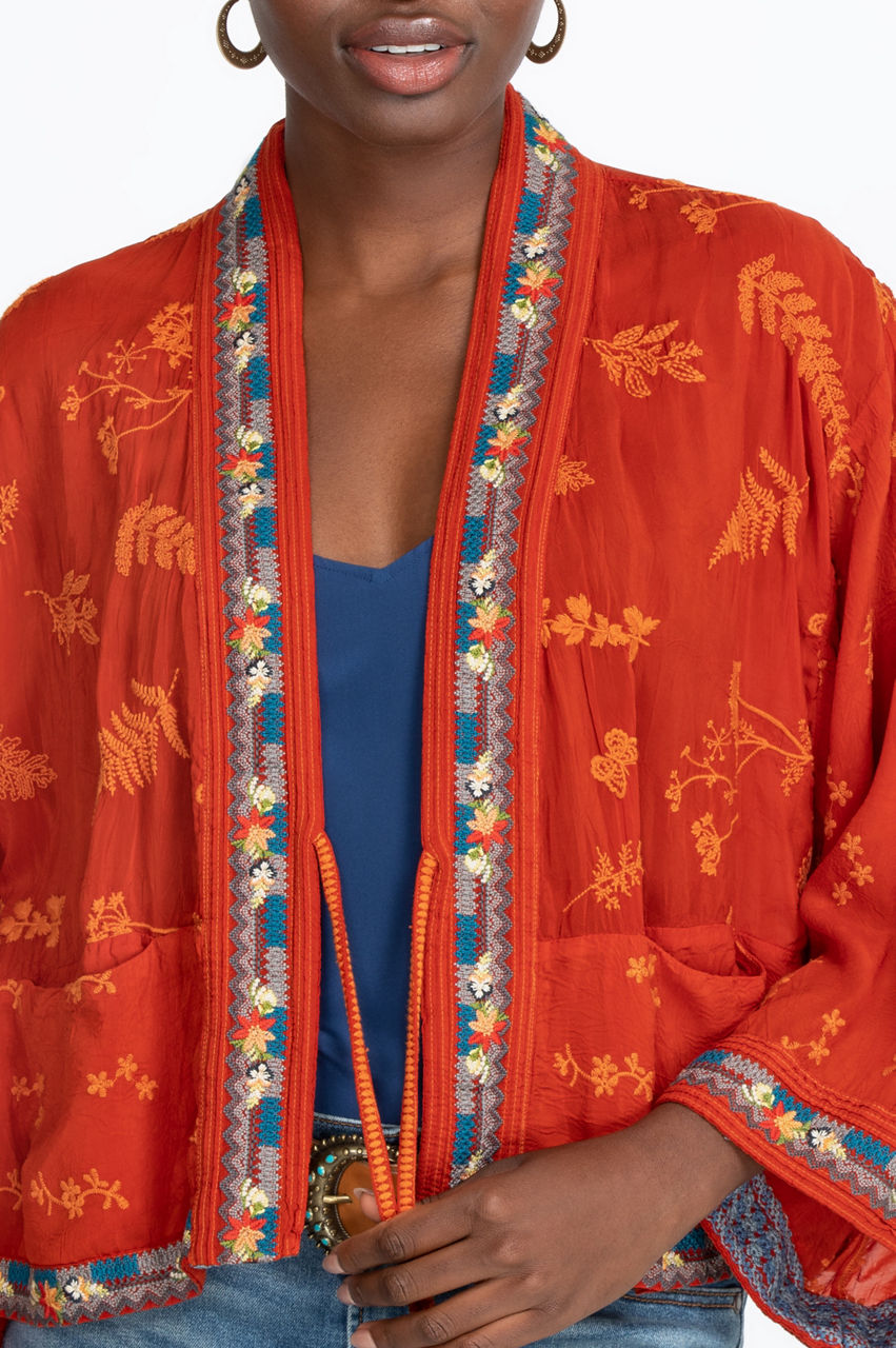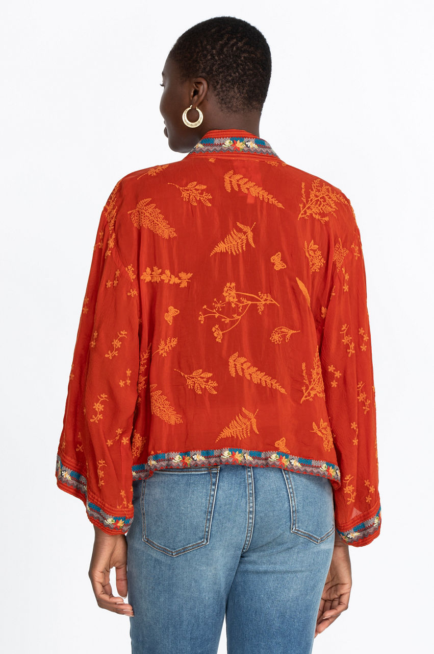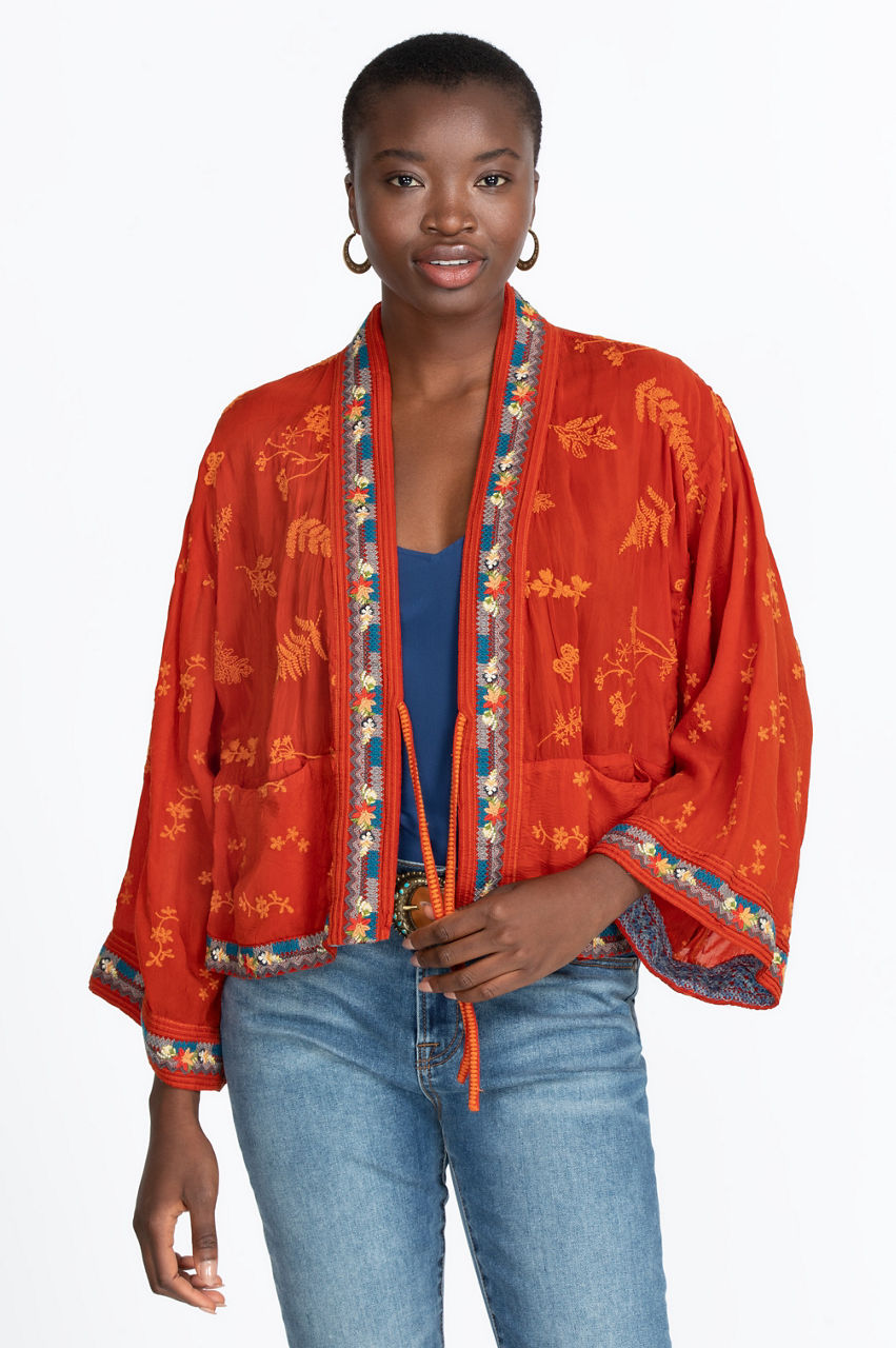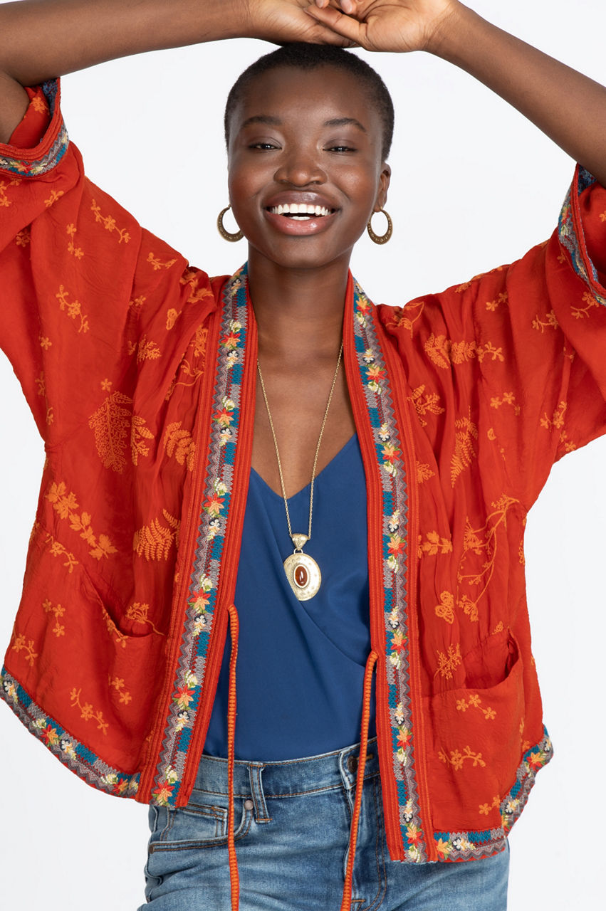 Casual and gorgeous, the Fern Danica Kimono features wide sleeves and a laidback fit. The print creates an elegant contrast between the embellished sleeves and placket and the neutral fabric. Relax at night by wearing this kimono over a silk pajama set or dress up this piece with a belt and wear it over a stylish outfit.
