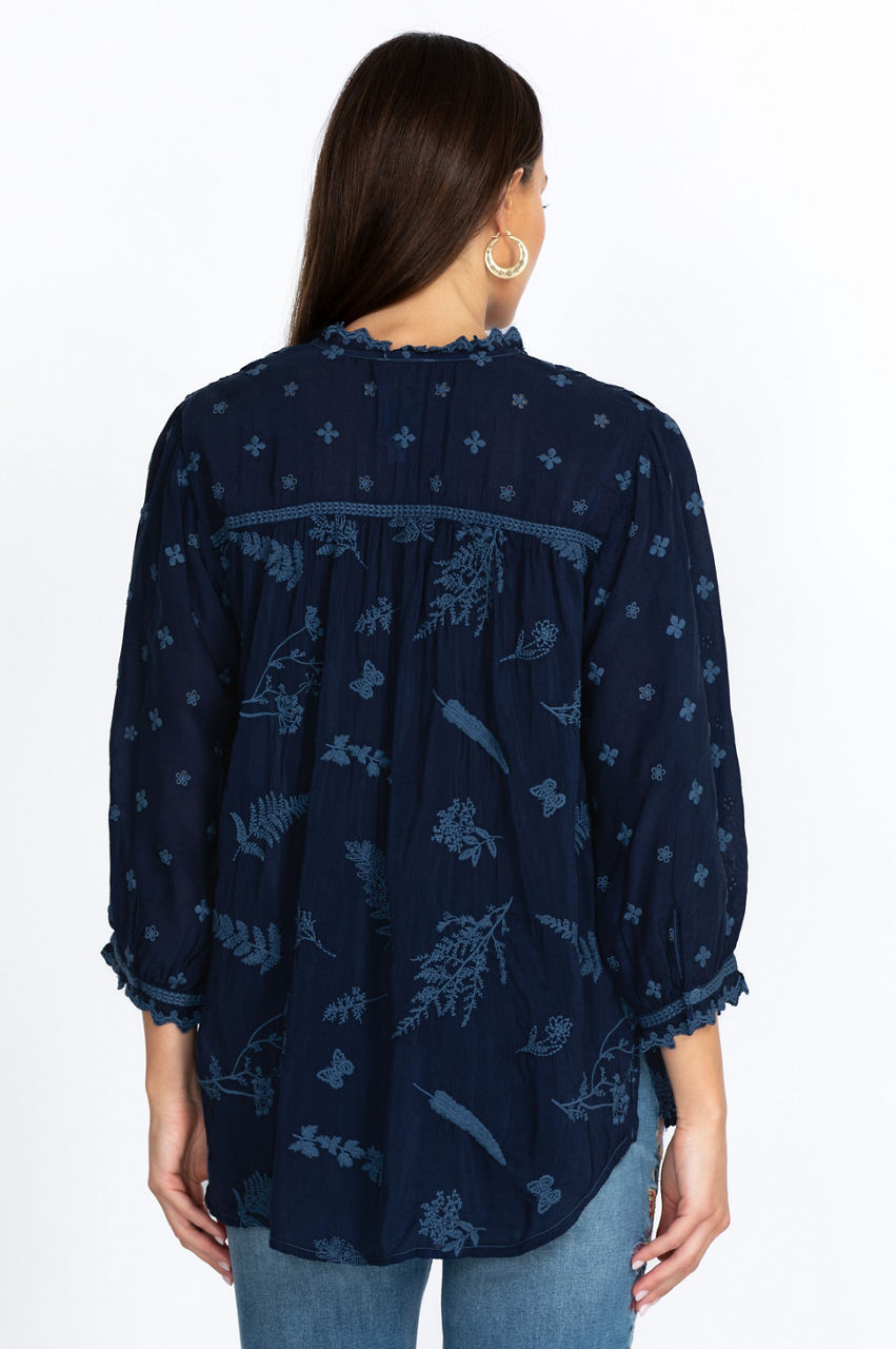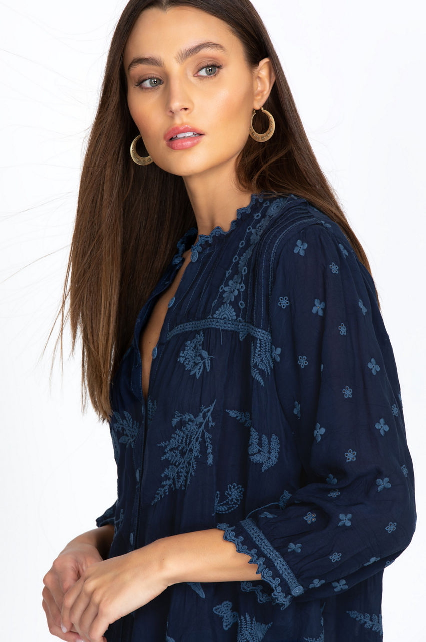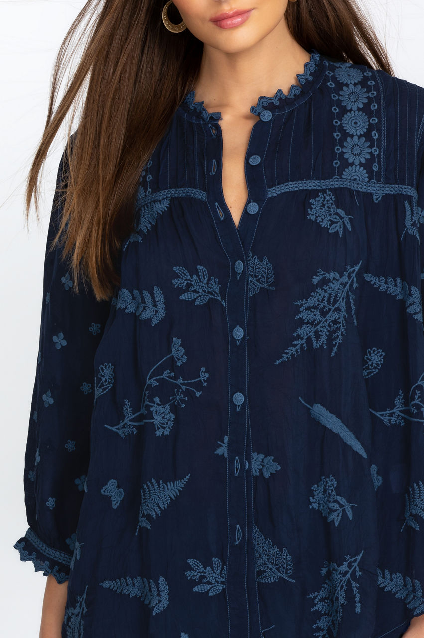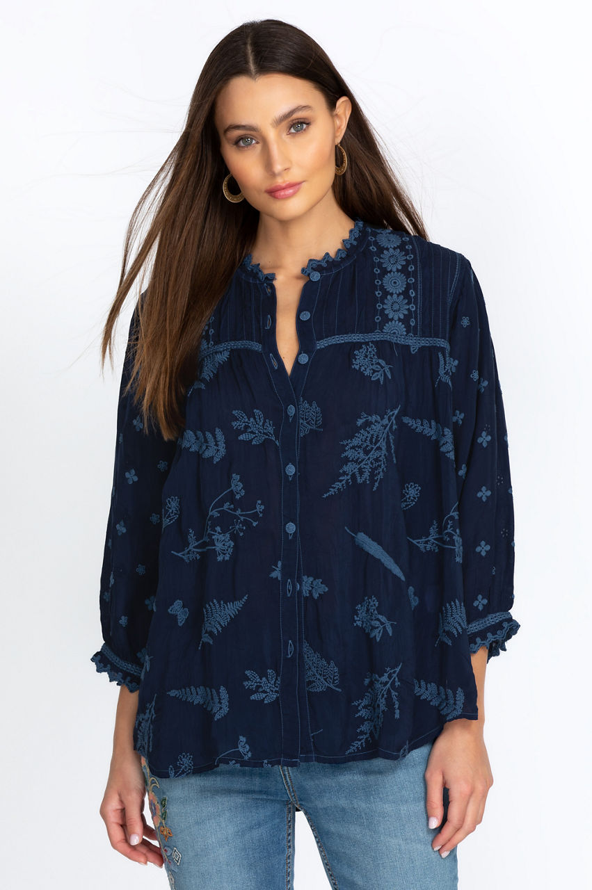 This artisan-inspired piece features a structured design, from the front closure to the collar and sleeve details. Combining different prints creates a modern piece that introduces colors and visual interest to elevate your outfits. It s a great piece for layering underneath a neutral jacket, but you can also style it with flares or a midi skirt for a boho-chic look.