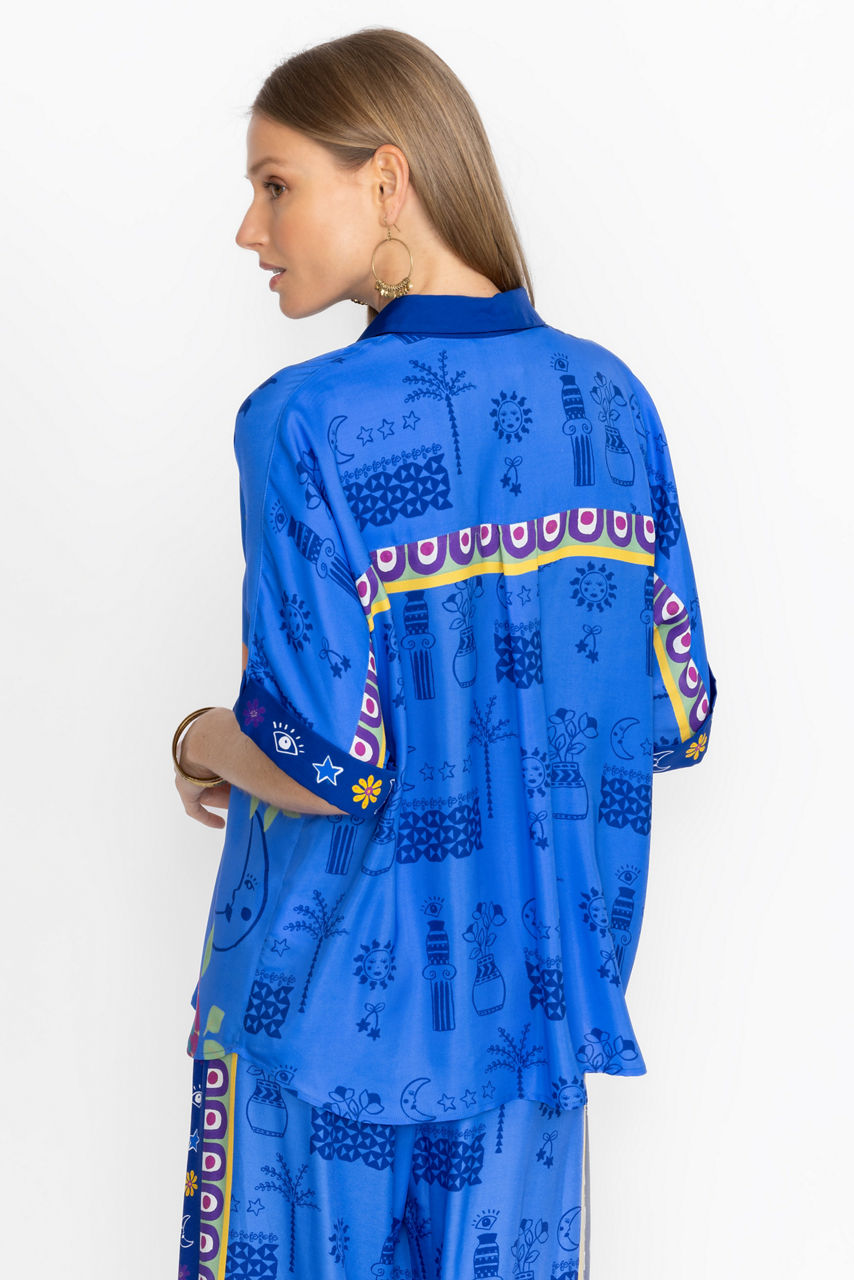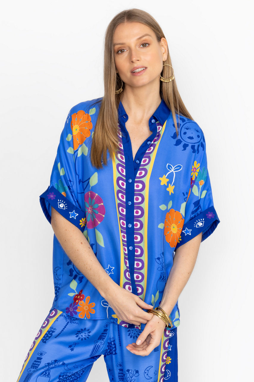 Crafted from a unique silk blend fabric, the Fernanda Button Down Shirt expertly combines bold color and impeccable style. Featuring a contrasting collar and cuffs, this button-front shirt is embellished with vibrant decorative placement embroidery for a splash of color. Pair with skinny jeans and smart flats for a polished casual look for the weekend.