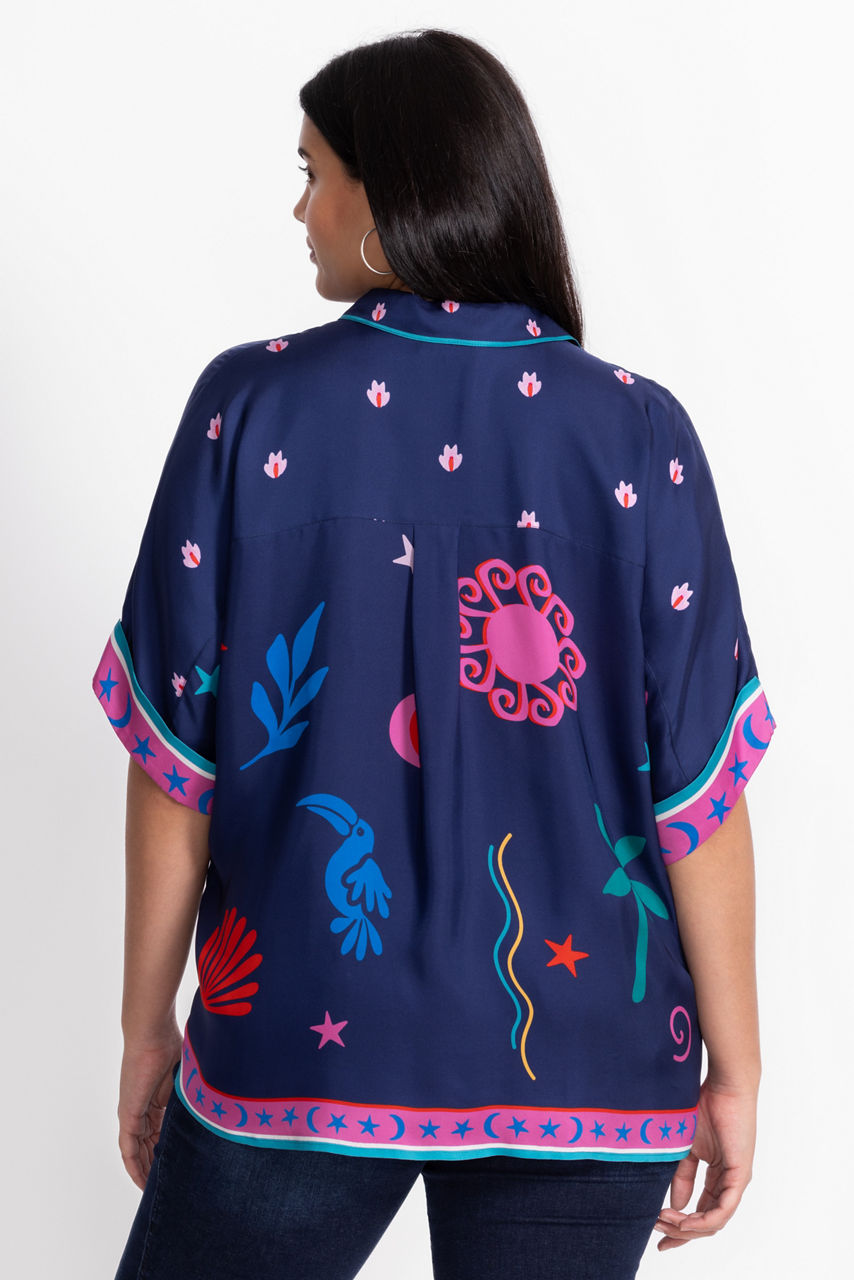 Crafted from a breezy silk blend, the Fernanda Button Down Shirt is adorned with brilliant color. Designed with a classic collared button front, this shirt featured Dolman sleeves and is embellished with eye-catching island iconography. Pair with colorful linen shorts and comfortable lightweight sandals for a resort-ready style.