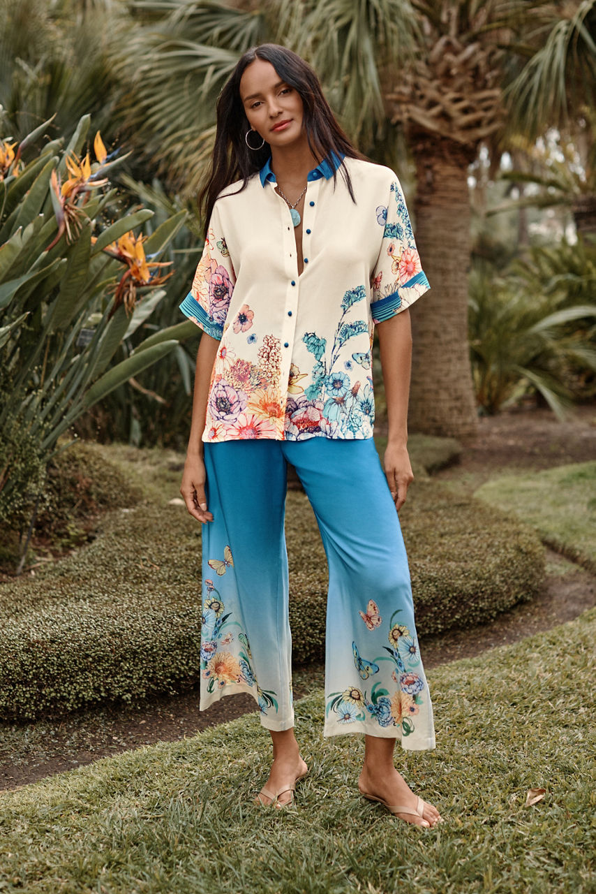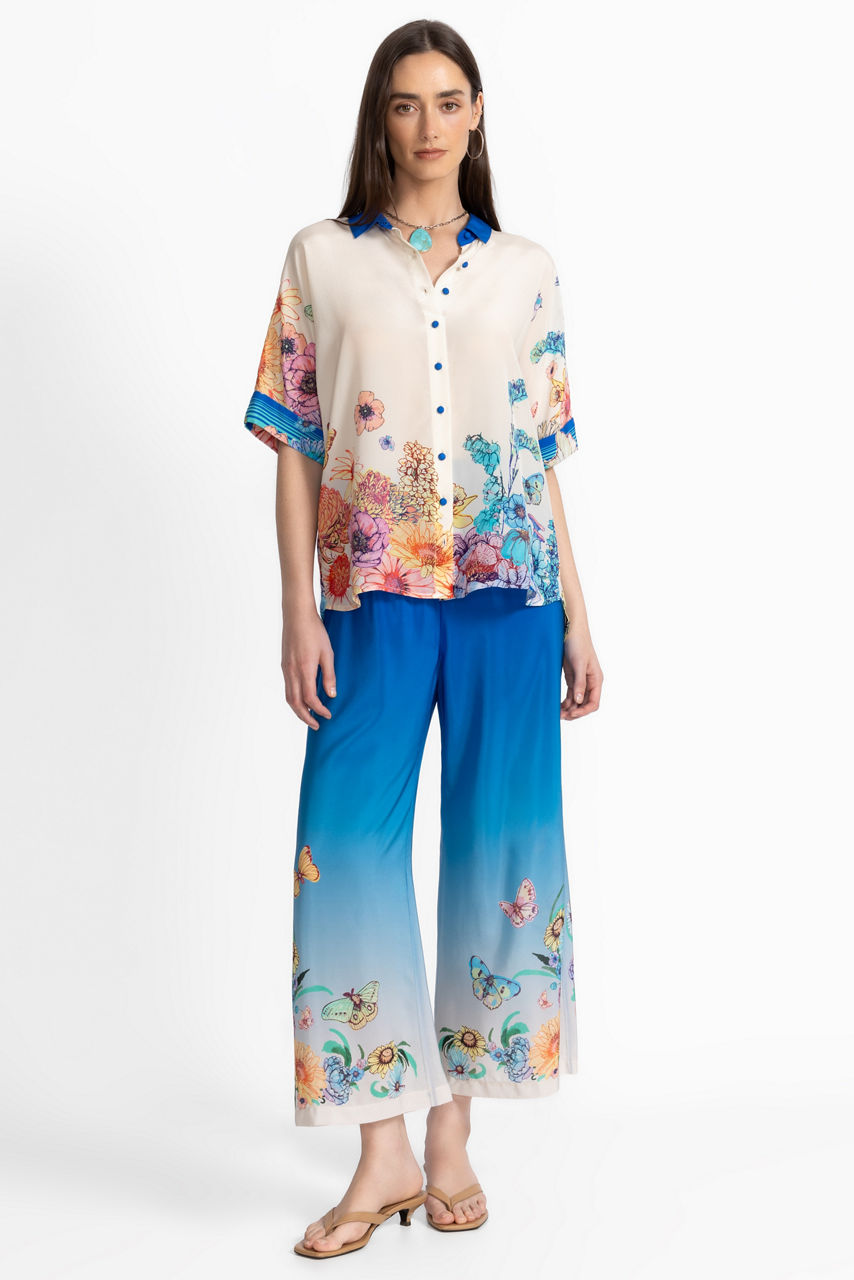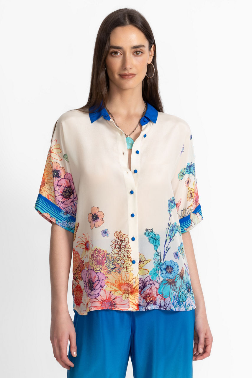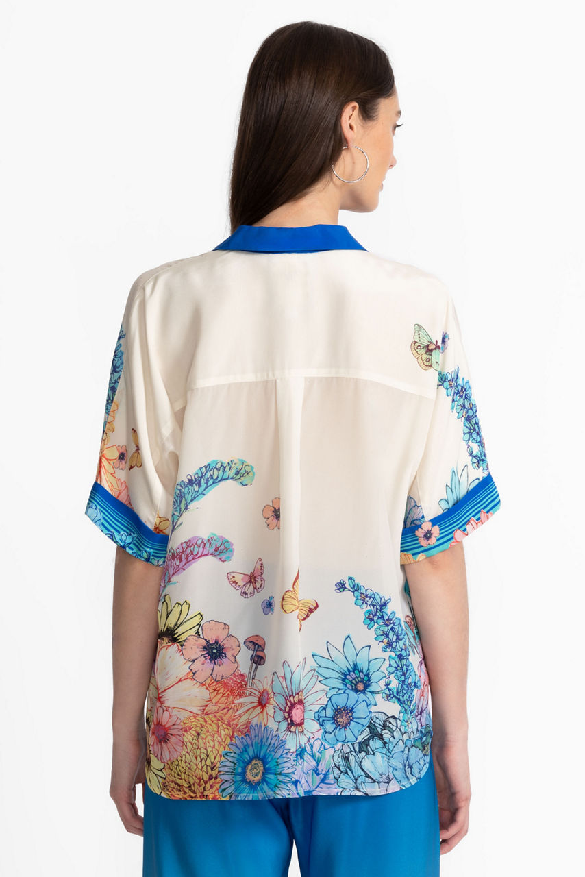 Crafted from 100% sumptuous silk, the Fernanda Button Down Shirt is adorned with brilliant color. Featuring a bold blue contrasting collar and a classic button-front, this relaxed-fit blouse is finished with a vibrant floral motif print at the hemline. Pair with relaxed-fit trousers and casual loafers for a polished weekend look.