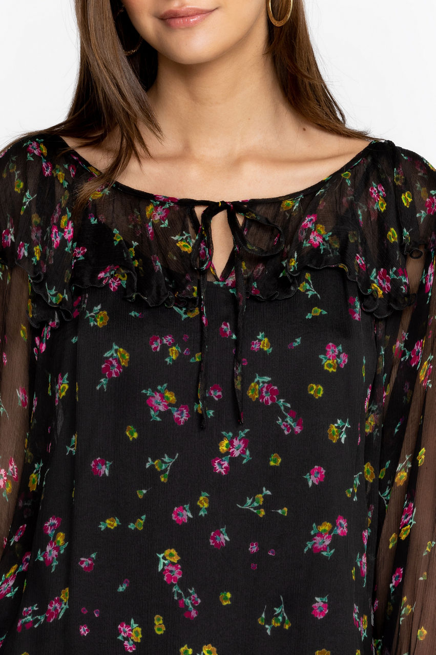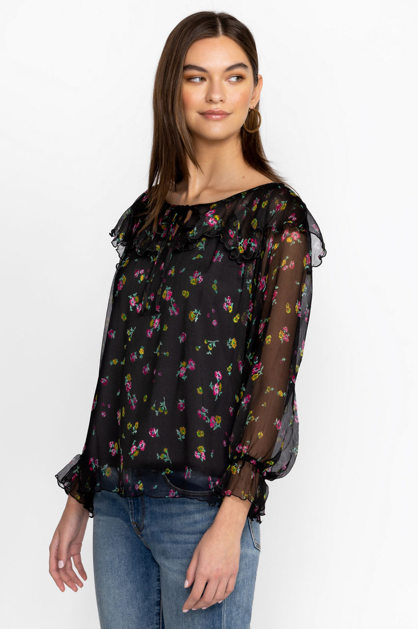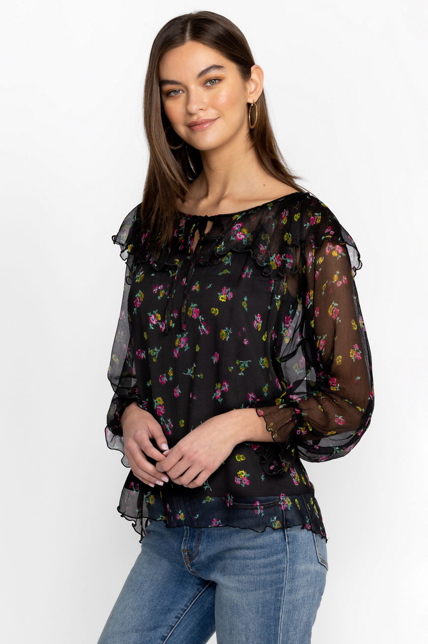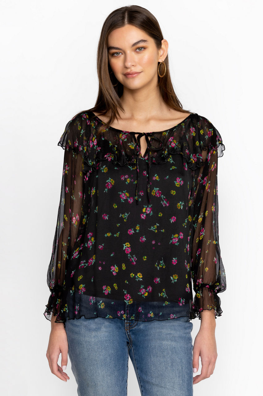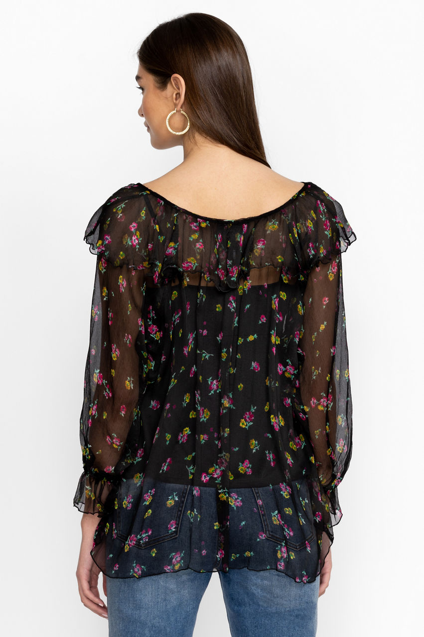 Embodying a romantic touch, the Fernanda Peasant Blouse takes your new season wardrobe in a playful direction. Enhanced by subtle statement florals in saturated hues, this blouse is crafted from sumptuous silk and features a round ruffle neck, long sleeves, a separate cami, and long sleeves with elastic sleeve cuffs for added flounce. Pair with a skirt for a feminine finish.