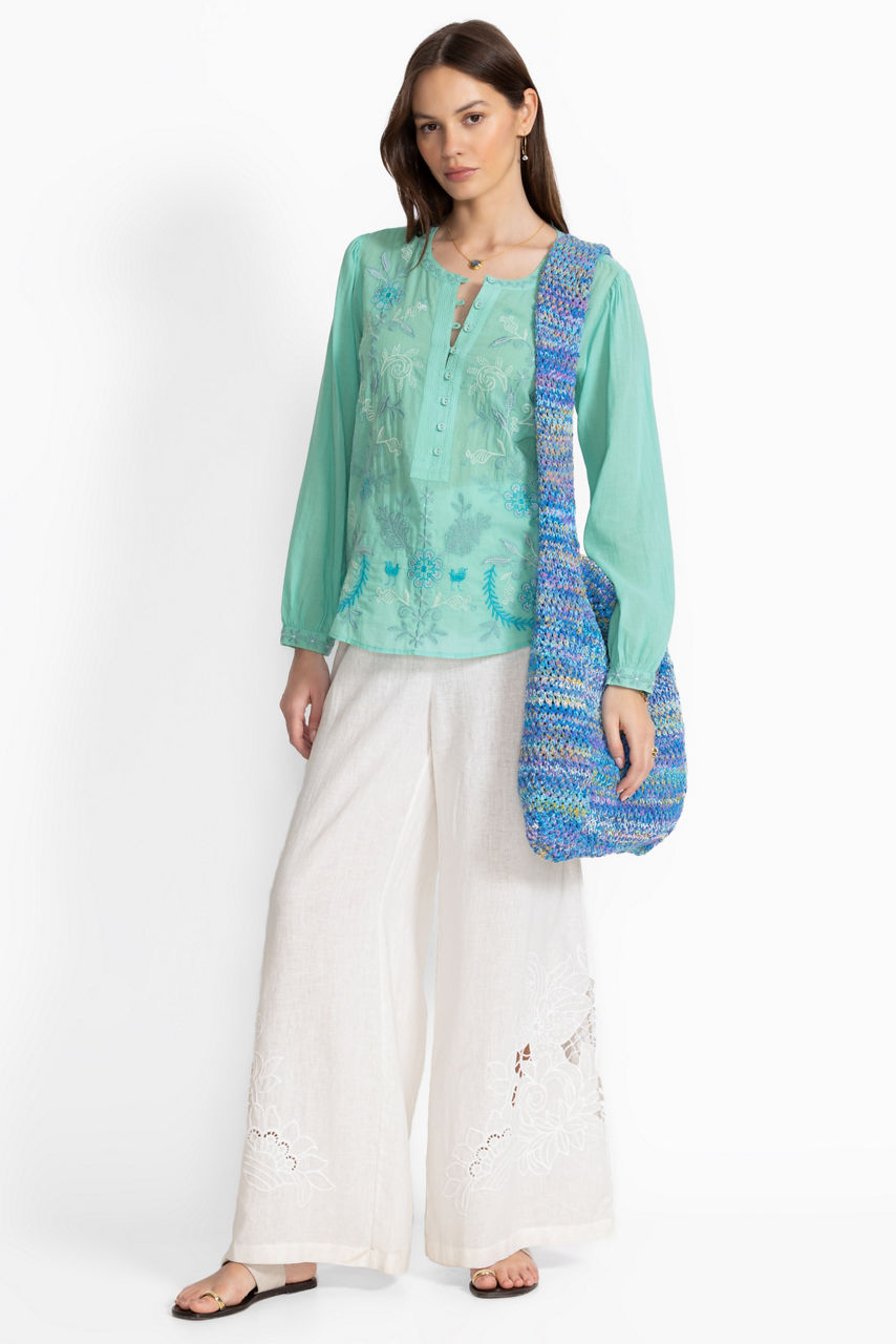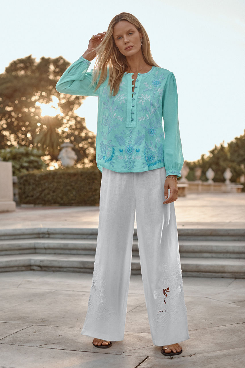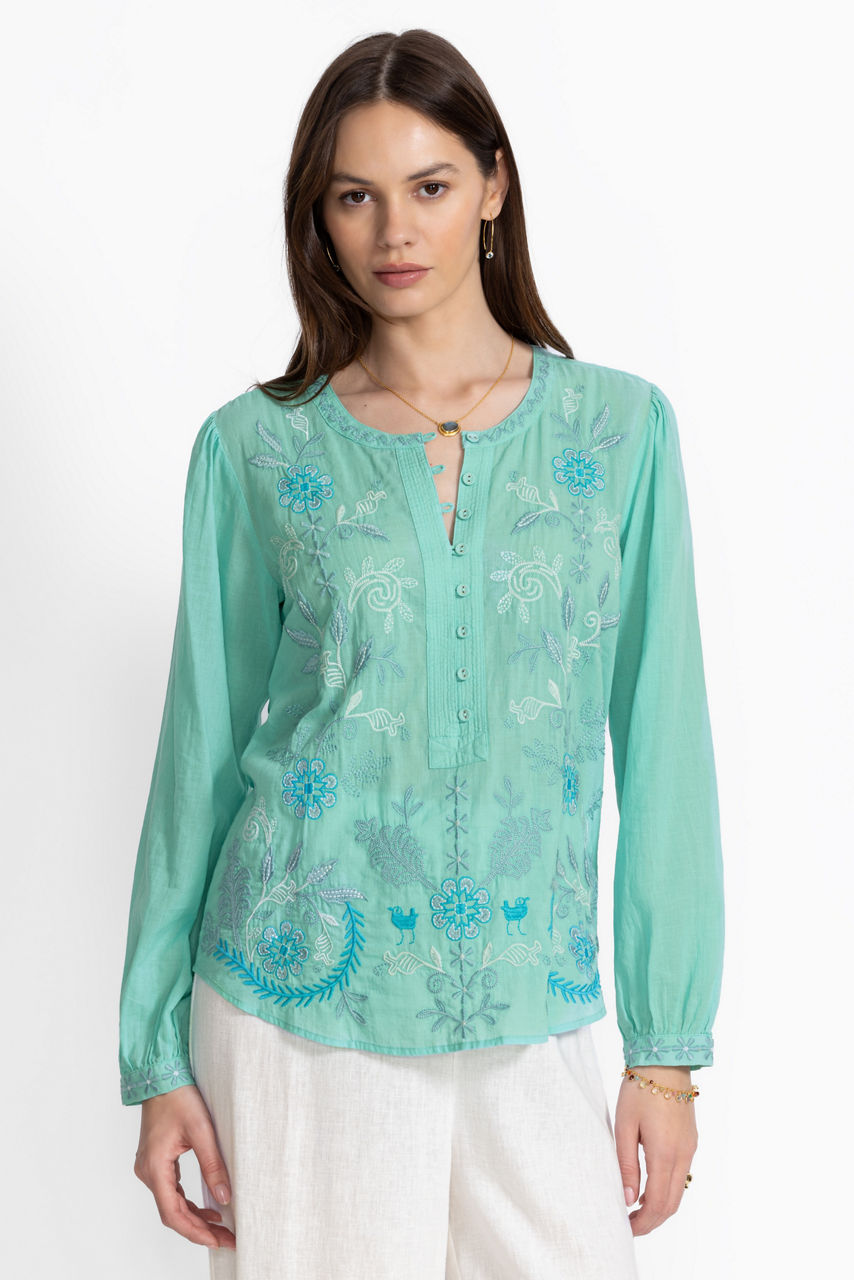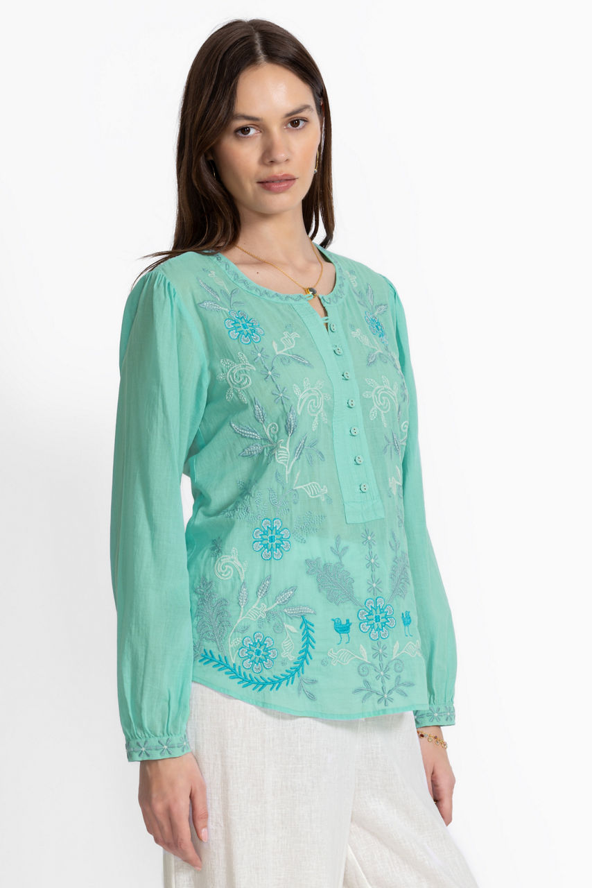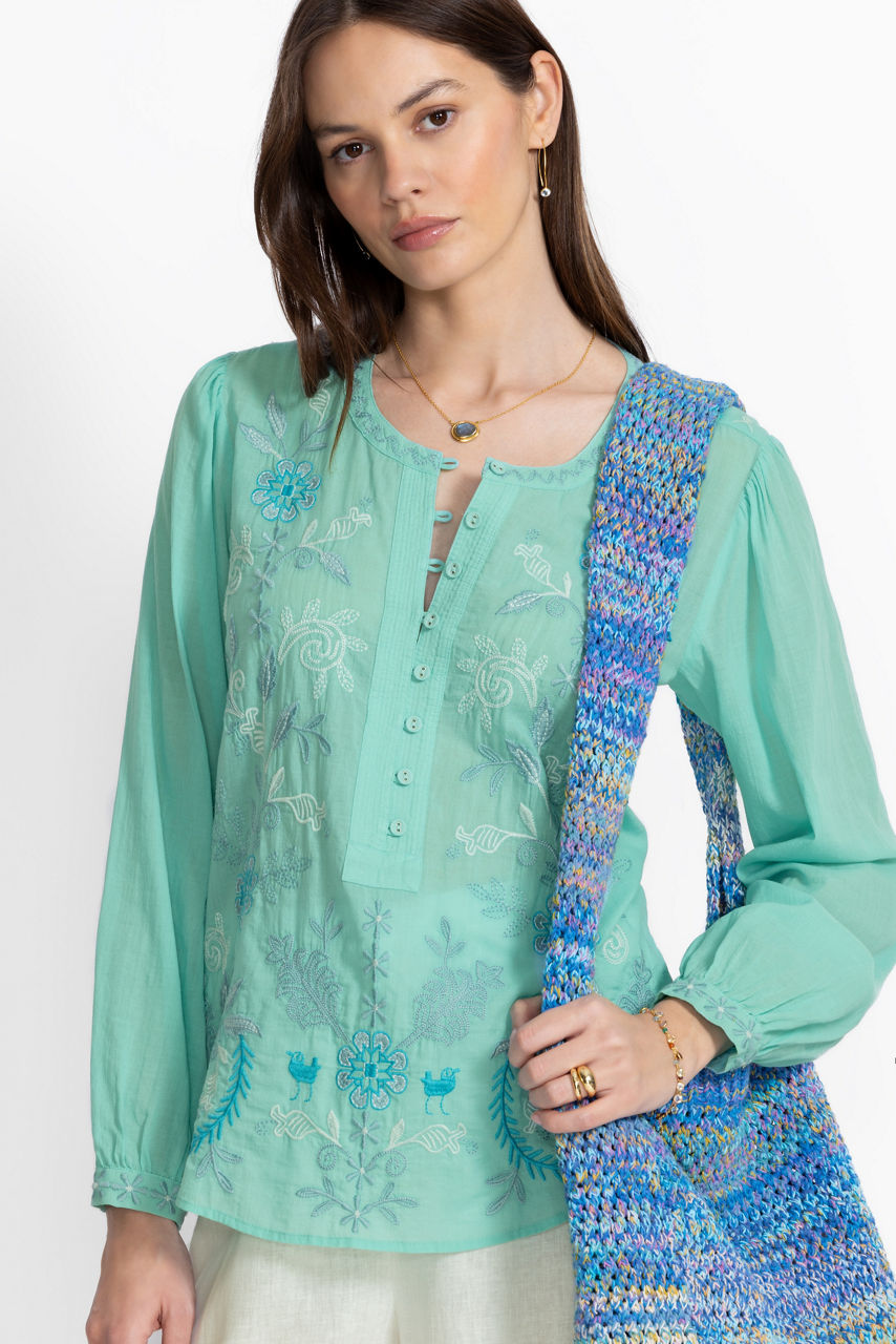 Thoughtfully adorned with beautiful embroidered detailing at the front and back yoke, the Field Henley Blouse adds a splash of eye-catching color to any look. Crafted from 100% breathable cotton, this blouse features gently puffed sleeves and gathers throughout and is finished with a relaxed bodice for a light airy feel. Pair with fitted denim and trendy ankle boots for a lunch date with friends.