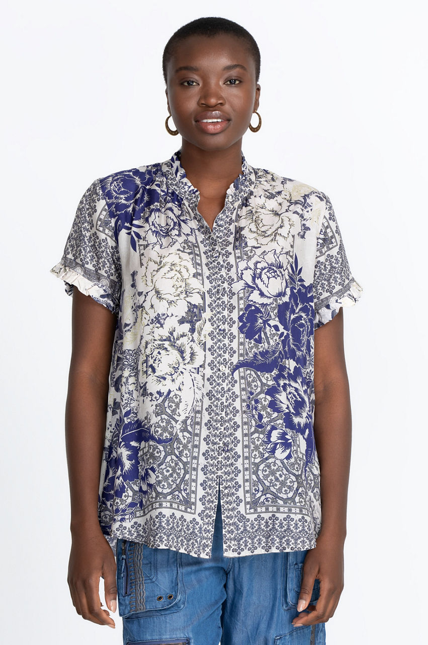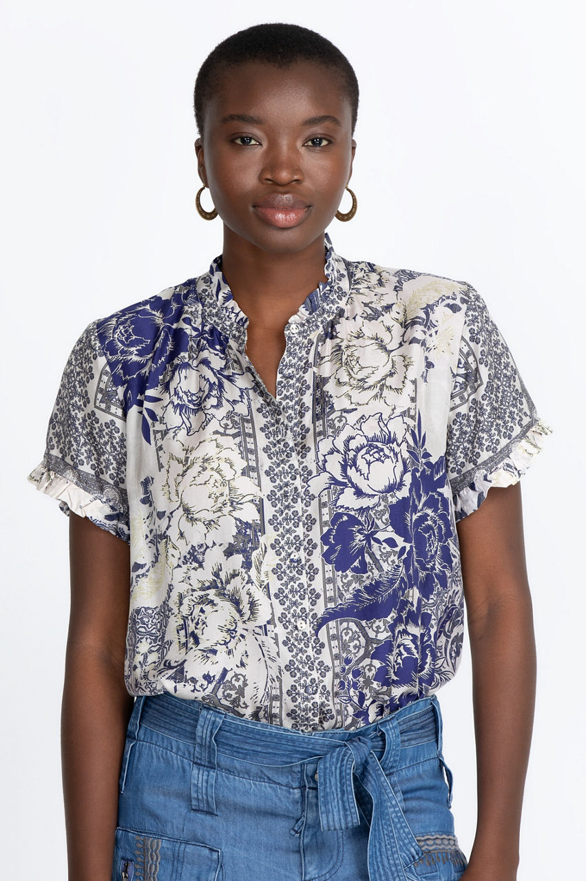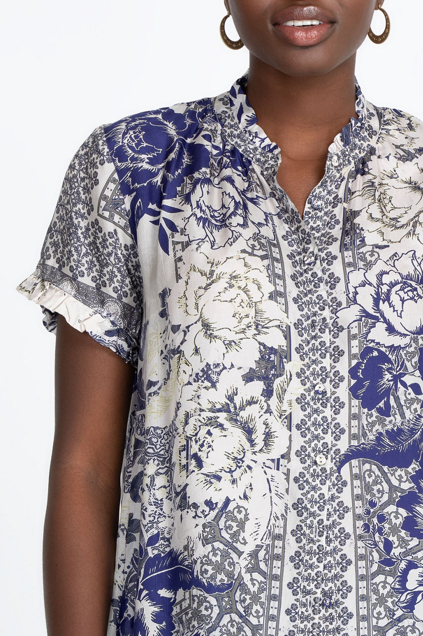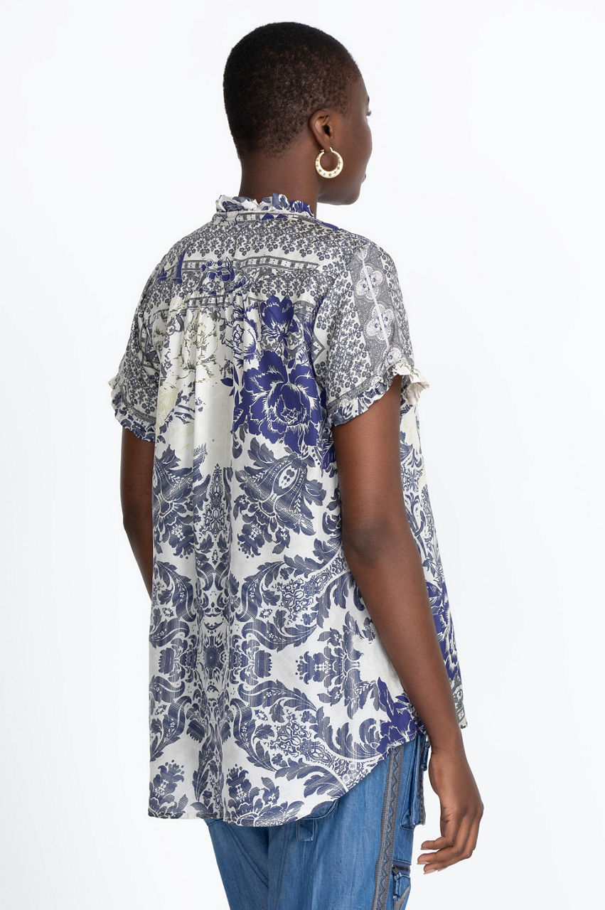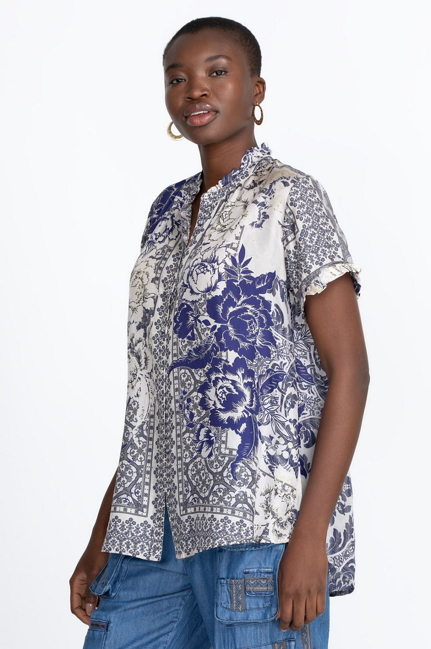 Pairing a vibrant floral motif and smooth silk material results in a sophisticated tunic. The discreet crimp detail on the collar and sleeves, the flowy and flattering silhouette, and the slightly asymmetrical hem make this piece a fashion must-have. The blue motifs will work well with denim for a monochromatic outfit.