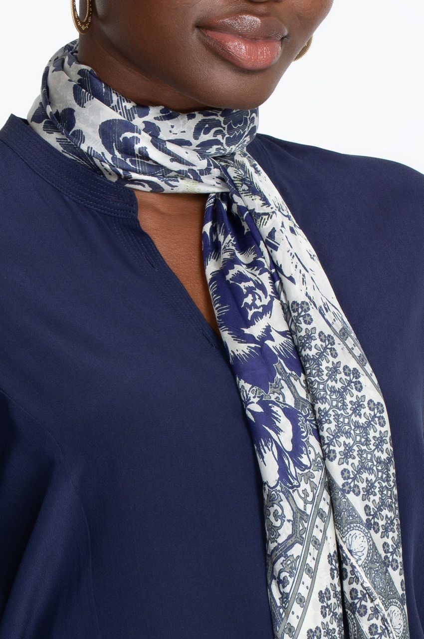 The Filo Scarf is an elegant accessory mix of neutral hues, muted tones, and vibrant blue colors. The floral and geometric designs come together to form a stunning motif that draws the eye toward the center of the piece. The blue overtones are great for complementing an outfit with denim and a classic white button-down top.