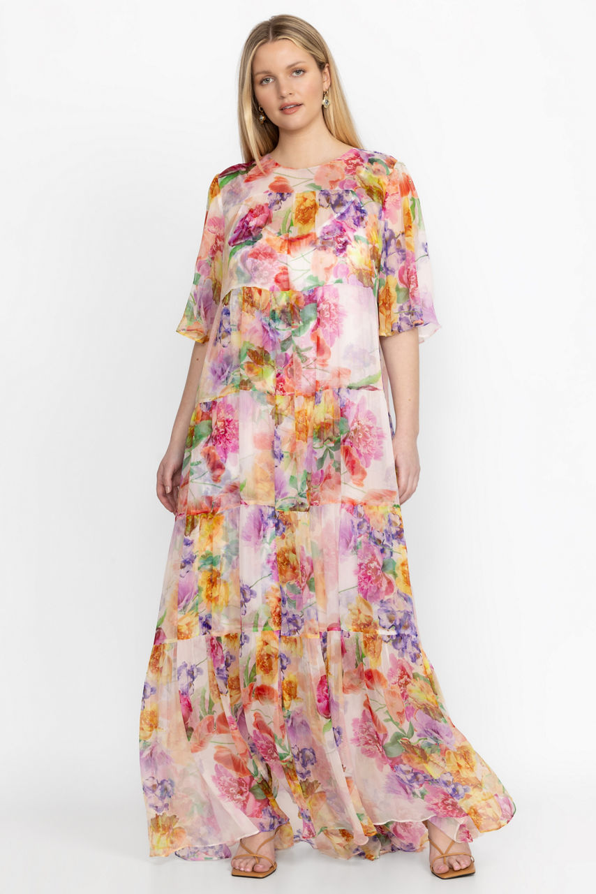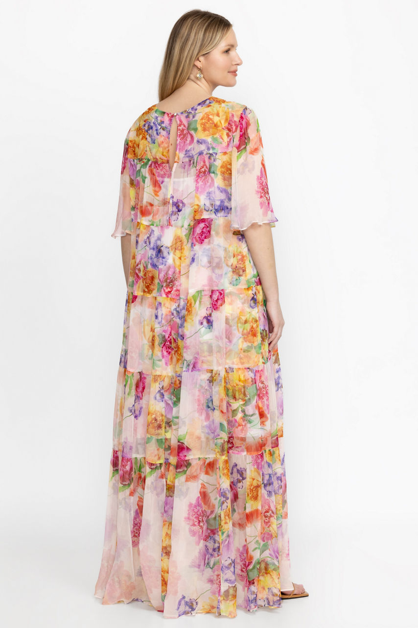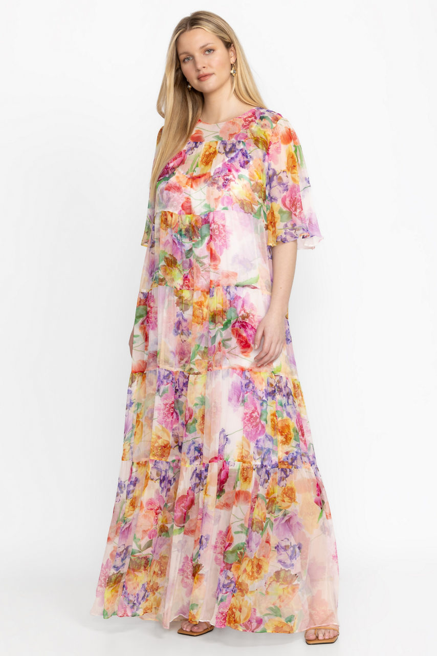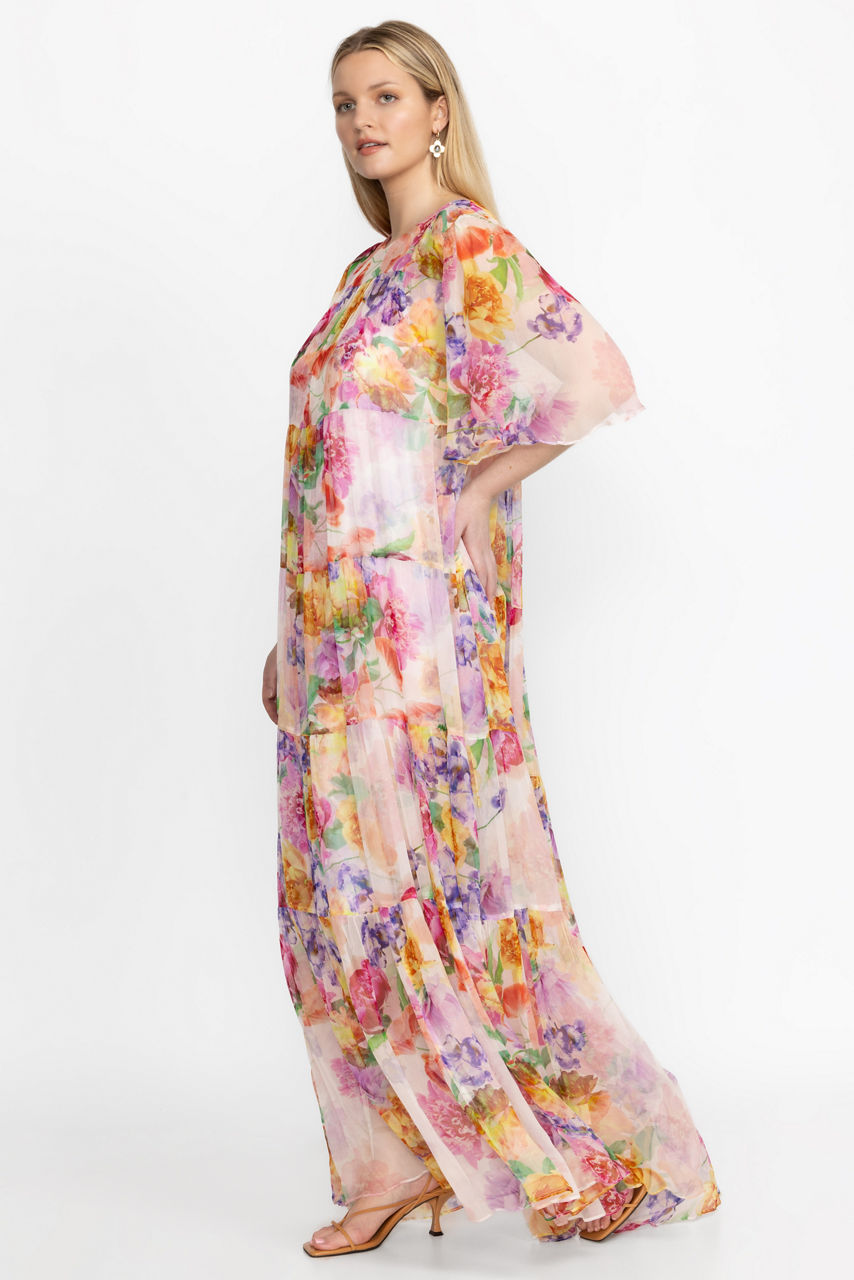Crafted from 100% flowing silk, the Fionna Silk Maxi Dress offers a brilliant pattern with a watercolor aesthetic. Featuring a rounded neckline and gently puffed sleeves, this slip-lined elegant maxi dress is accented with a keyhole back and long tiered skirt. Pair with a colorful clutch and strappy heels for an elegant daytime event.