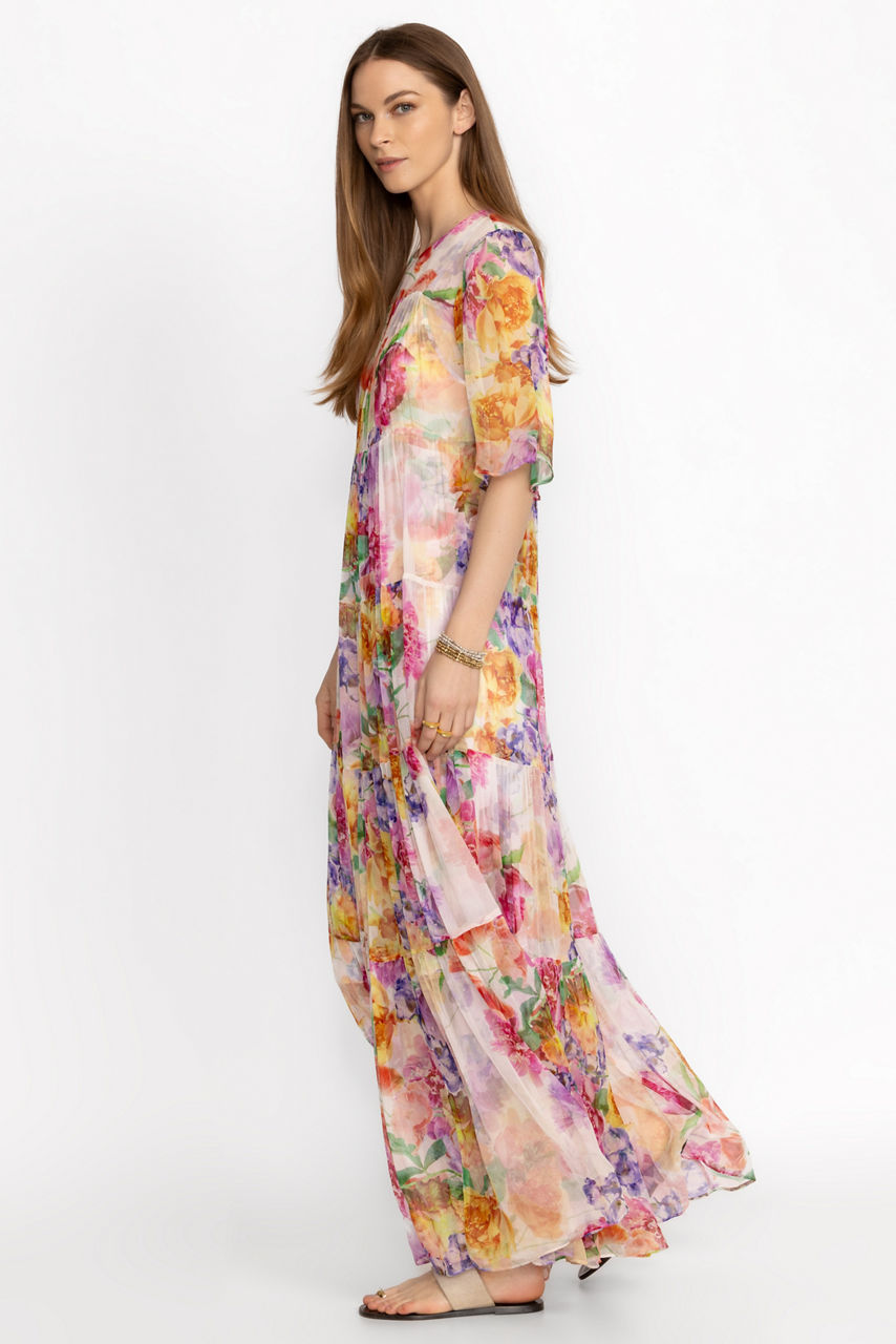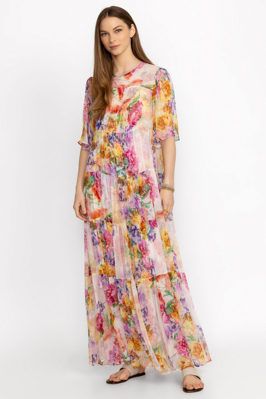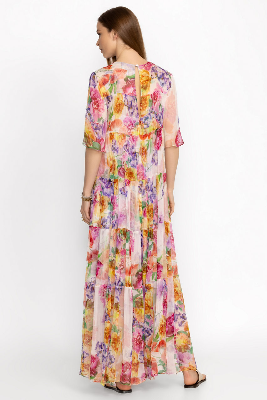 Crafted from 100% flowing silk, the Fionna Silk Maxi Dress offers a brilliant pattern with a watercolor aesthetic. Featuring a rounded neckline and gently puffed sleeves, this slip-lined elegant maxi dress is accented with a keyhole back and long tiered skirt. Pair with a colorful clutch and strappy heels for an elegant daytime event.