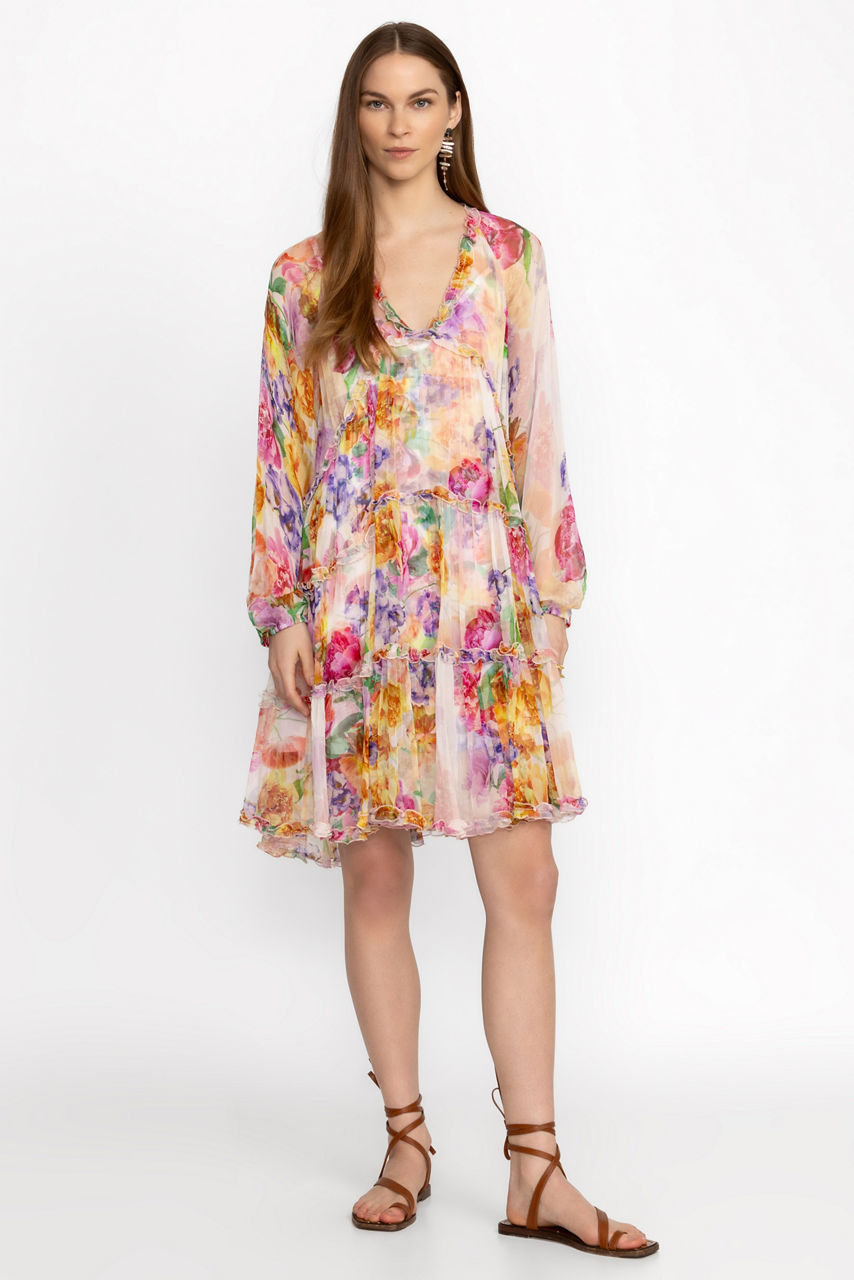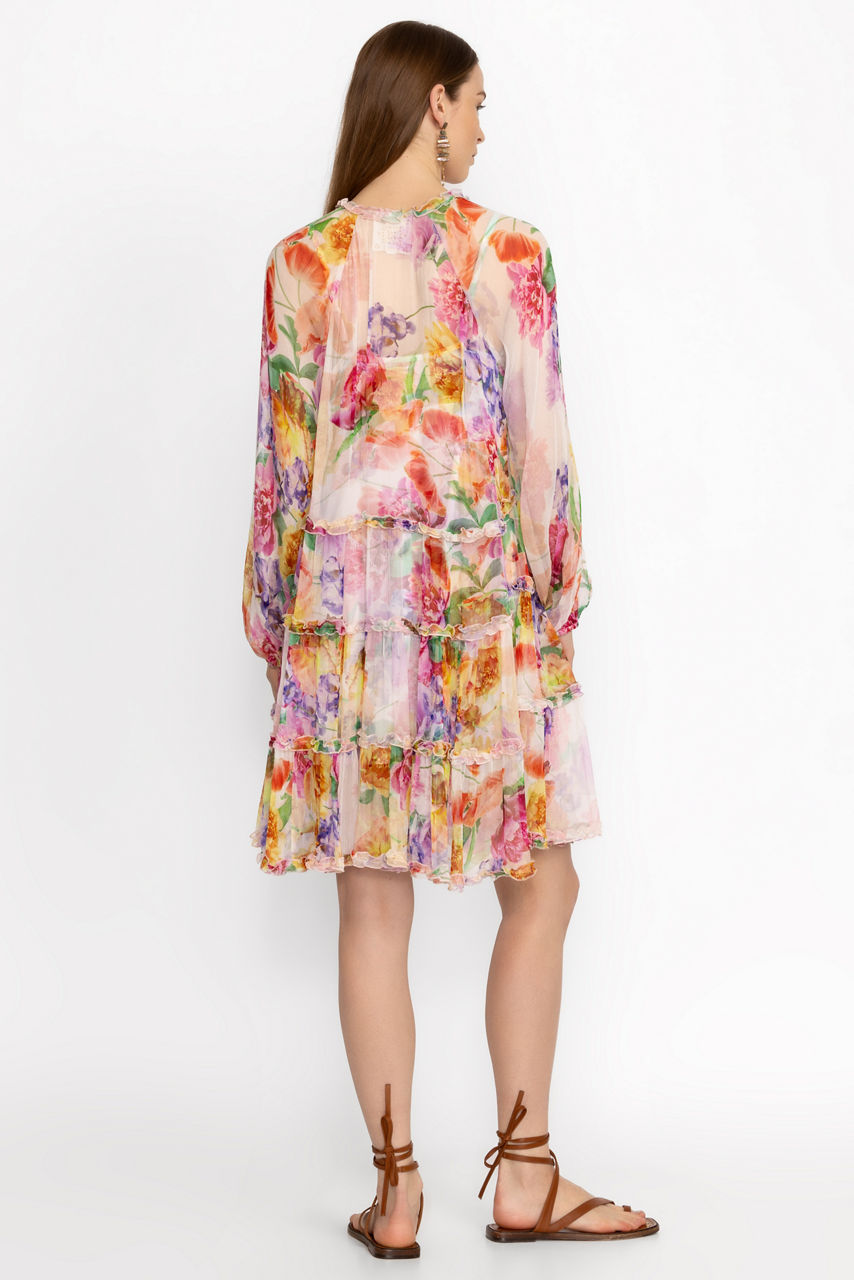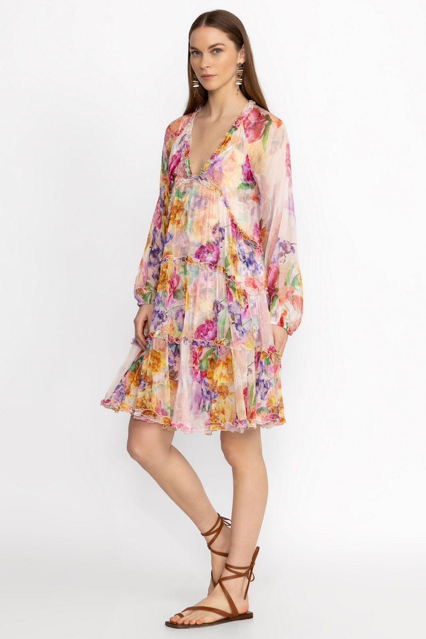 Crafted from 100% sumptuous silk, the Fionna Silk Mini Dress offers a brilliant pattern with a watercolor aesthetic. Featuring a deep V-neckline and gently puffed long sleeves, this slip-lined dress is accented with inverted V tiers and a slightly ruffled hemline. Pair with wedge espadrilles and a wide-brim sun hat for an elegant afternoon brunch.