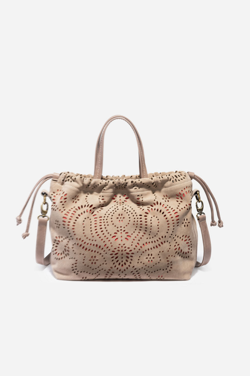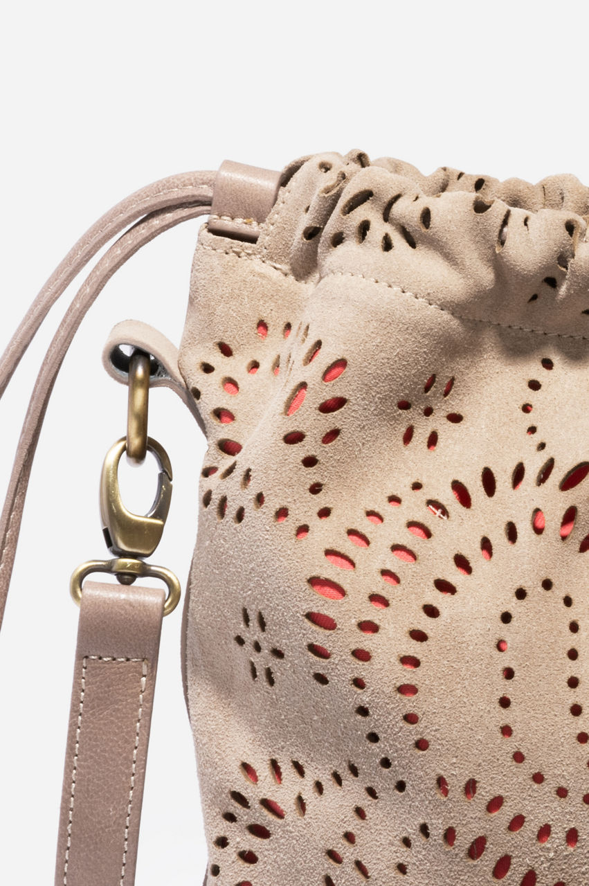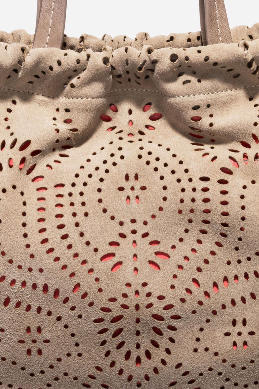 Instilled with a carefree charm, the Fiorie Mini Vanessa Bag is a functional yet stylish take on daily accessorizing. This bag is crafted from beige supple suede and features two top handles, a secure fastening, and intricate laser cutout detailing in red for a bold look. Pair with everything from breezy dresses to stylish tailoring and denim.