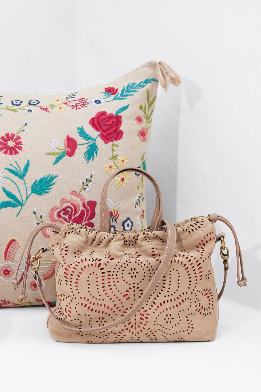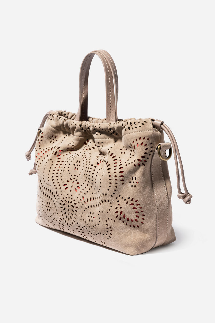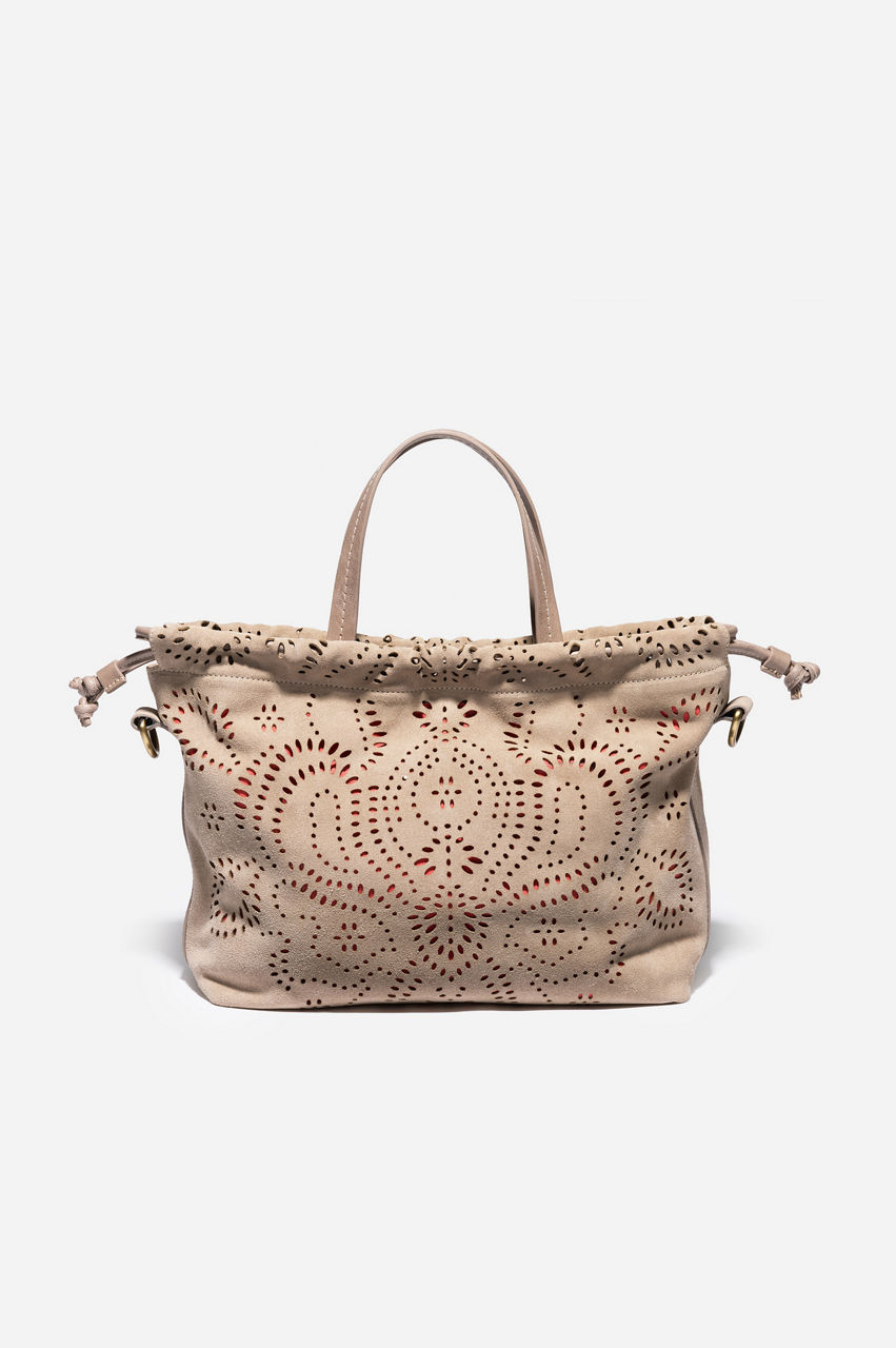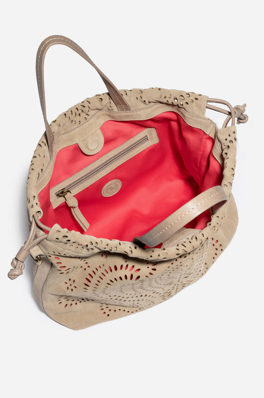 Instilled with a carefree charm, the Fiorie Mini Vanessa Bag is a functional yet stylish take on daily accessorizing. This bag is crafted from beige supple suede and features two top handles, a secure fastening, and intricate laser cutout detailing in red for a bold look. Pair with everything from breezy dresses to stylish tailoring and denim.