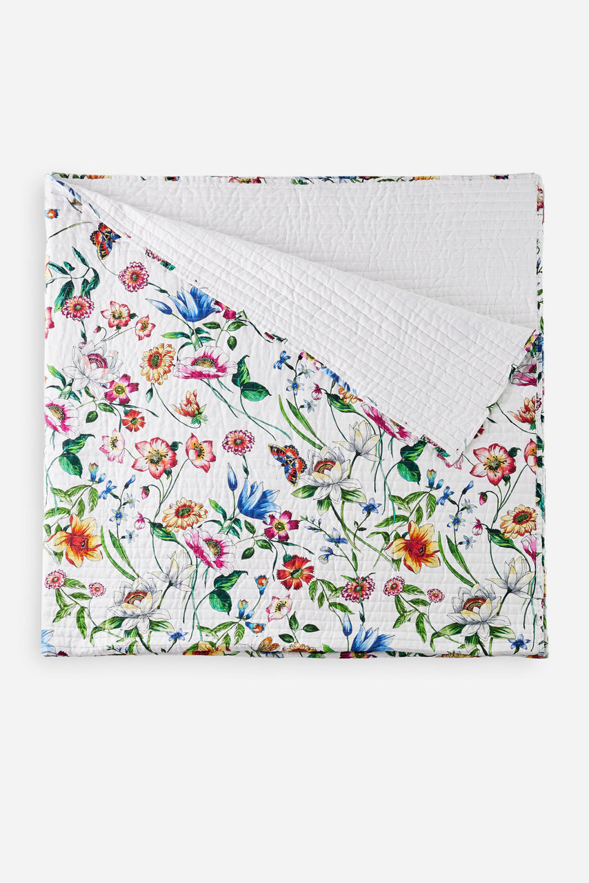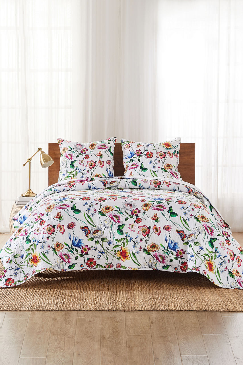 Crafted from a breathable cotton and linen blend, the Fiska King Quilt adds vibrant color and texture to any bedroom space. Featuring brilliant blooms displayed on a crisp white backdrop, this quilt offers a modern take on classic bedding. Pair with the Fiska Euro Shams for a coordinated bedding ensemble.