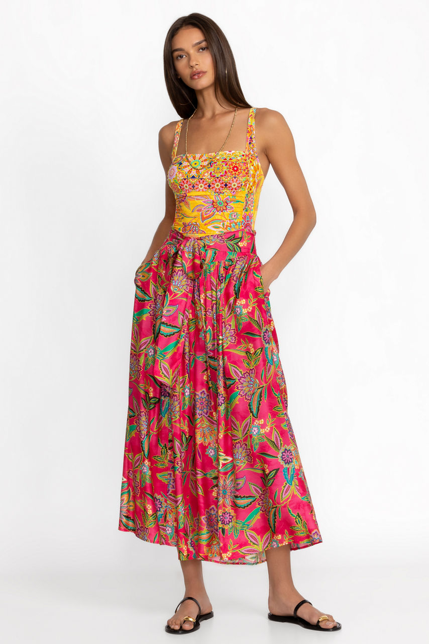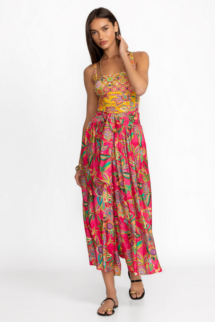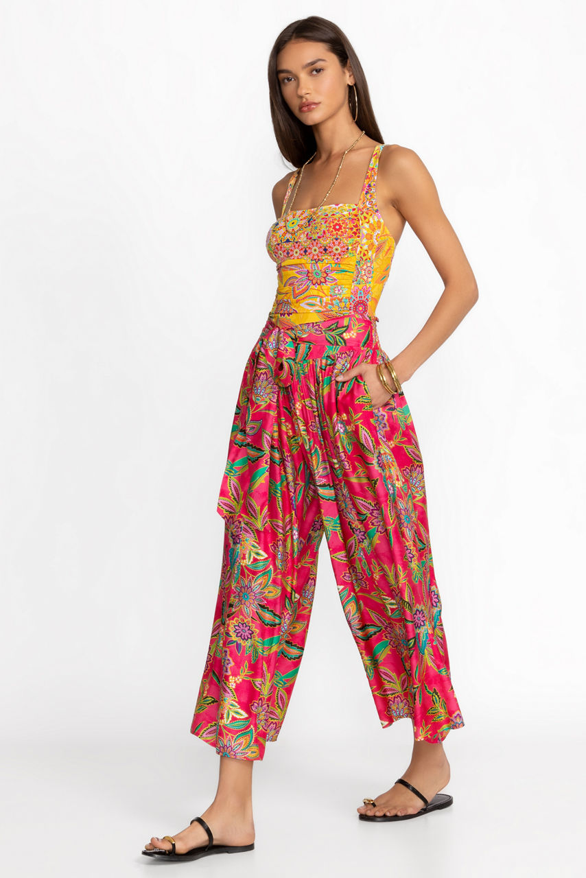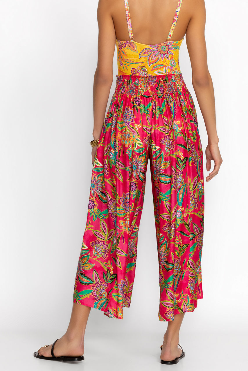 Crafted from a flowing silk blend, the Flamingo Palazzo Cropped Pants add a splash of color to your resort look. Featuring a contoured waistband with a sewn-in self tie, these pants are completed with a relaxed leg line for unmatched comfort. Pair with the Flamingo Tankini top for a polished look that can go from brunch to poolside.