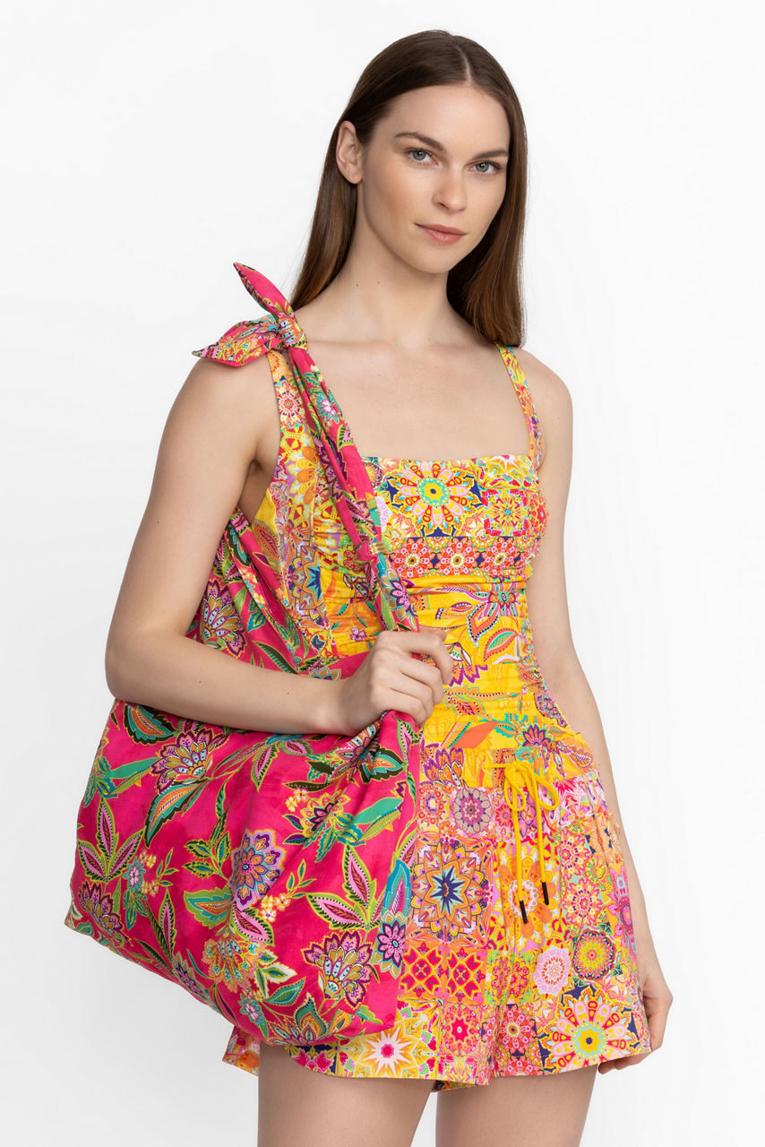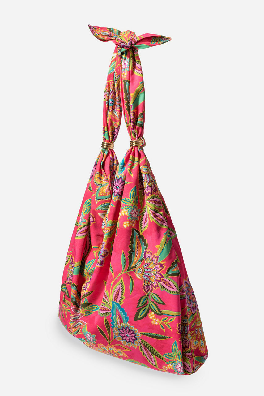 Beautifully detailed with vibrant blooms, the Flamingo Ring Beach Bag is both functional and fun. Featuring a casually knotted shoulder strap and boldly patterned hobo style, this bag offers a metal snap closure and a zippered interior pocket. Pair with a white linen top and flowing palazzo pants for a sunny day.