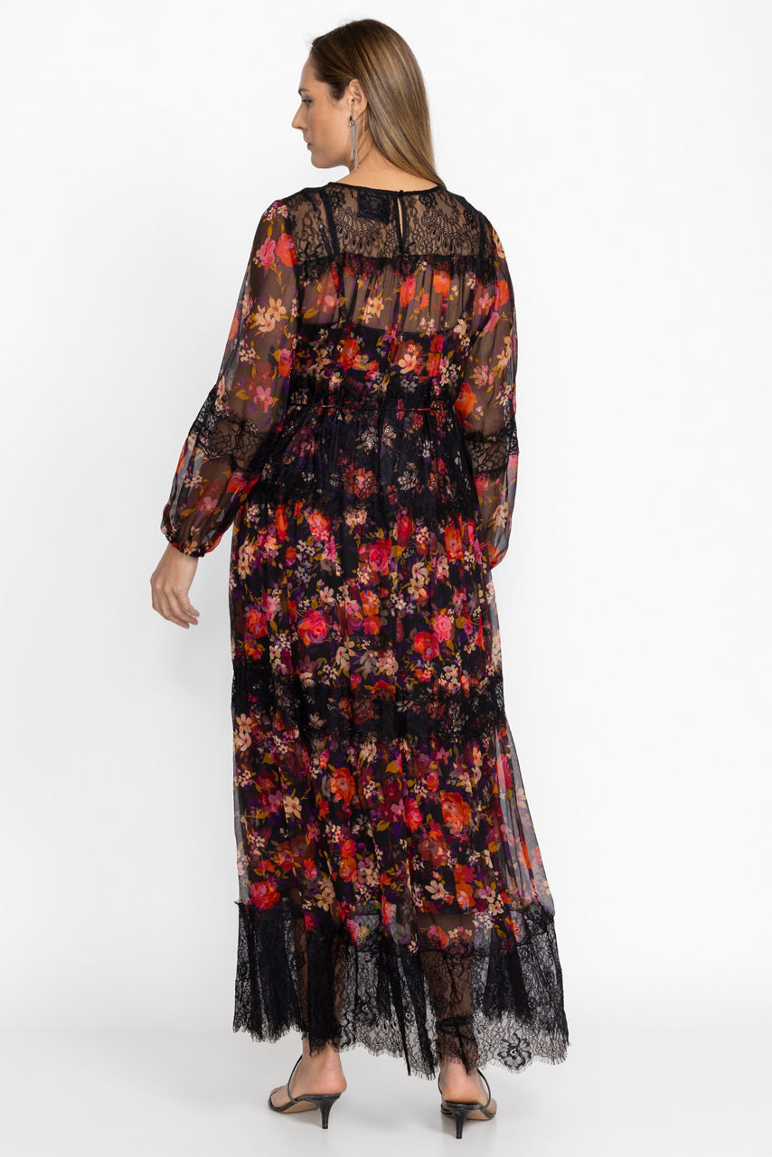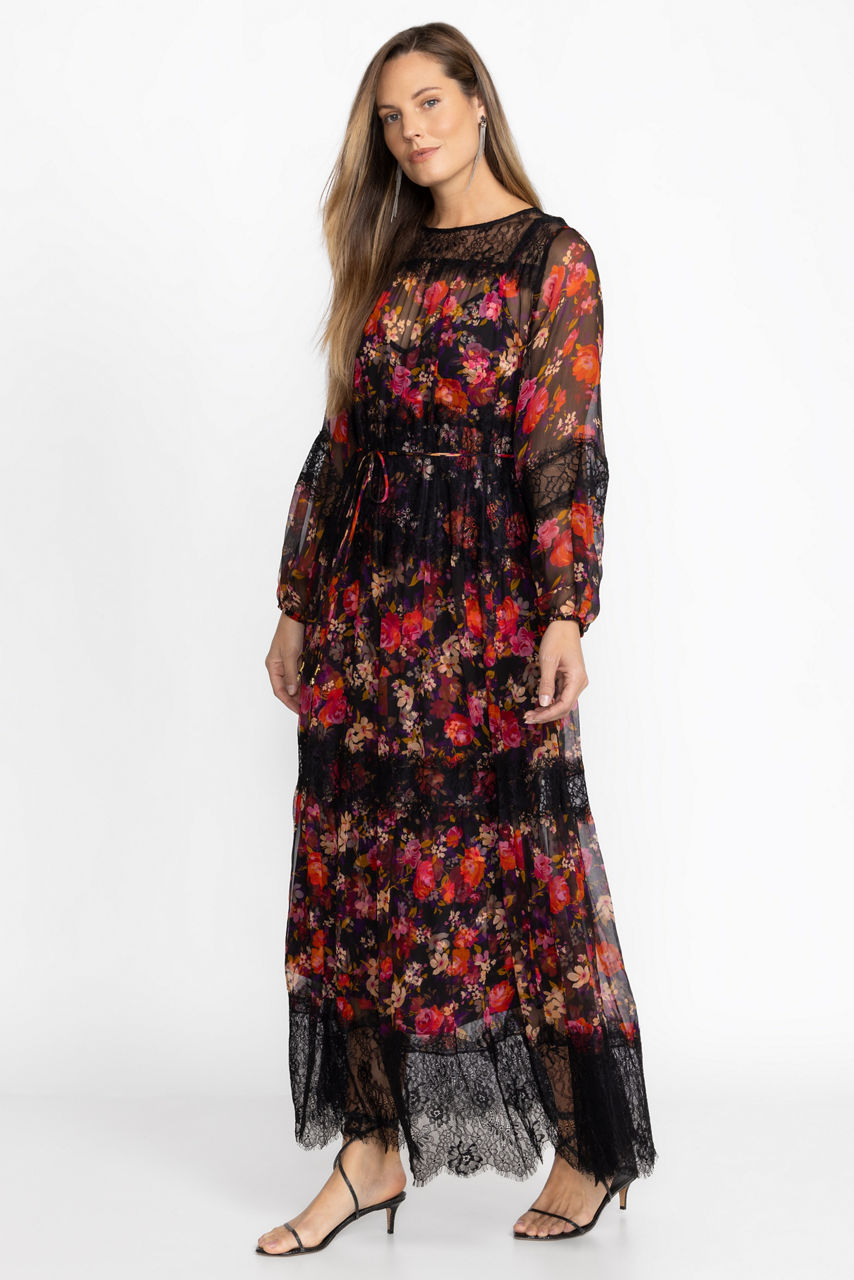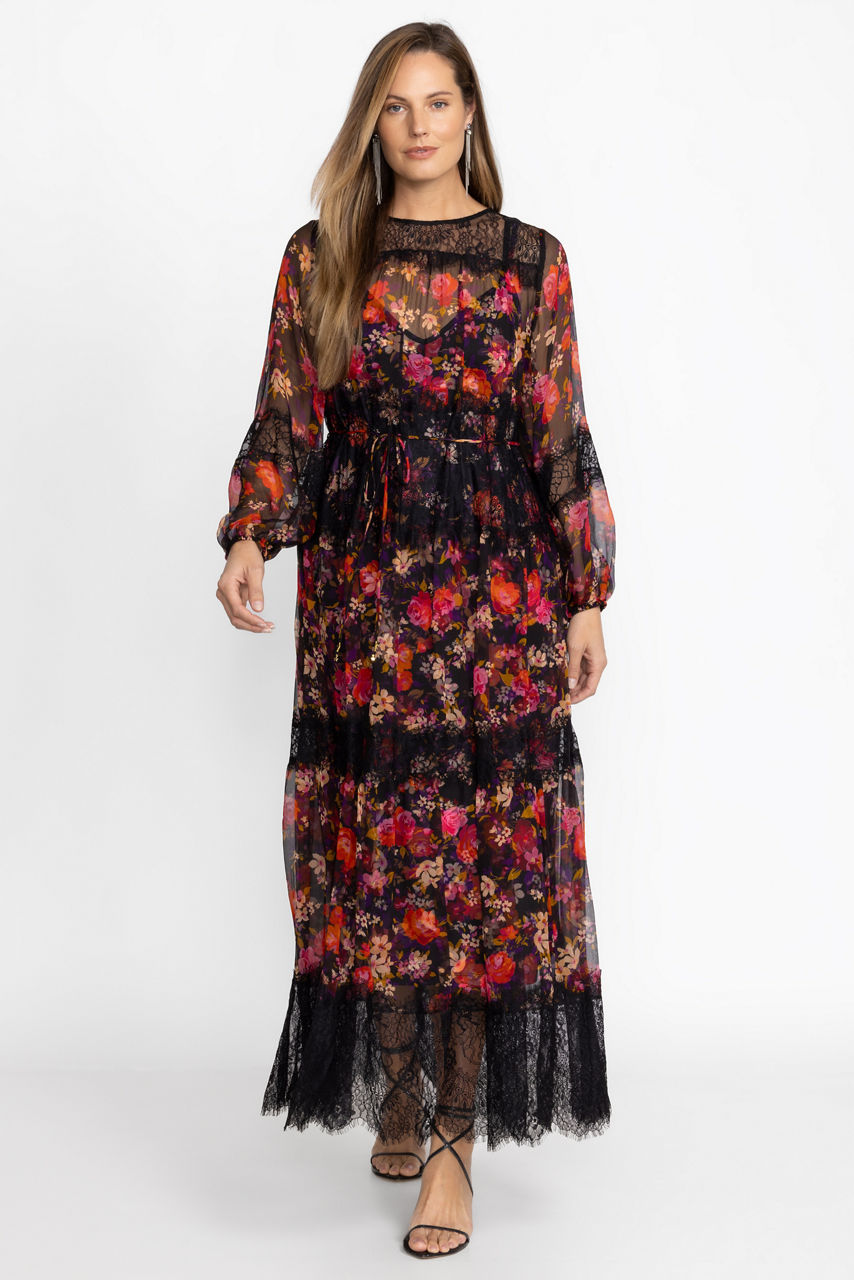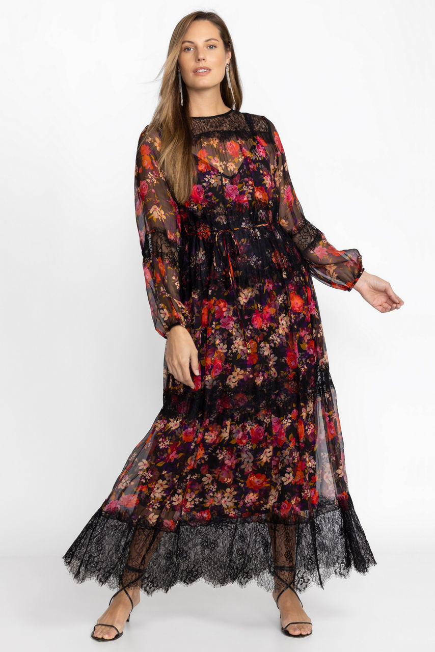 Spun from sumptuous silk, the Flora Silk Maxi Dress charms with its open blooms. Falling to a maxi length, this dress features crystal shank buttons, elastic sleeve cuffs, lace insets, a separate slip, a colorful floral pattern, and a drawstring at the waist to define the silhouette. Wear this silk maxi dress with sandals and simple accessories for a versatile warm-weather look.