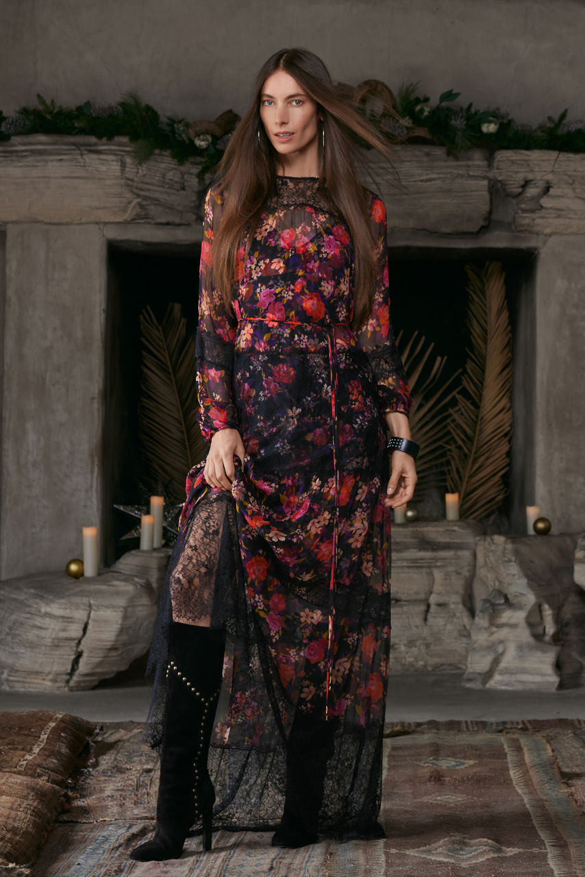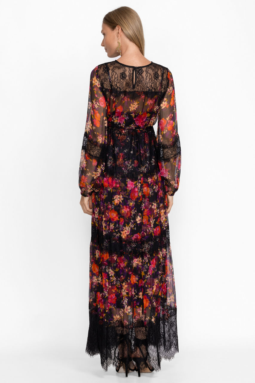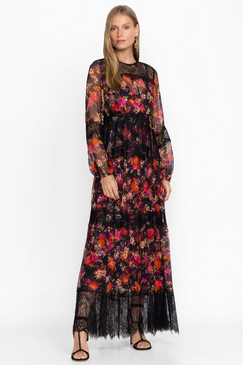 Spun from sumptuous silk, the Flora Silk Maxi Dress charms with its open blooms. Falling to a maxi length, this dress features crystal shank buttons, elastic sleeve cuffs, lace insets, a separate slip, a colorful floral pattern, and a drawstring at the waist to define the silhouette. Wear this silk maxi dress with sandals and simple accessories for a versatile warm-weather look.