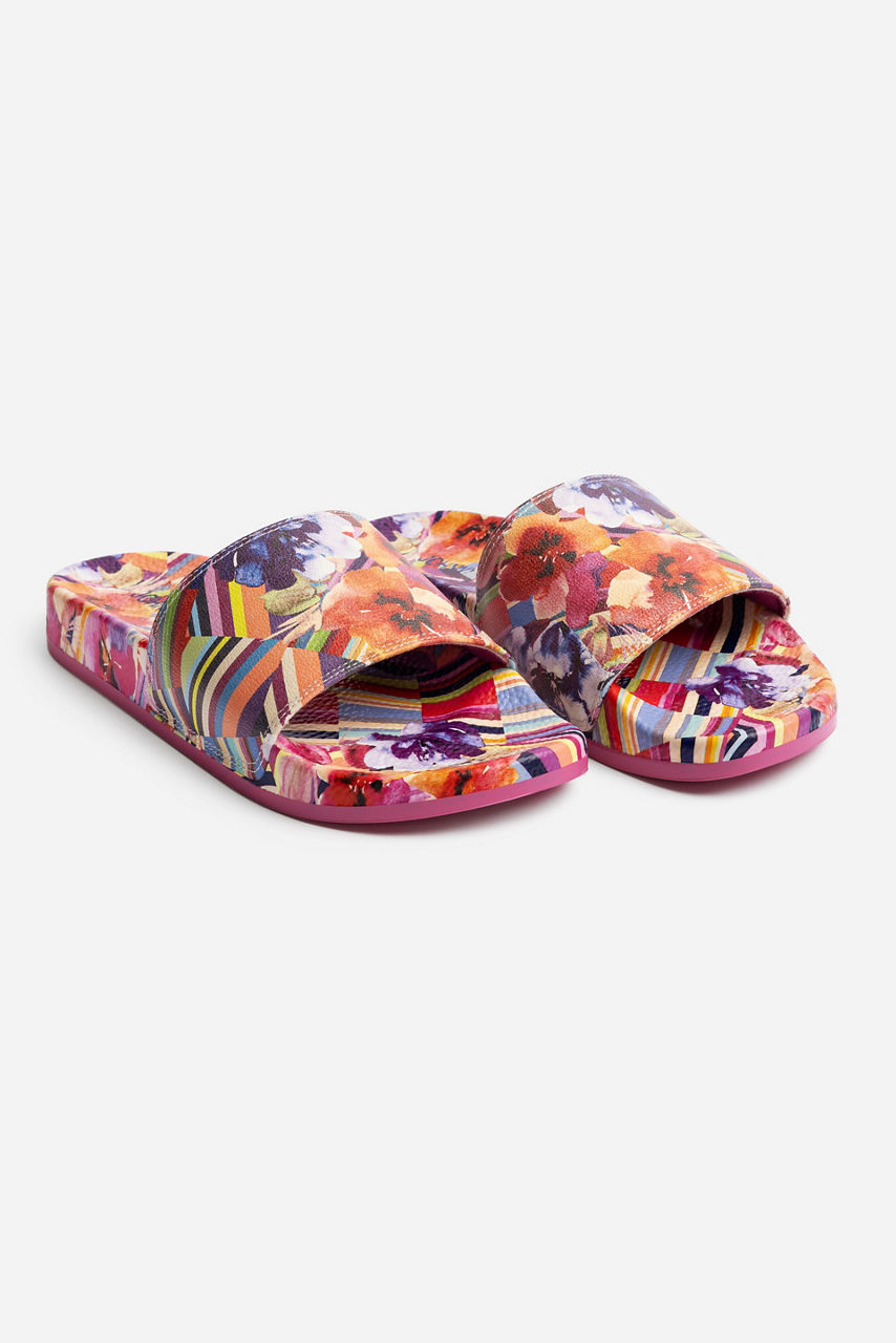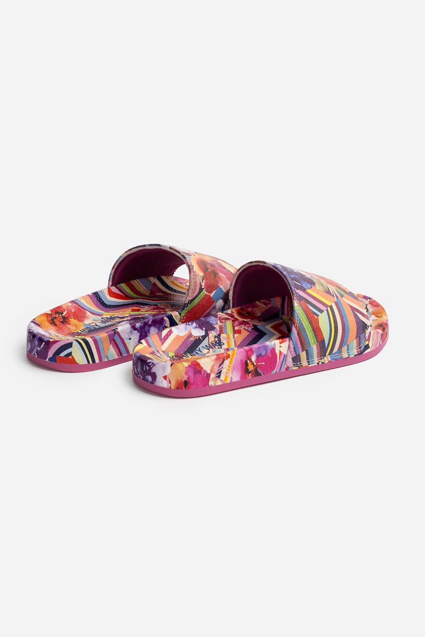 Add vivid color to your summer pool days with the Floral Strip Pool Slide. Featuring a blue sole and green upper cover, these slides are adorned in picturesque pink flowers. Pair with a light blue swimsuit for a coordinated look.
