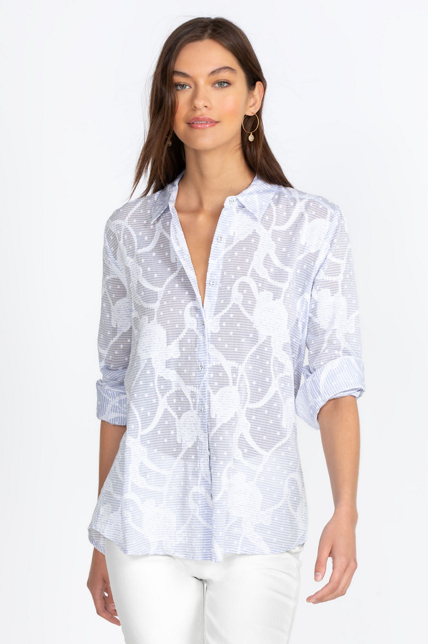 Perfect for the spring or summer season, our Flore Seersucker Button-Down Shirt is a smart addition to a woman s wardrobe, featuring a detailed pattern, fitted long sleeves and a feminine neckline for a slimming silhouette. Pair with denim jeans for a casual look or with a fitted skirt for a day at the office.