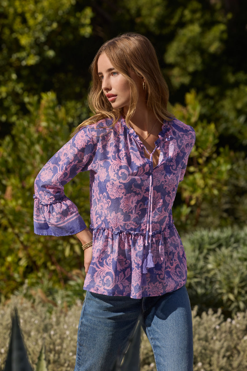 Beautifully adorned with bold colorful blooms, the Florentina Ruffle Lake Blouse takes casual styling to the next level. Crafted from 100% breathable cotton, this stunning button-front blouse features a 3/4 sleeves with gathers and pintuck detailing throughout and is finished with intricate embroidered details for a polished finished look. Pair with a navy skirt and colorful kitten heels for a lovely brunch ensemble.