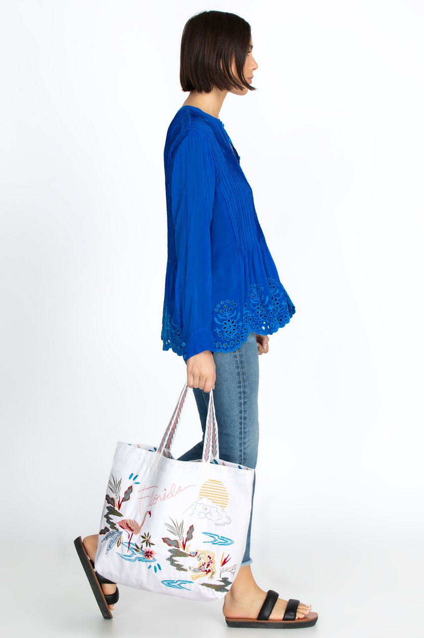 Demonstrating bold color bursting with lively scenes, the Florida Everyday Tote is the perfect way to celebrate the "Sunshine State". Crafted from 100% cotton with a spacious interior, this colorful embroidered tote offers a bit of whimsy to your daily look. Pair with a bold top and neutral shorts for a day poolside with friends.