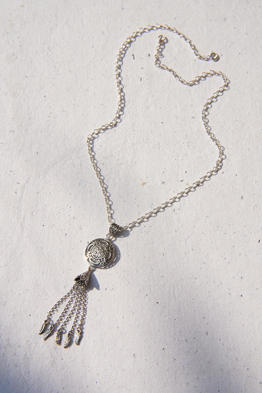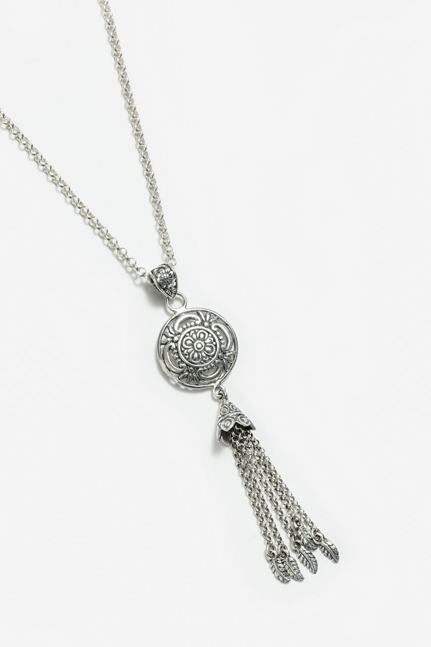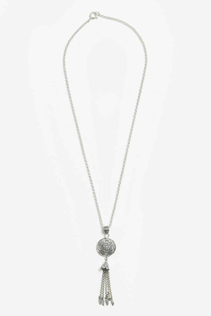Handcrafted from sterling silver, the Flower Bell Necklace is embellished with intricate metal work. Based on a traditional lariat design, this necklace features an ornate circular pendant detailed with floral details in both polished and oxidized silver leading to chain tassels at the base. Layer over a turtleneck top and pair with a metallic skirt for a fresh girls' night out look.
