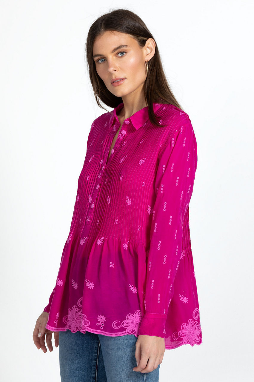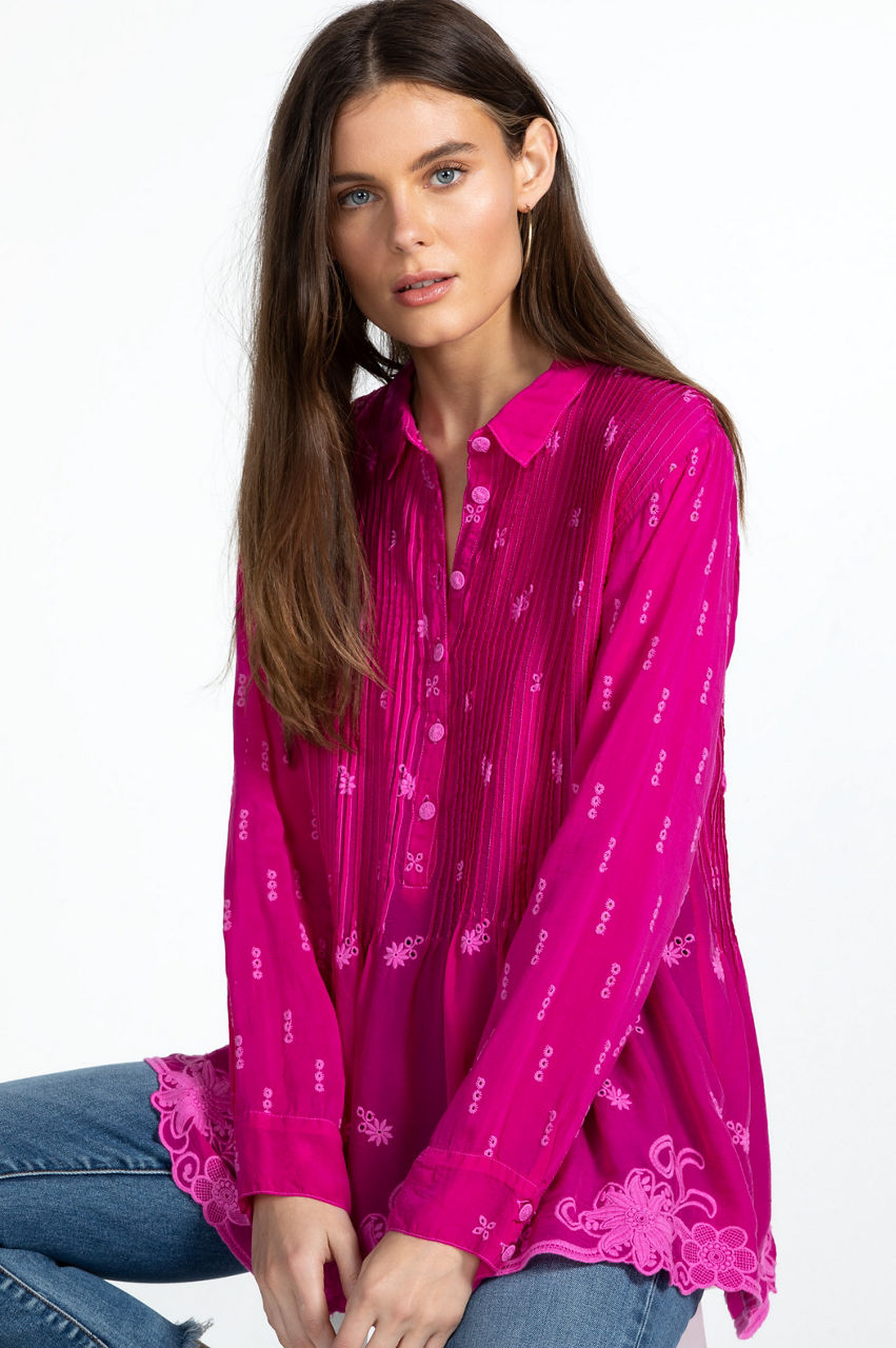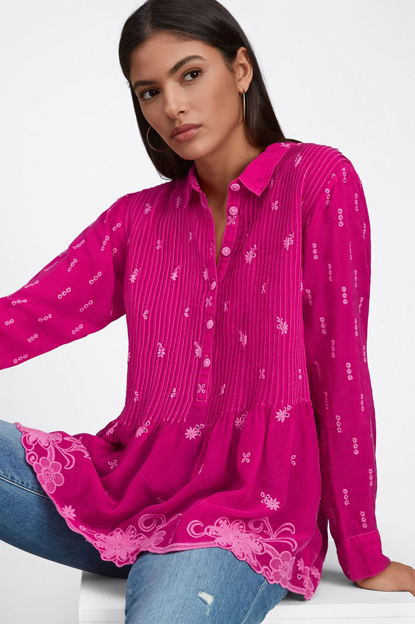 Equal parts sophisticated and elegant, the Flower Zoyla Blouse evokes feelings of wanderlust. A statement-making take on classic shirting, this blouse is spun from rayon with a collar, a front button closure, button cuffs, gathering at the waist, and a detailed eyelet embroidery complete with a scalloped hem. Team with jeans for a stylish bohemian ensemble.