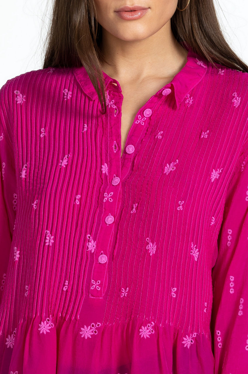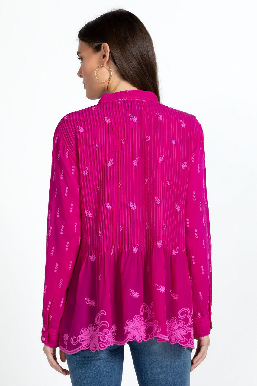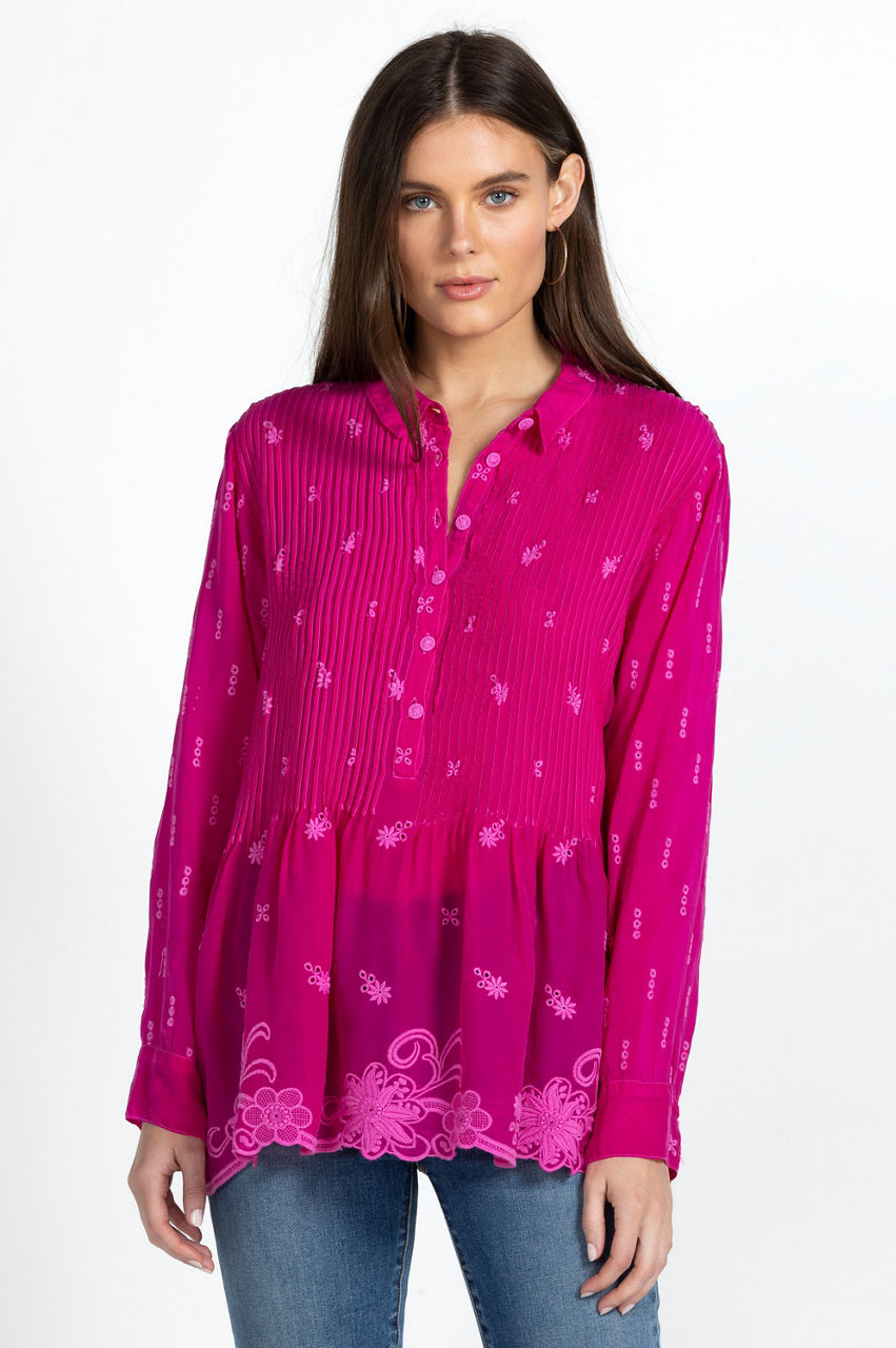 Equal parts sophisticated and elegant, the Flower Zoyla Blouse evokes feelings of wanderlust. A statement-making take on classic shirting, this blouse is spun from rayon with a collar, a front button closure, button cuffs, gathering at the waist, and a detailed eyelet embroidery complete with a scalloped hem. Team with jeans for a stylish bohemian ensemble.