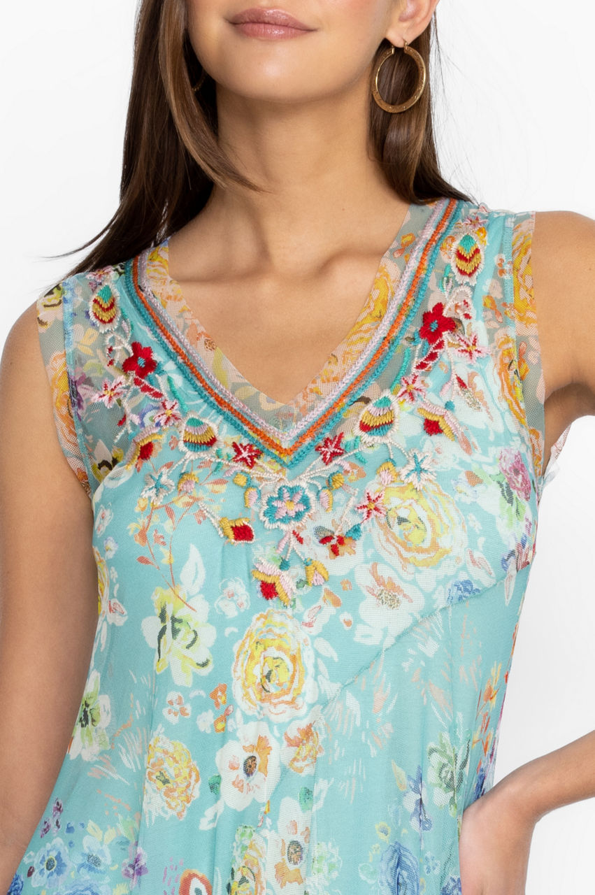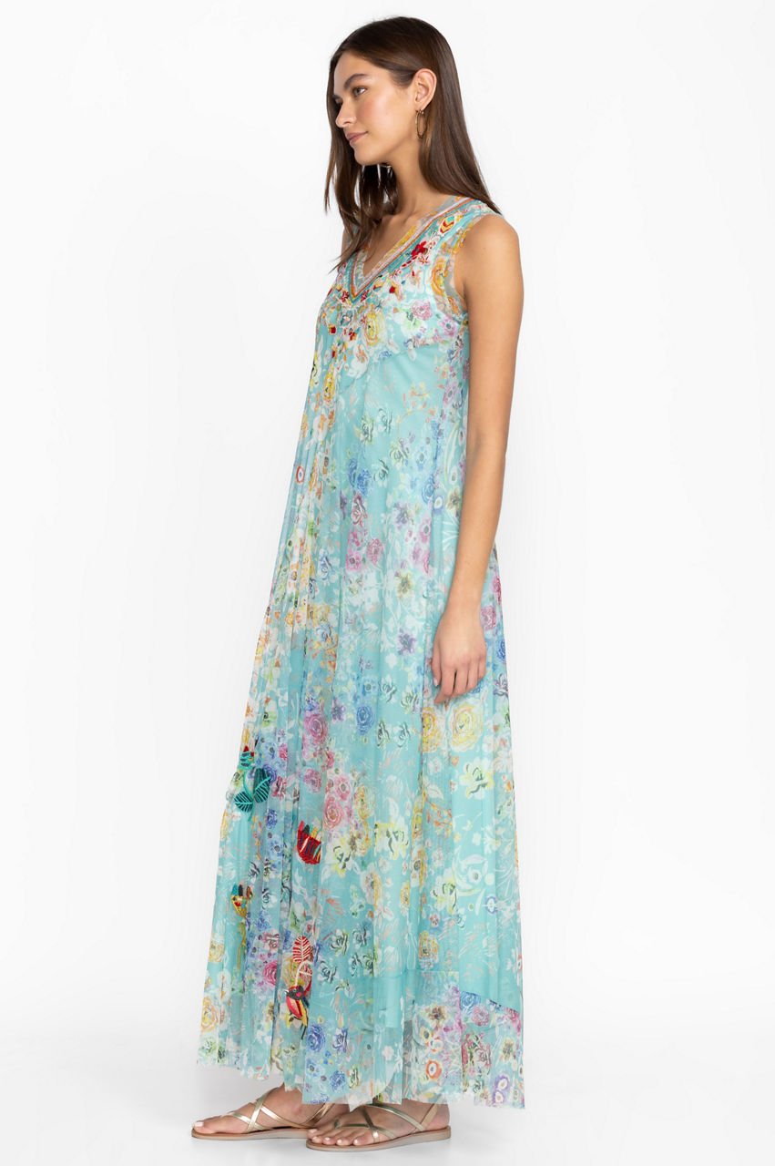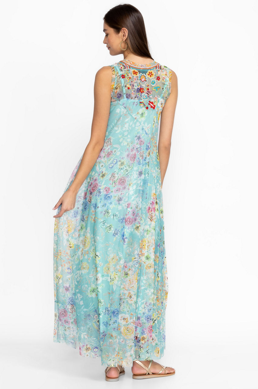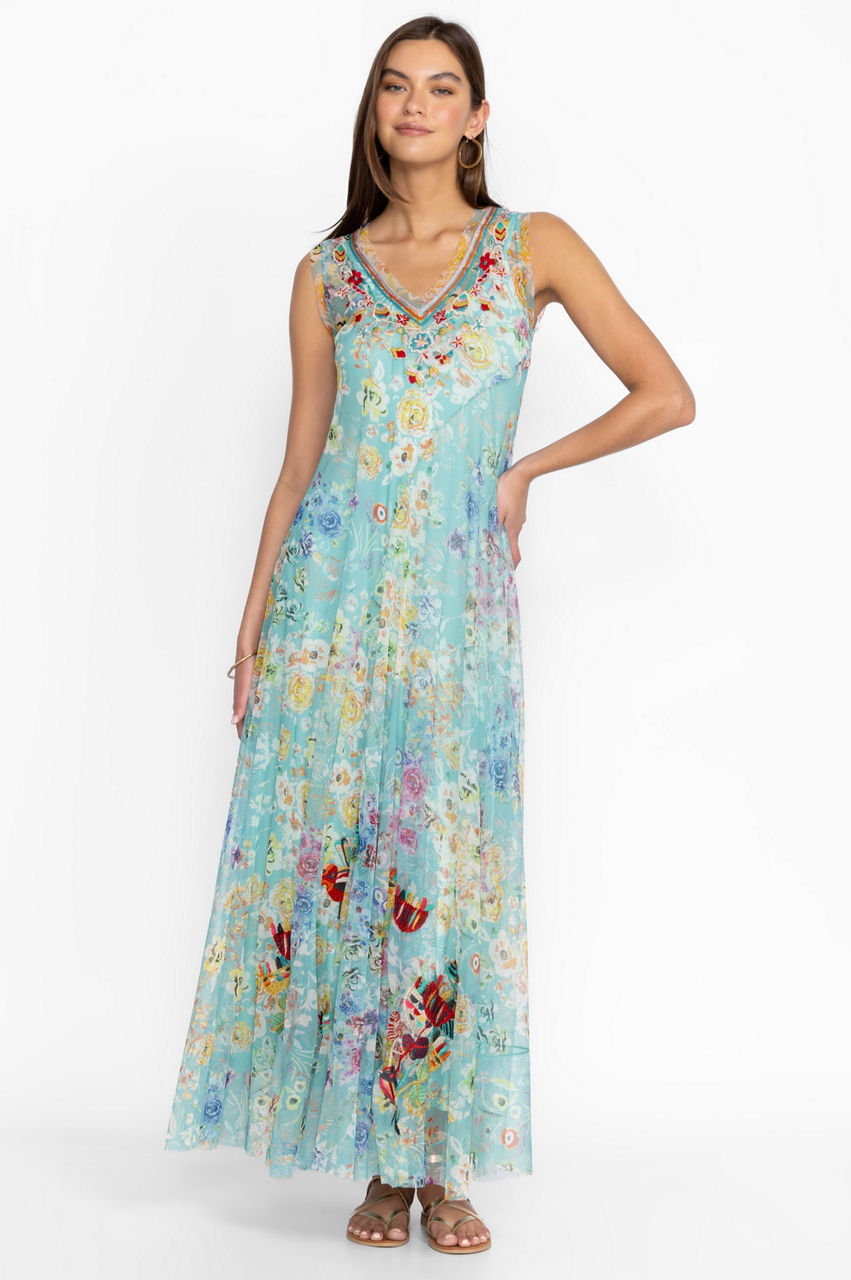 Underscored with subtle elegance, the Forever Flower Mesh Dress marries contemporary details with timeless feminine charm. Crafted from a lightweight mesh material, this dress falls to a maxi length and boasts a V-neck, a paneled design, and a placement embroidery of fresh flowers in bright shades. Pair with flats or dress up with heels in the evening.