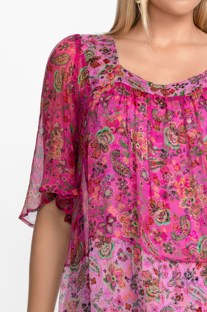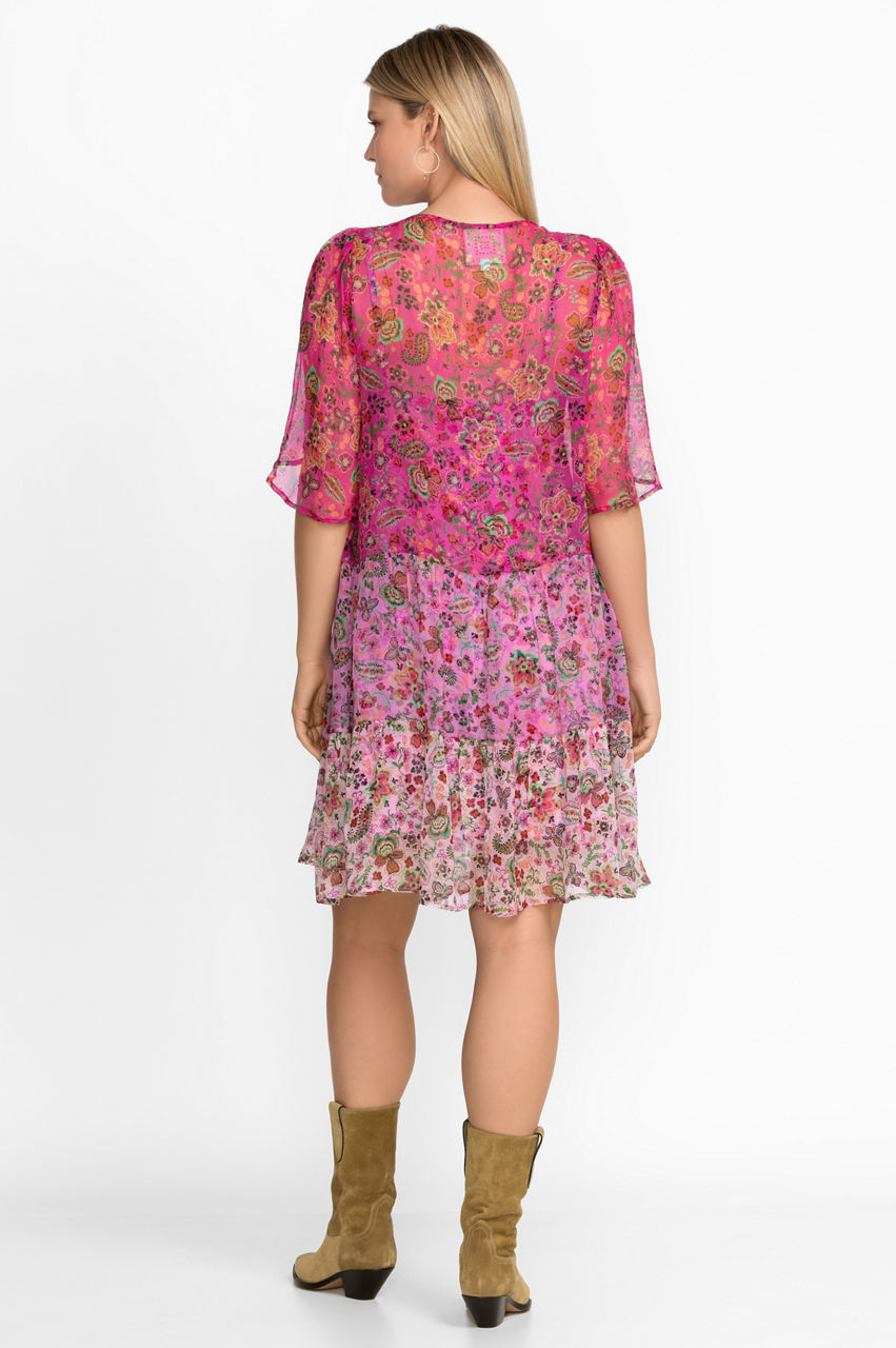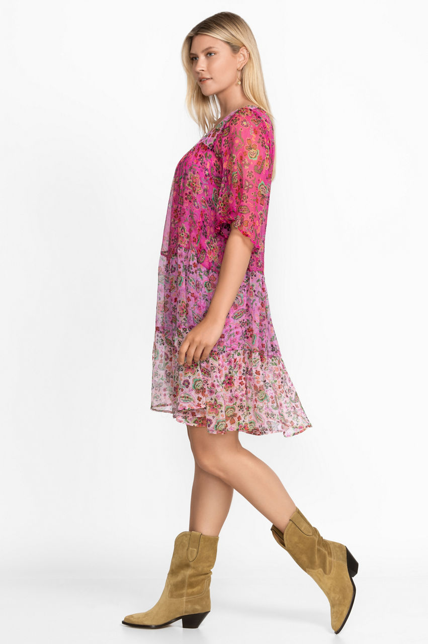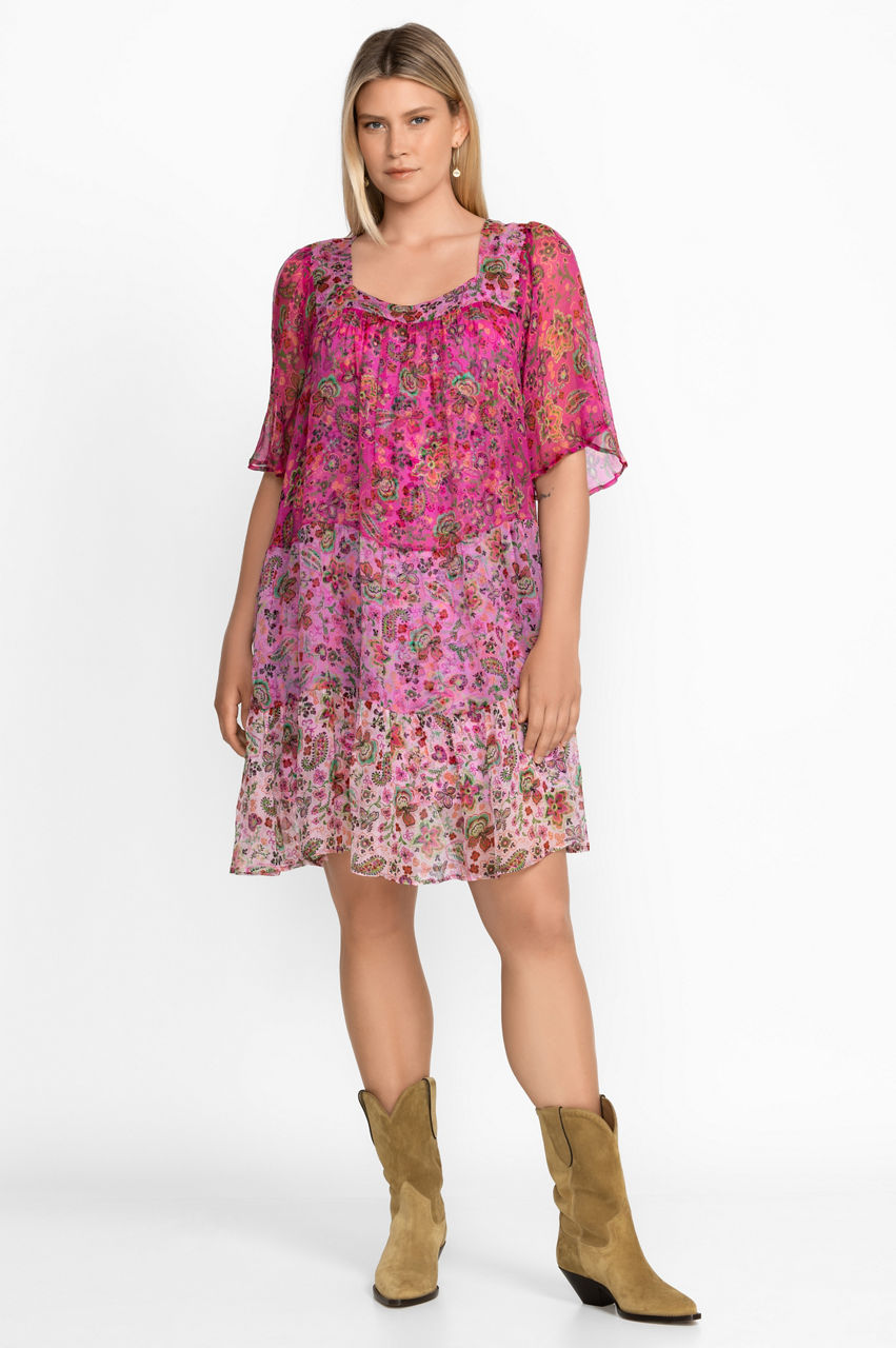 Dial up the femininity this season in the pretty Foxglove Silk Mini Dress. Brought to life through a pink color palette, this mini dress is spun from liquid-like silk and features a flattering square neck, short sleeves, a separate slip, and a tiered construction with fancy florals for a joyful finish. Pair this dress with simple accessories for a casual warm-weather day-to-night ensemble.