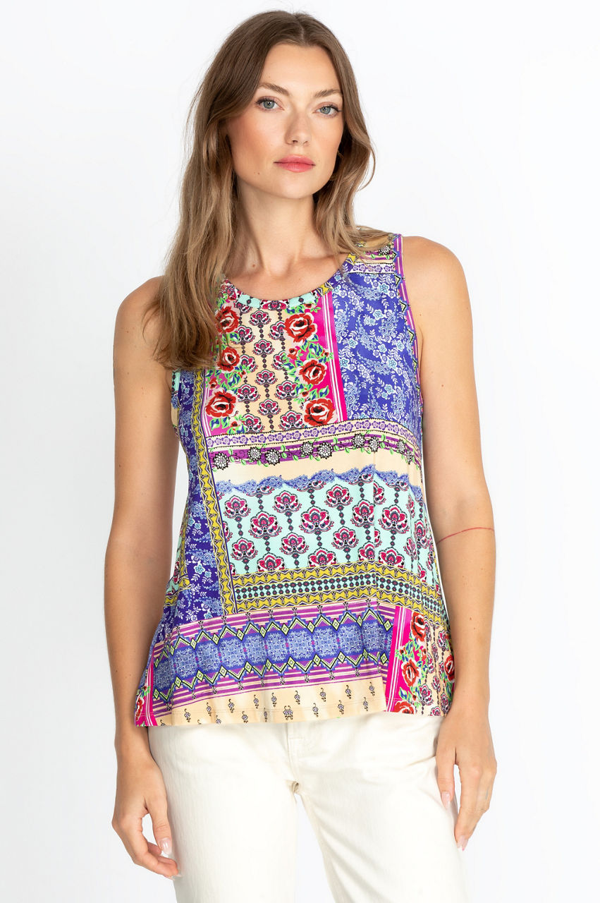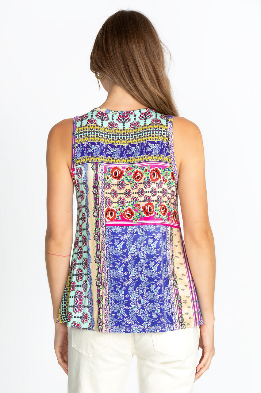 This elegant top combines a classic sleeveless cut with a print that mixes pops of color, geometrical shapes, and artisan-inspired motifs. It s an ideal piece for introducing some color and structure to your outfits by wearing it underneath a neutral blazer. The flowy cut also makes this tank top a great option for a casual outfit with some linen shorts.