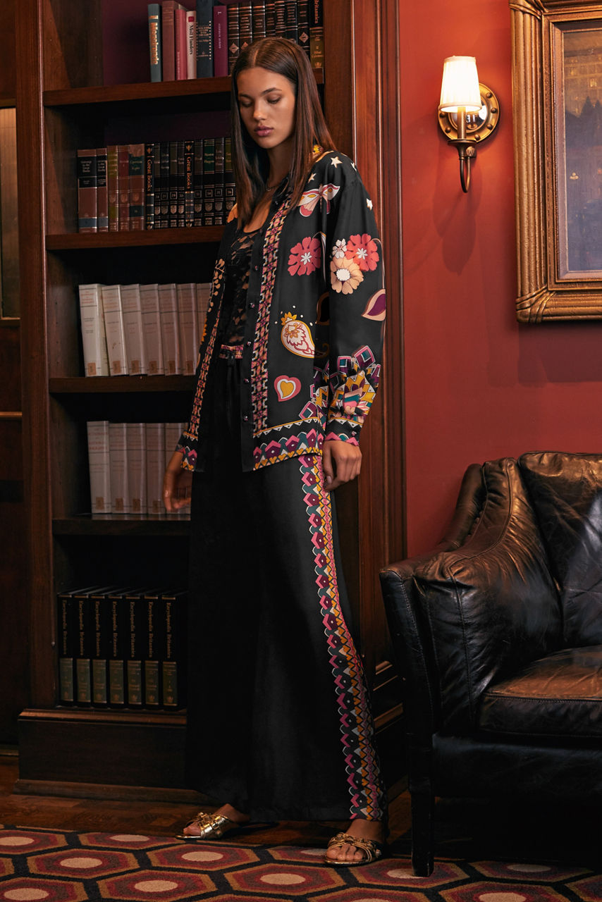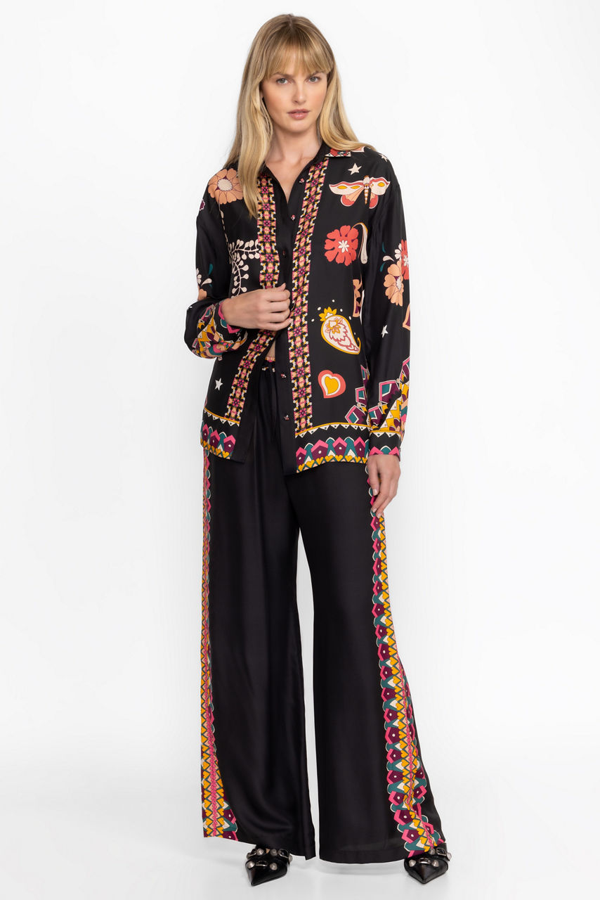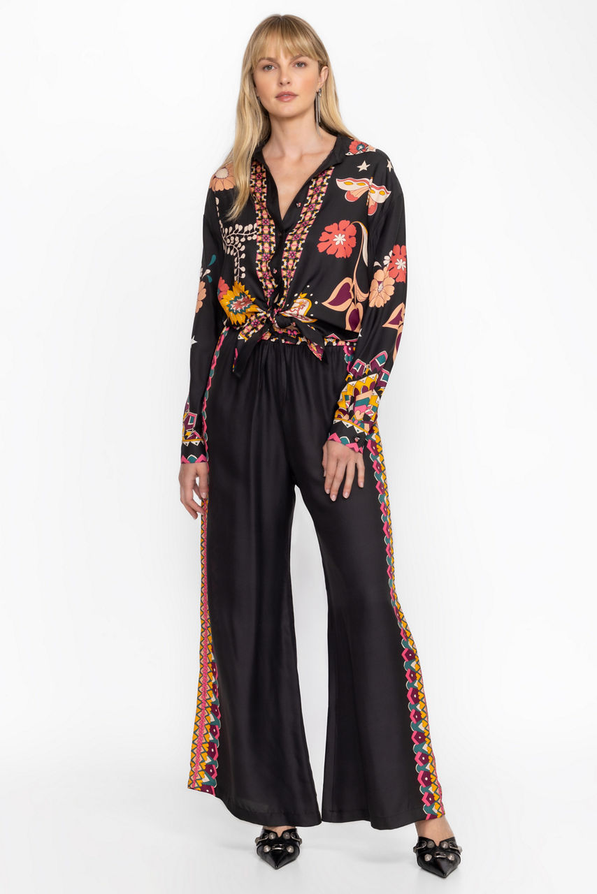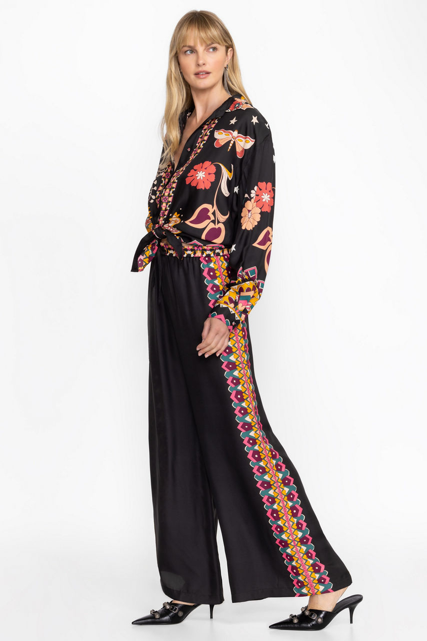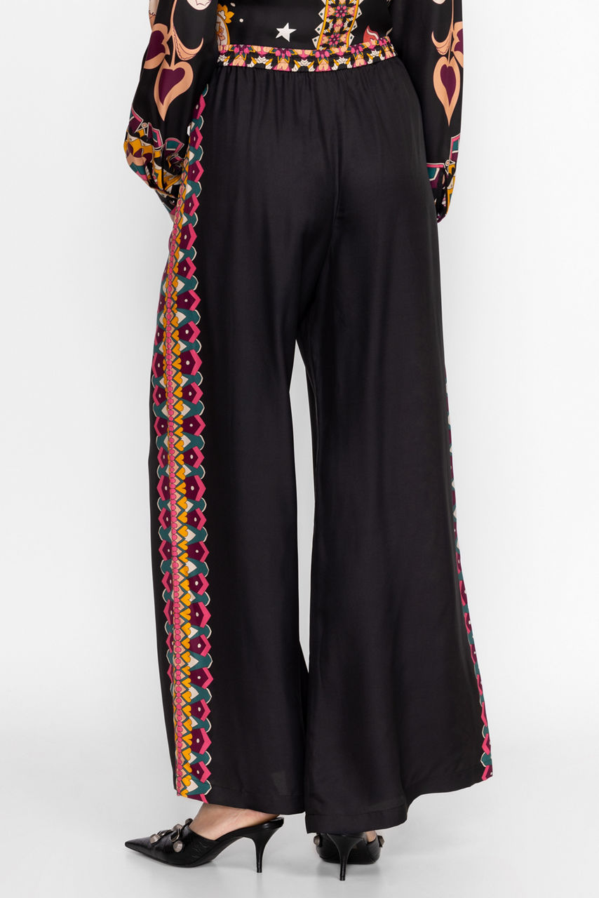 Crafted from a luxurious silk blend, the Frankie Easy Pants perfectly combine casual comfort and impeccable style. Featuring an elastic waist with a drawstring for a customizable fit, these wide-leg pants are embellished with a decorative print along the seams and waist. Pair with a bold top and wedge heels for a vibrant, resort-ready look.