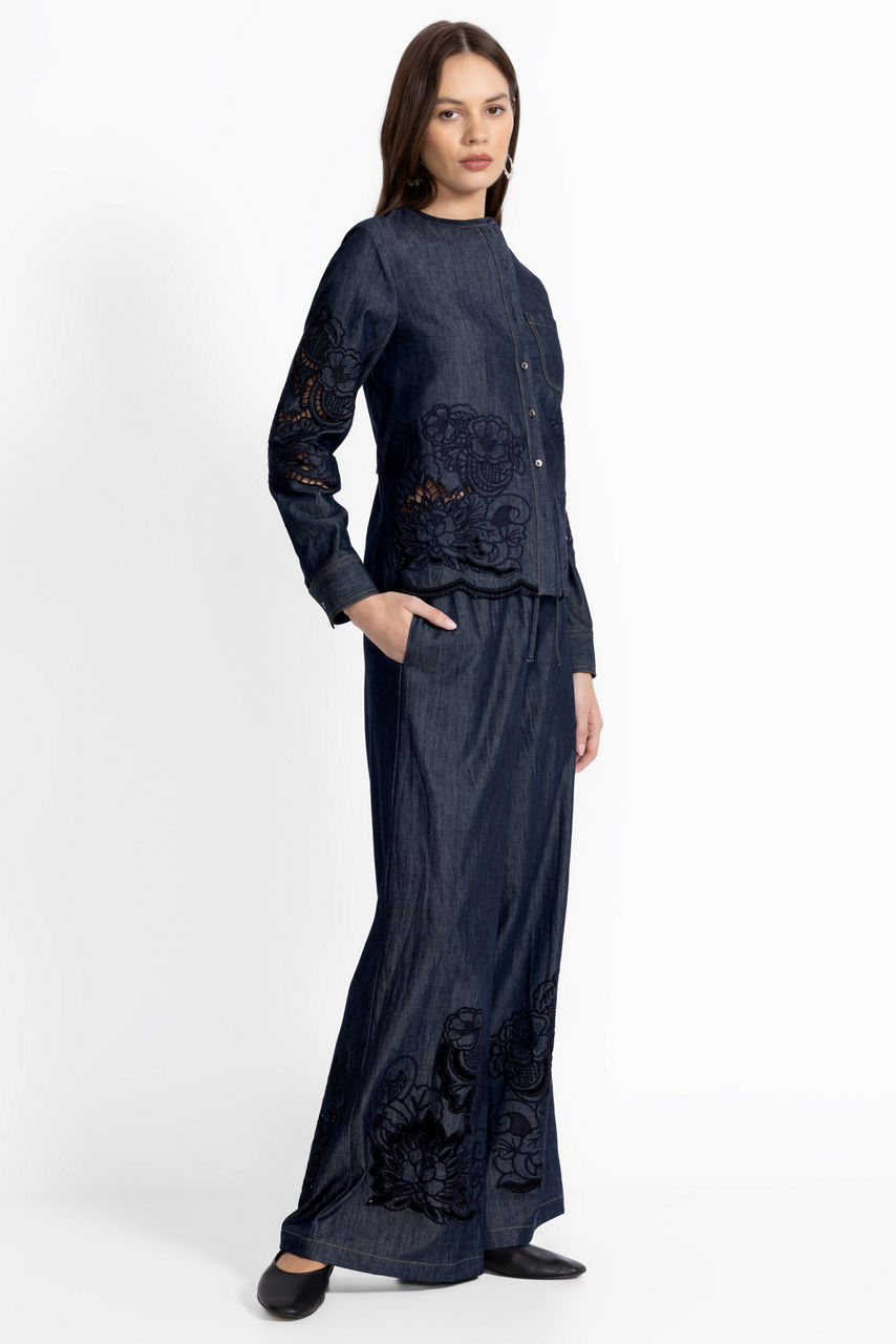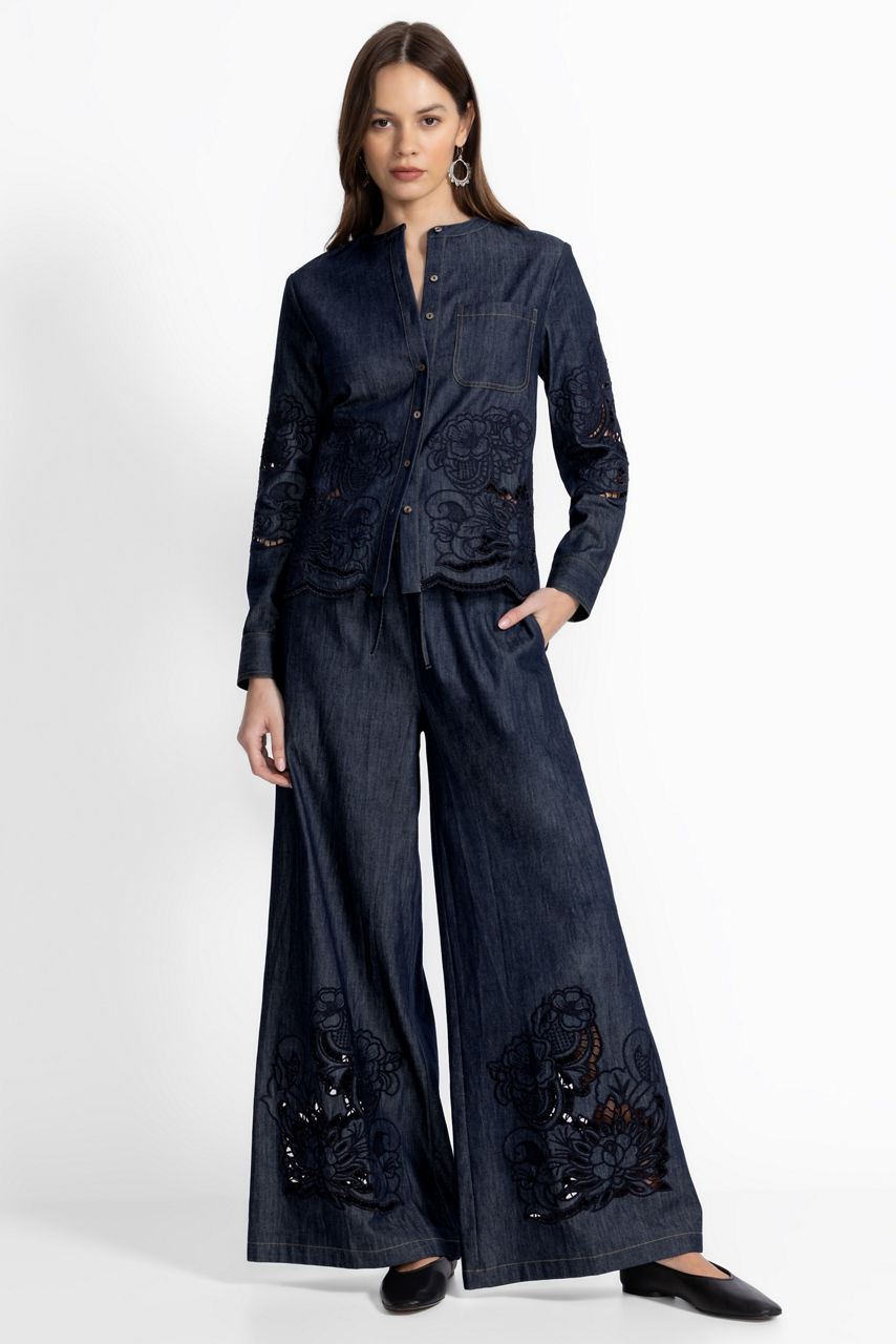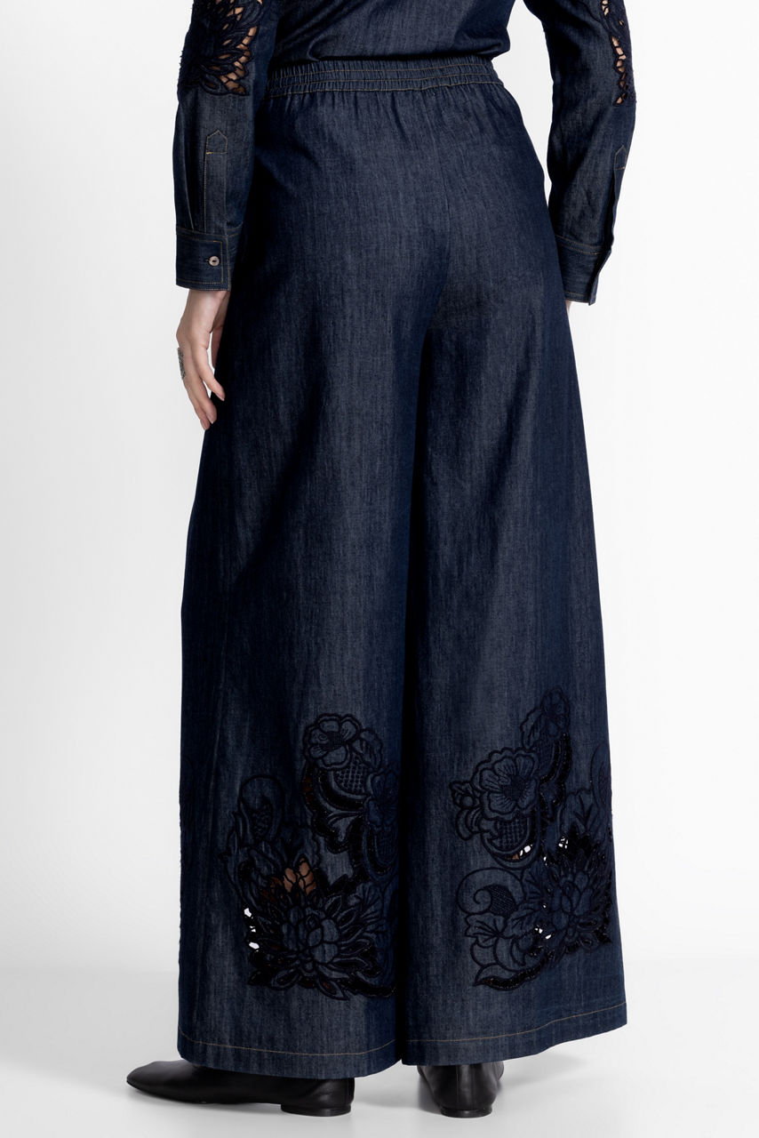 Crafted from a lightweight breathable blend, the Annaliese Frankie Easy Pants move as you move. Designed with an elastic waistband with a drawstring for a customizable fit, these shorts-lined pants are finished with intricate tone-on-tone embroidered details at the hemline. Pair with a silk cami and kitten heels for a resort-inspired look.