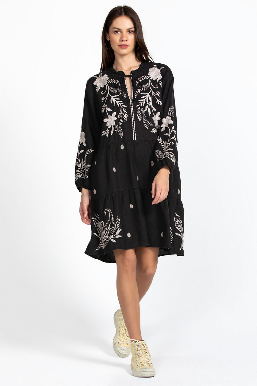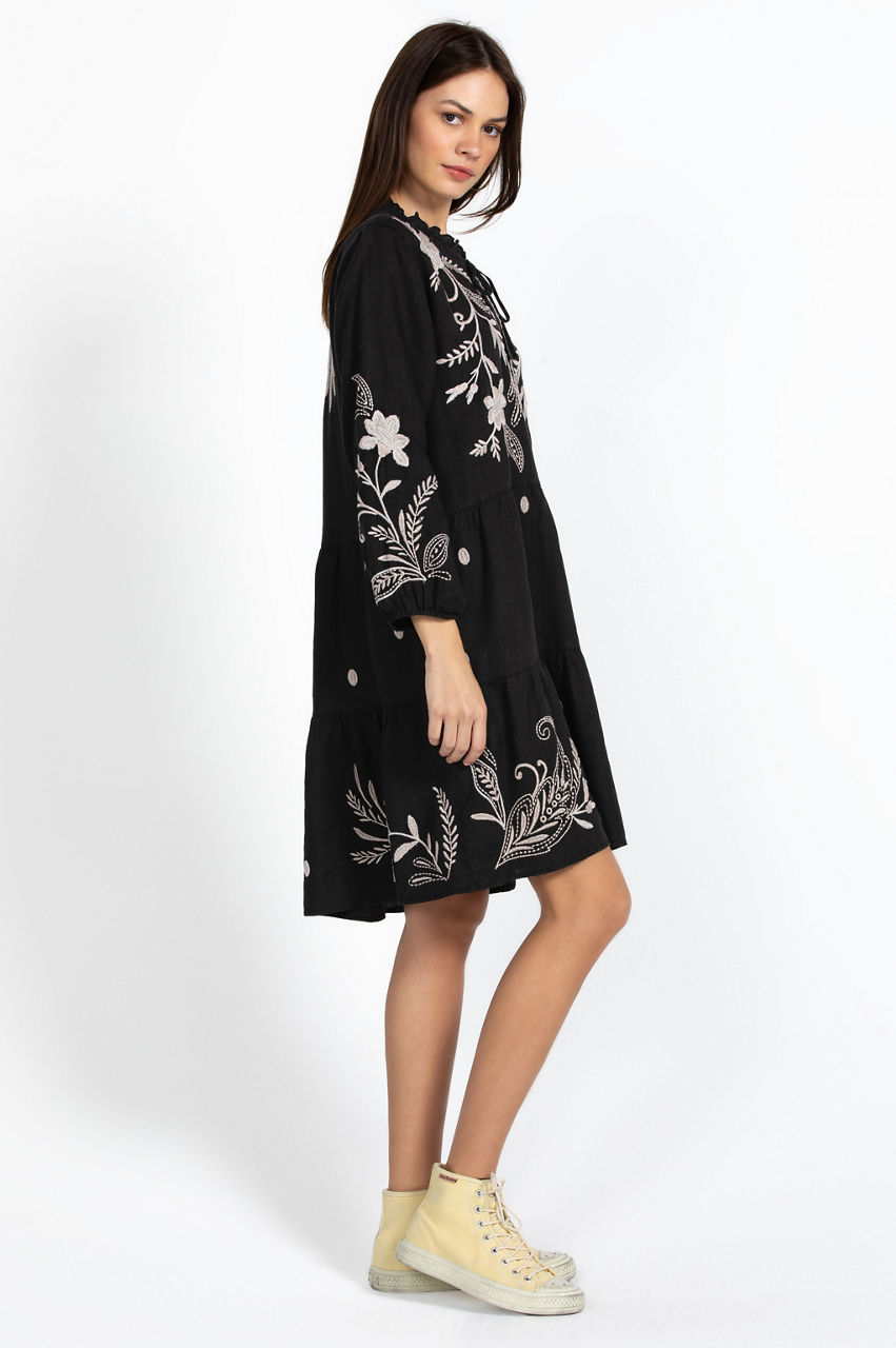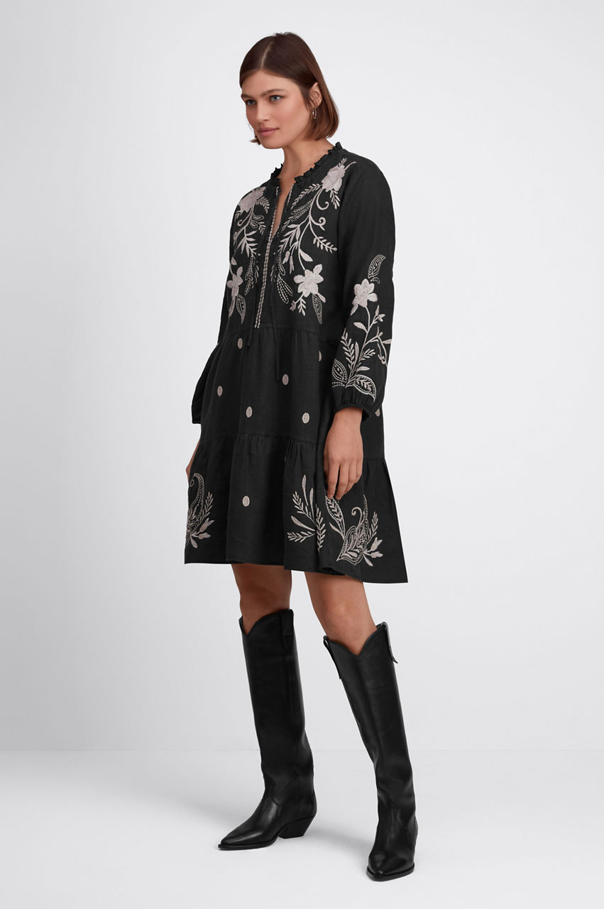 A classic bohemian style, the Frankie Tiered Field Dress lends an ethereal touch to your vacation wardrobe. Cut in a relaxed fit, this tiered dress is enhanced by a romantic floral placement embroidery and is crafted from pure linen - a practical and breathable choice for warmer weather. Finished with a tie neck and tiered hem, this dress is a chic option for sun-soaked locations and poolside lounging.