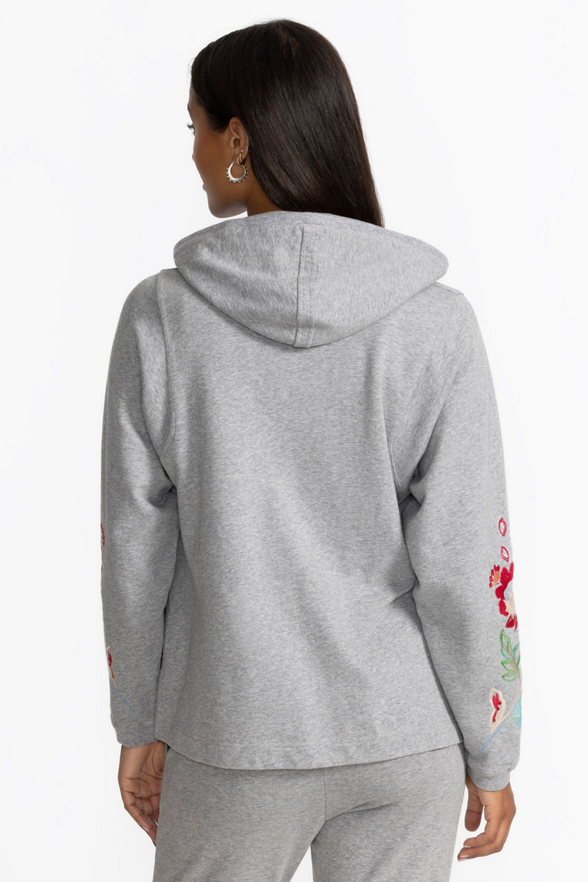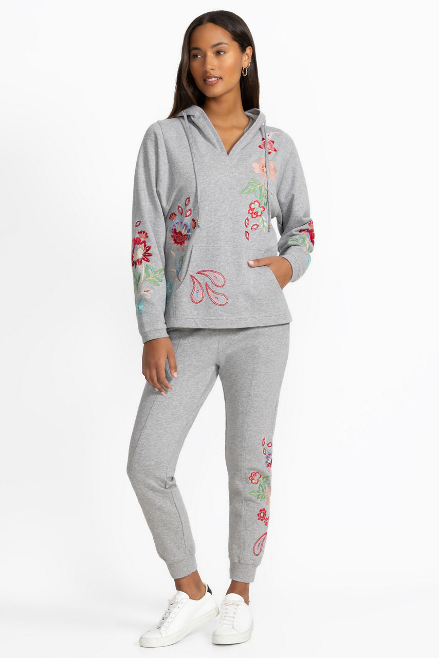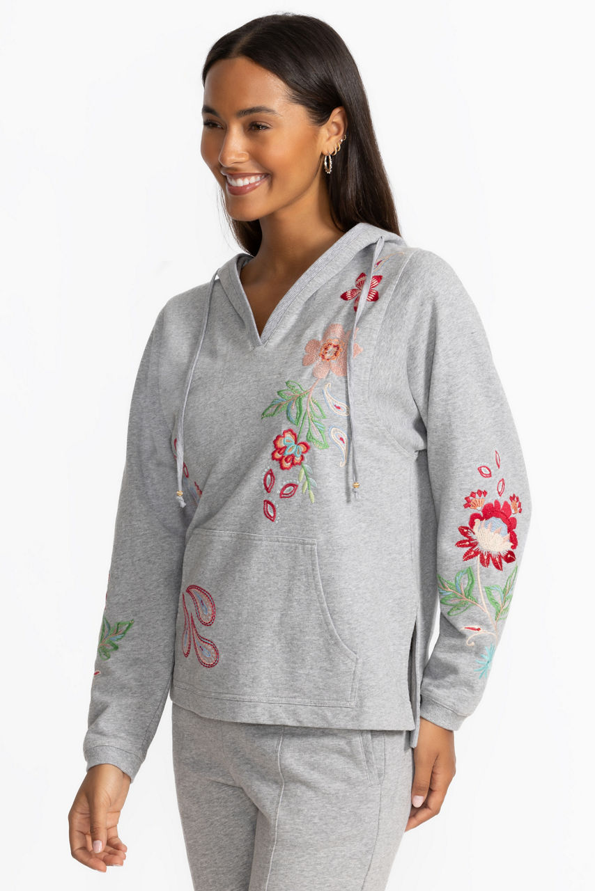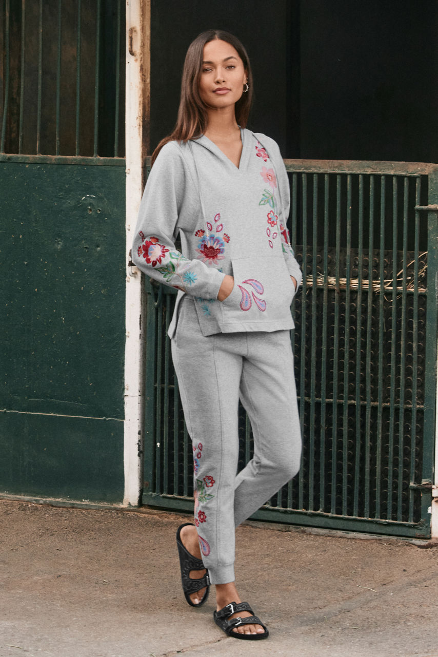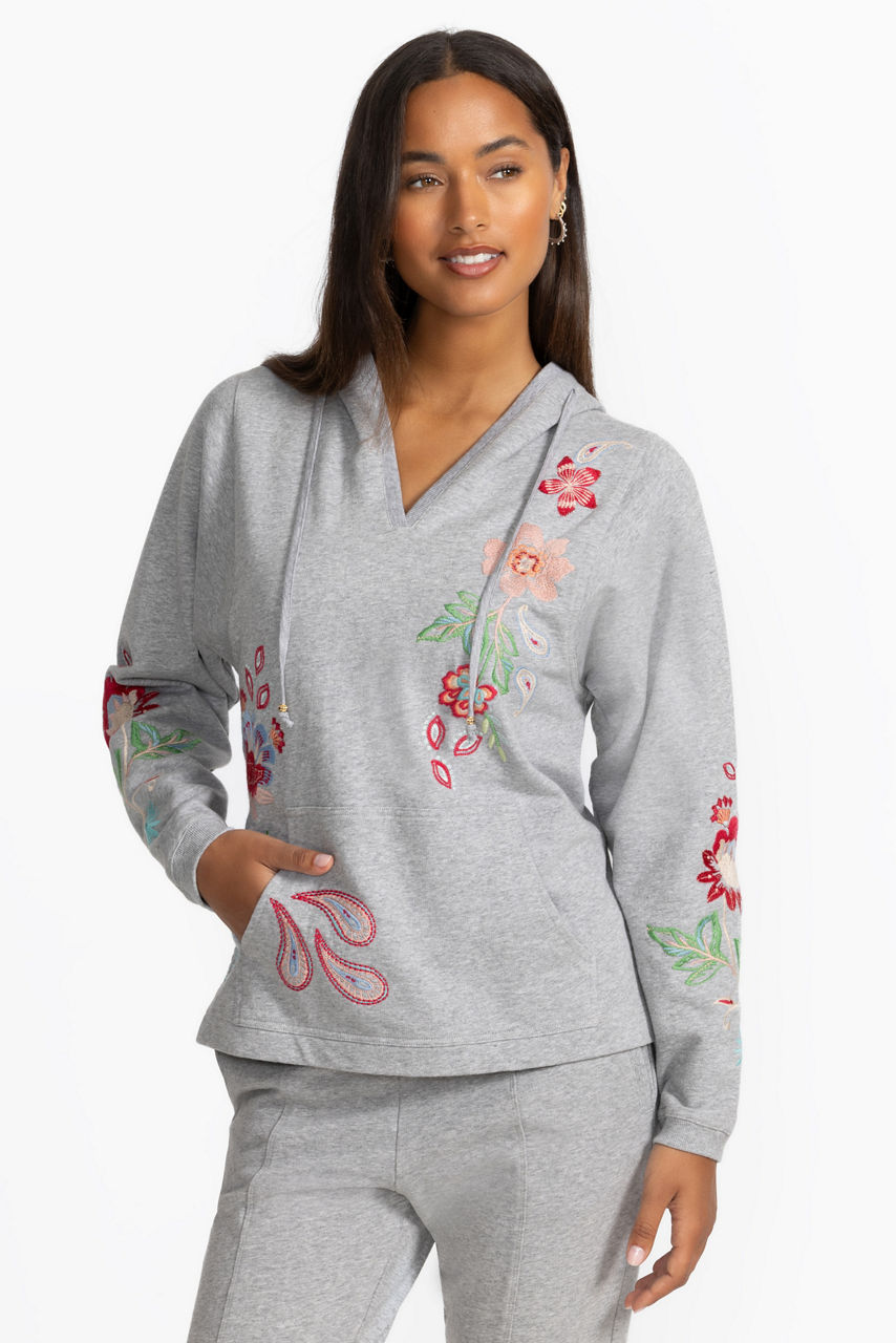 Cozy and colorful, the French Terry Hooded Sweatshirt is adorned with bold floral embroidered detailing. Crafted from 100% breathable cotton, this sweatshirt features a split V-neckline with an attached hood and is finished on the front with Kanga pouch pockets. Pair with fitted denim and trendy ankle boots for a fresh weekend vibe.