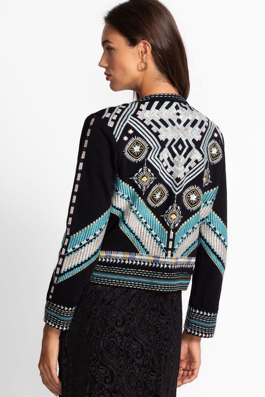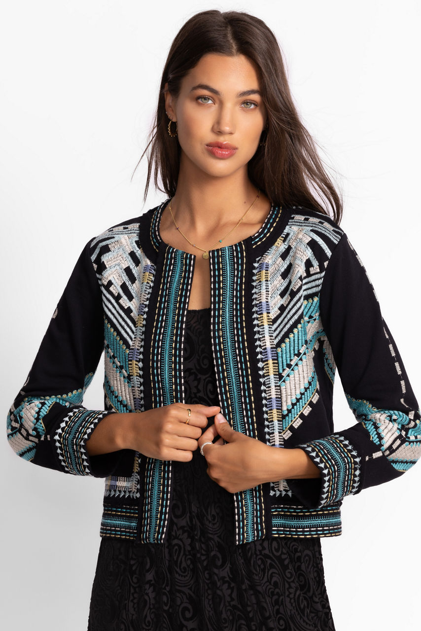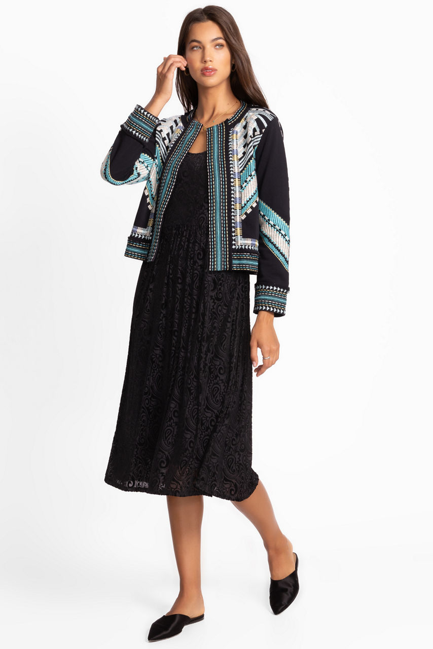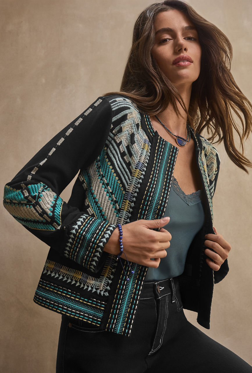 The Oliver French Terry Mixed Media Jacket is crafted from breathable 100% cotton. Thoughtfully designed with a curved neckline and an open front, this bold jacket is finished with intricate embroidered detailing and vibrant color. Layer over a bright silk cami and pair with classic trousers for an elevated casual look.