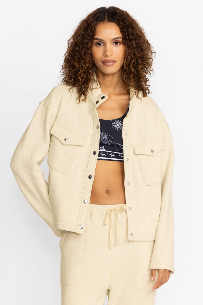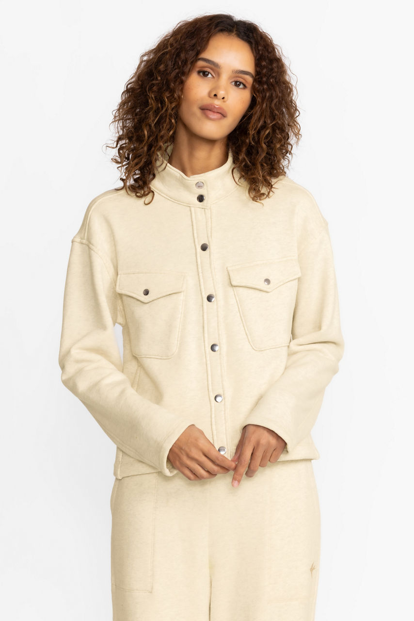 Offering a stylish way to stay warm in the cooler season, the French Terry Mock Neck Shacket delivers a modern take on staple outerwear. Crafted from a cozy cotton blend, this unique jacket features welt pockets, large front patch pockets and fastens with an easy snap front. Pair with wide leg denim and ankle booties for a seasonal win.